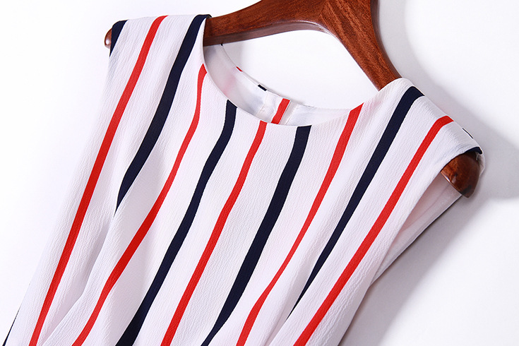 2015女装夏季新款无袖圆领束腰纽扣修身系带条纹显瘦连衣裙