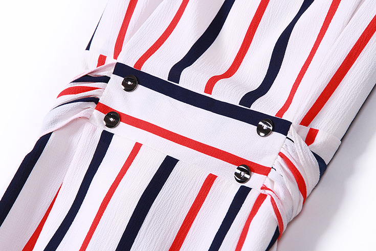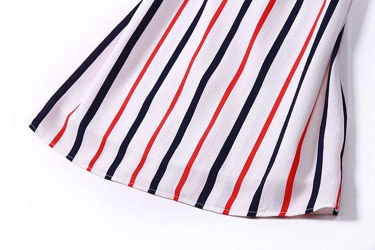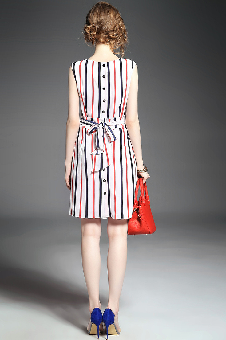 > 2015女装夏季新款无袖圆领束腰纽扣修身系带条纹显瘦连衣裙