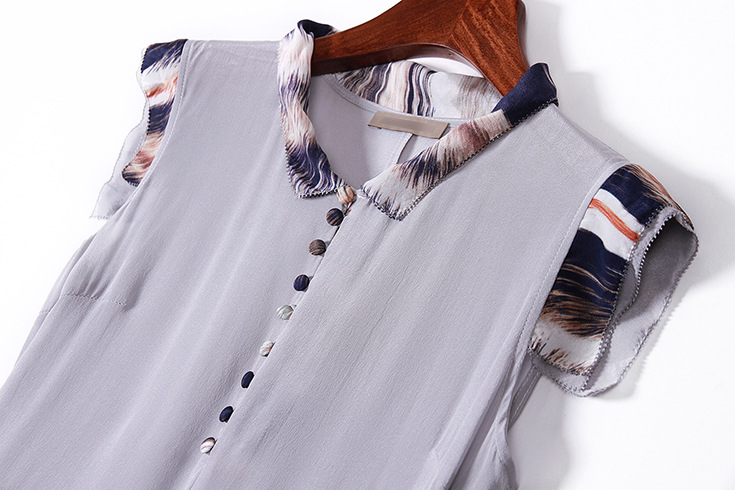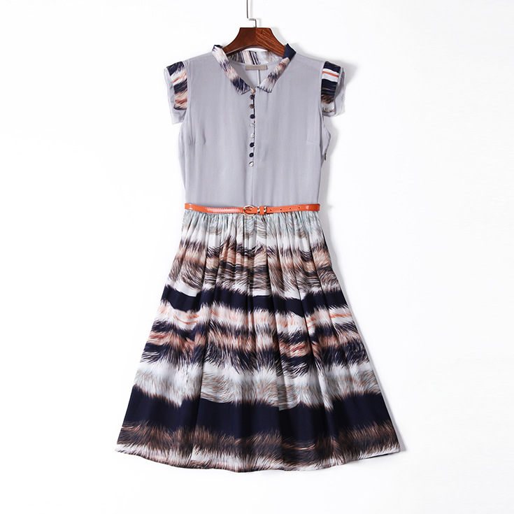 2015夏季女装新款 立领无袖印花拼接修身真丝大摆a字中长连衣裙