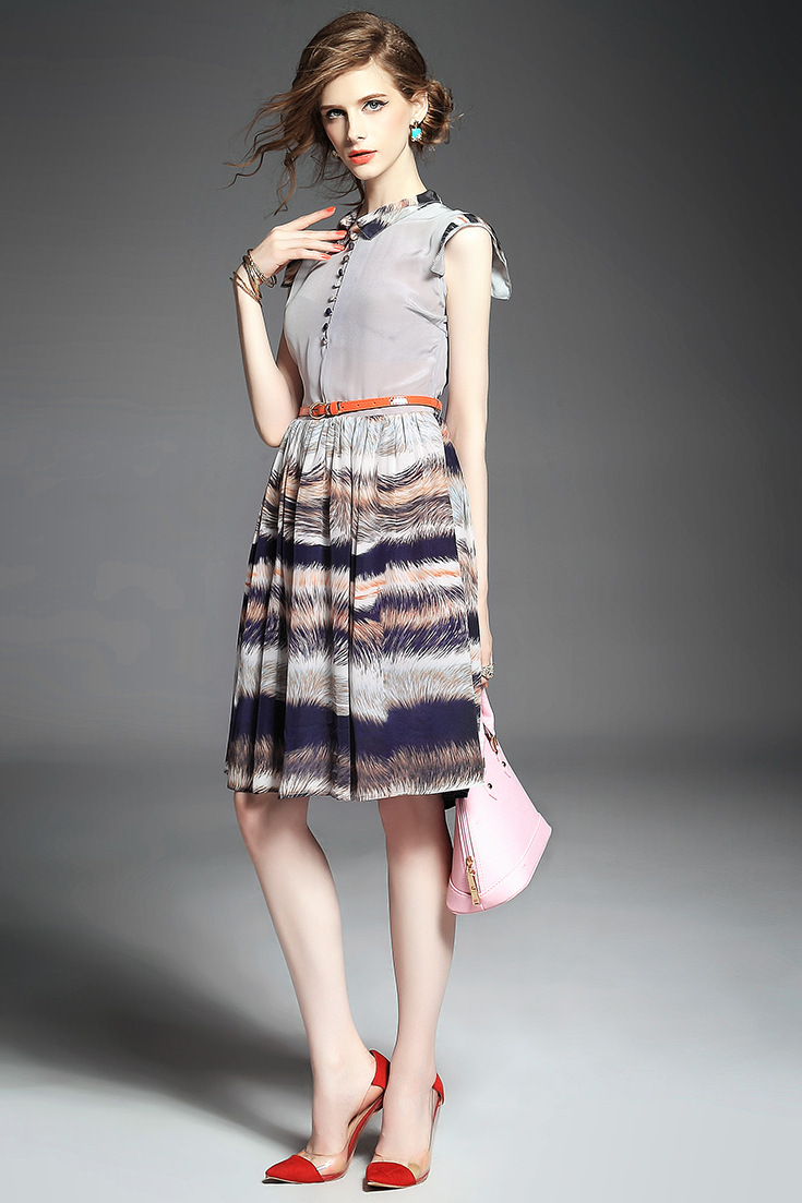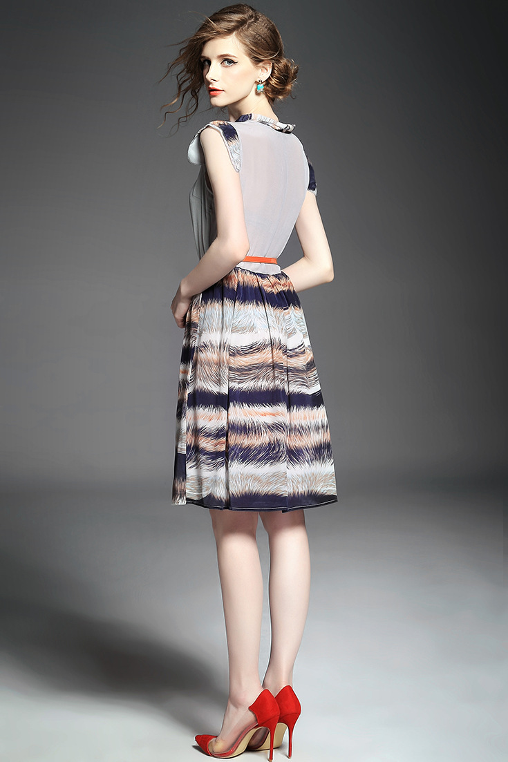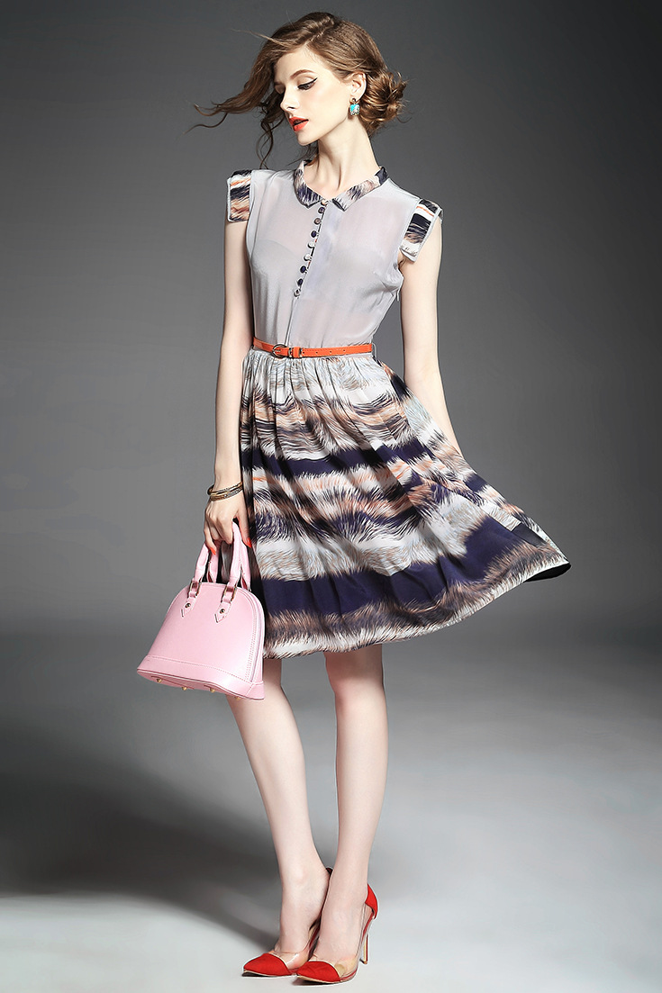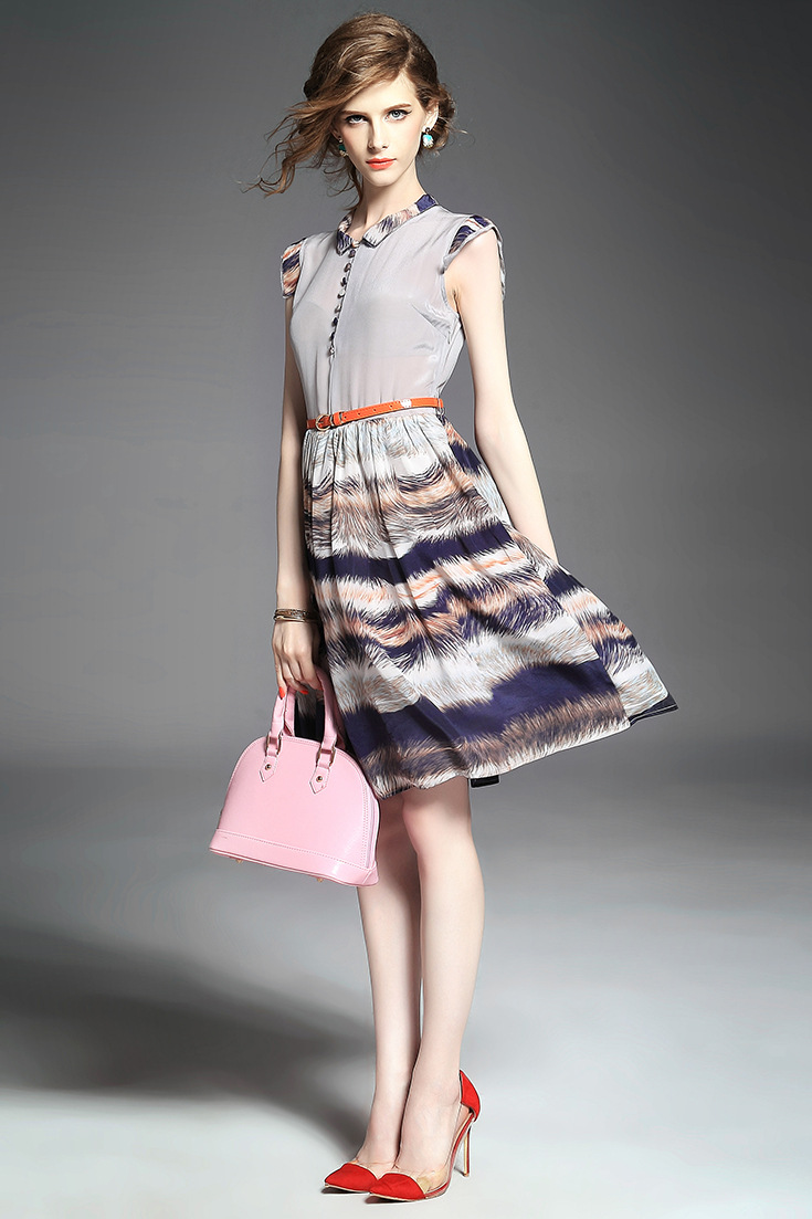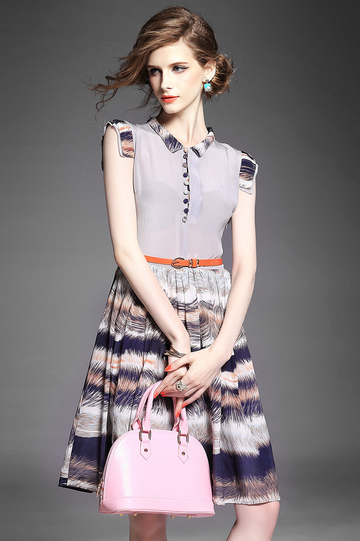 > 2015夏季女装新款 立领无袖印花拼接修身真丝大摆a字中长连衣裙