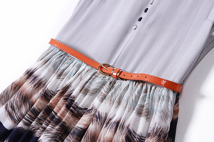 2015春夏季新款欧美风印花真丝连衣裙七分袖衬衣领时尚A字裙