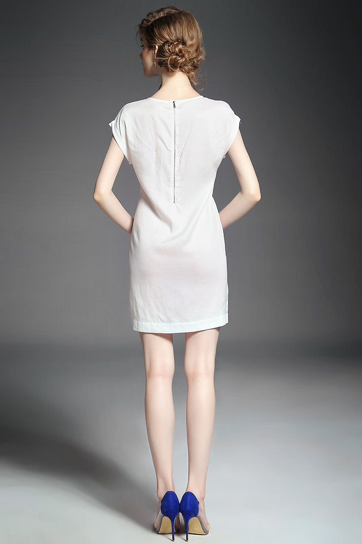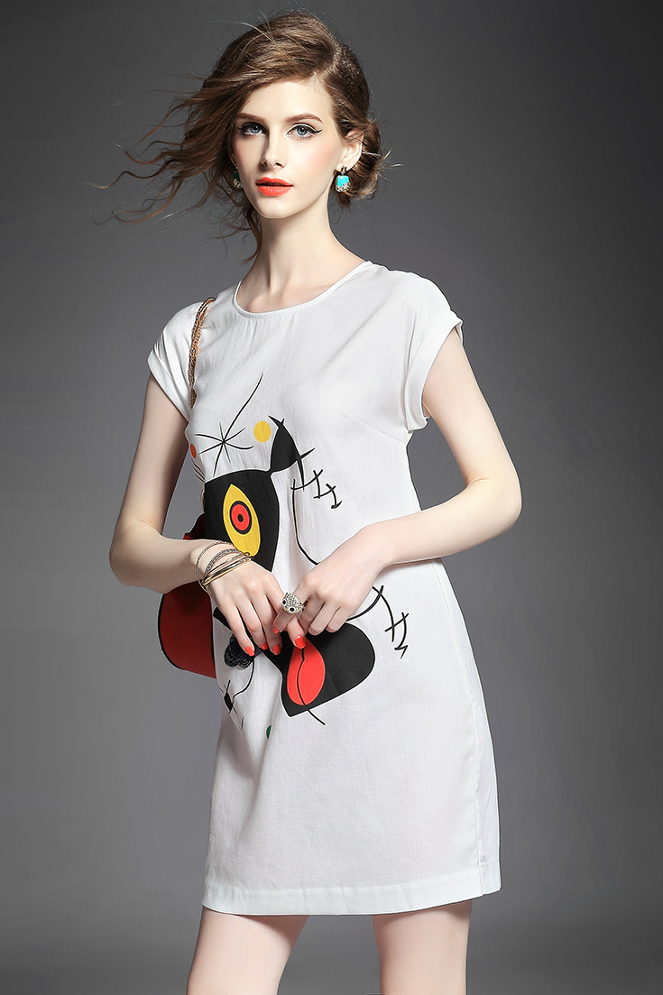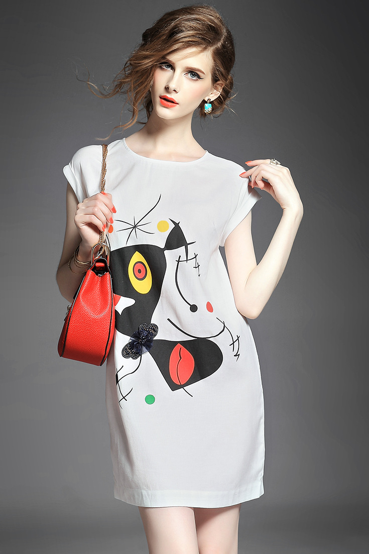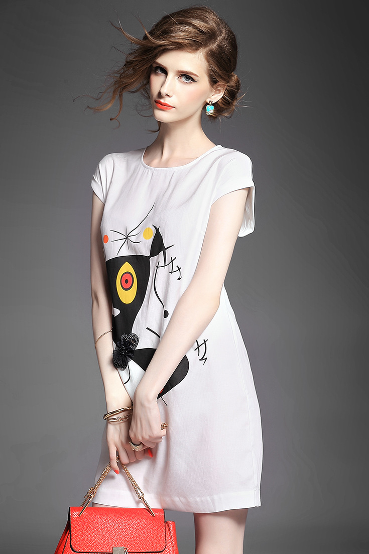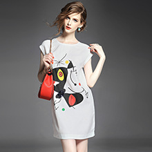 > 2015夏季新款女装欧美时尚圆领趣味印花拼贴钉珠蝴蝶结修身一步裙