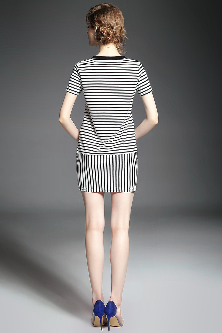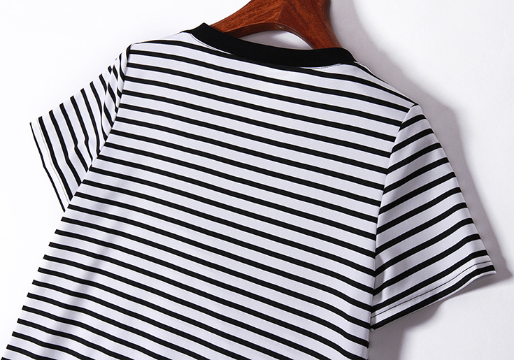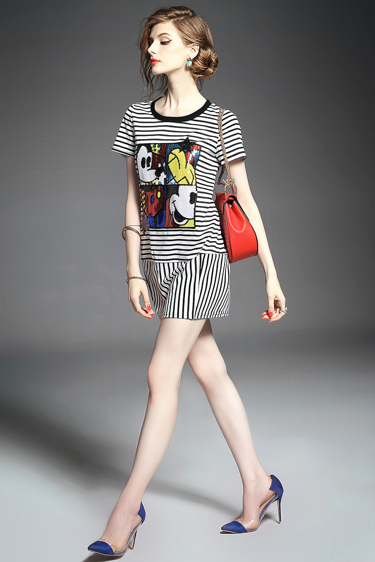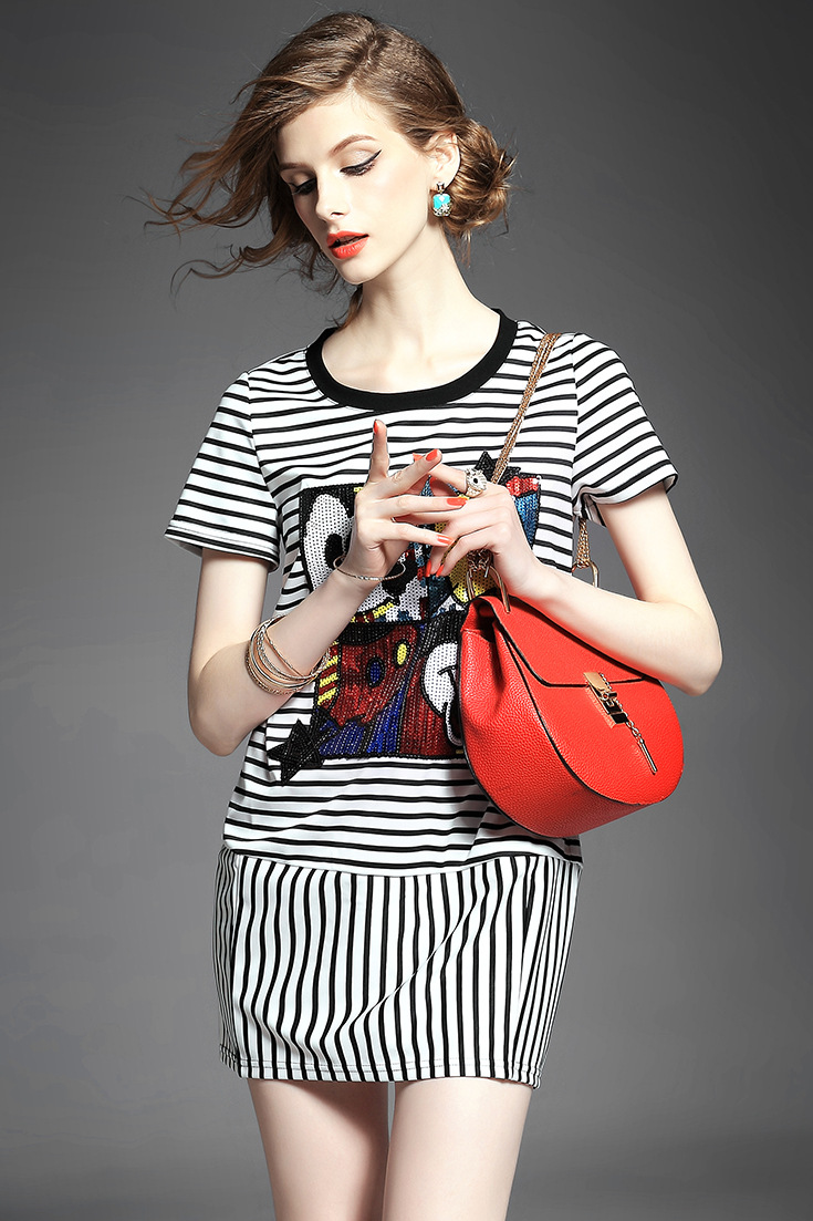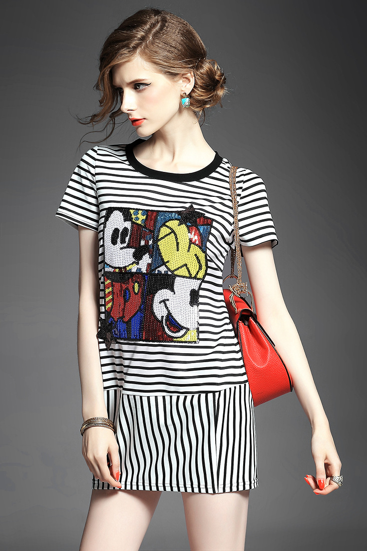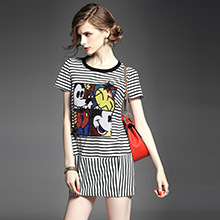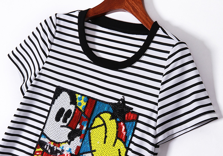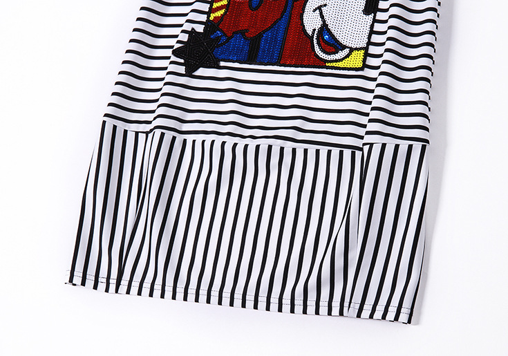 > 2015夏季女装 欧美时尚圆领短袖米奇亮片绣花条纹修身显瘦短裙子