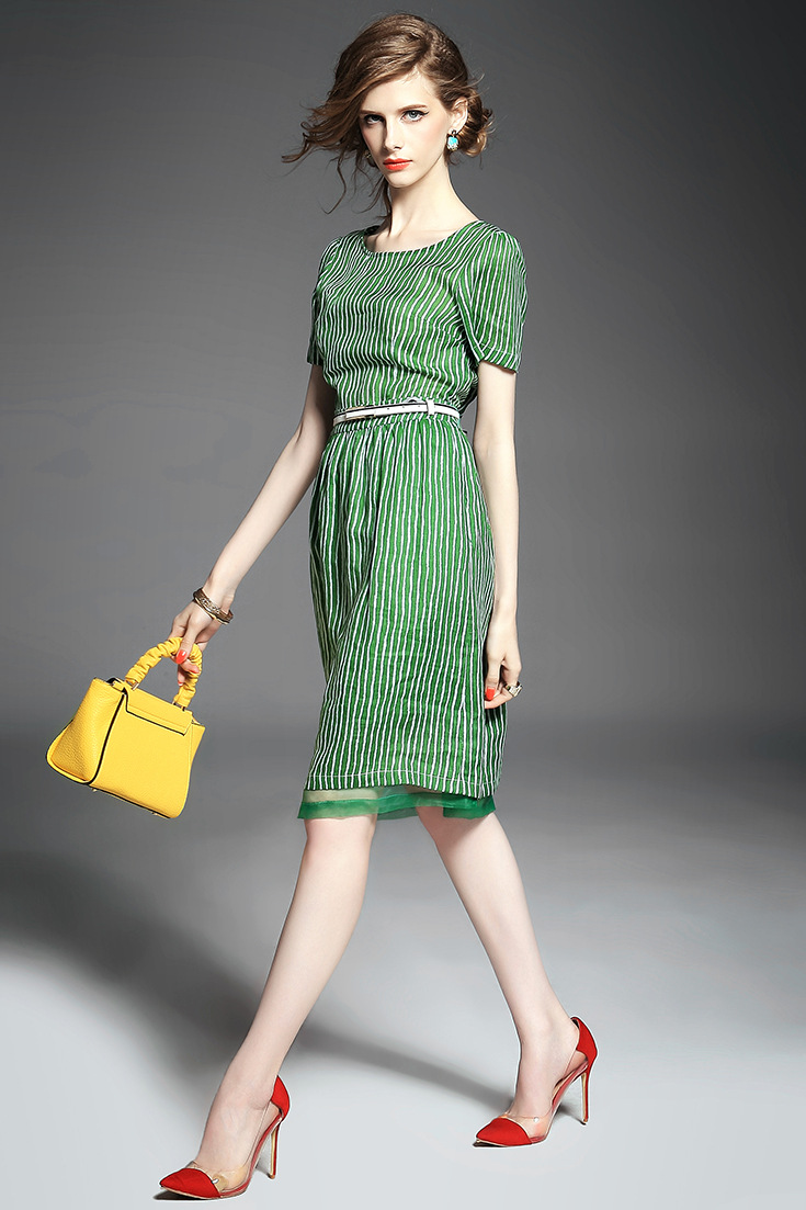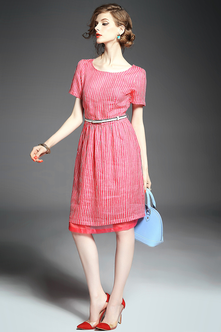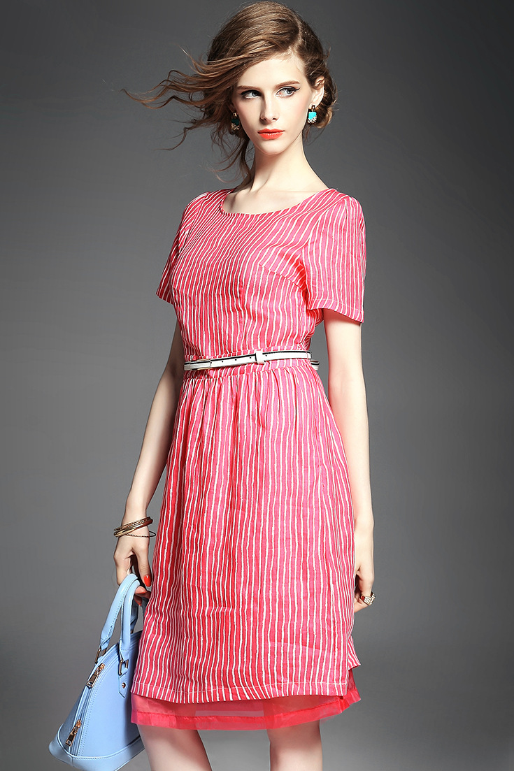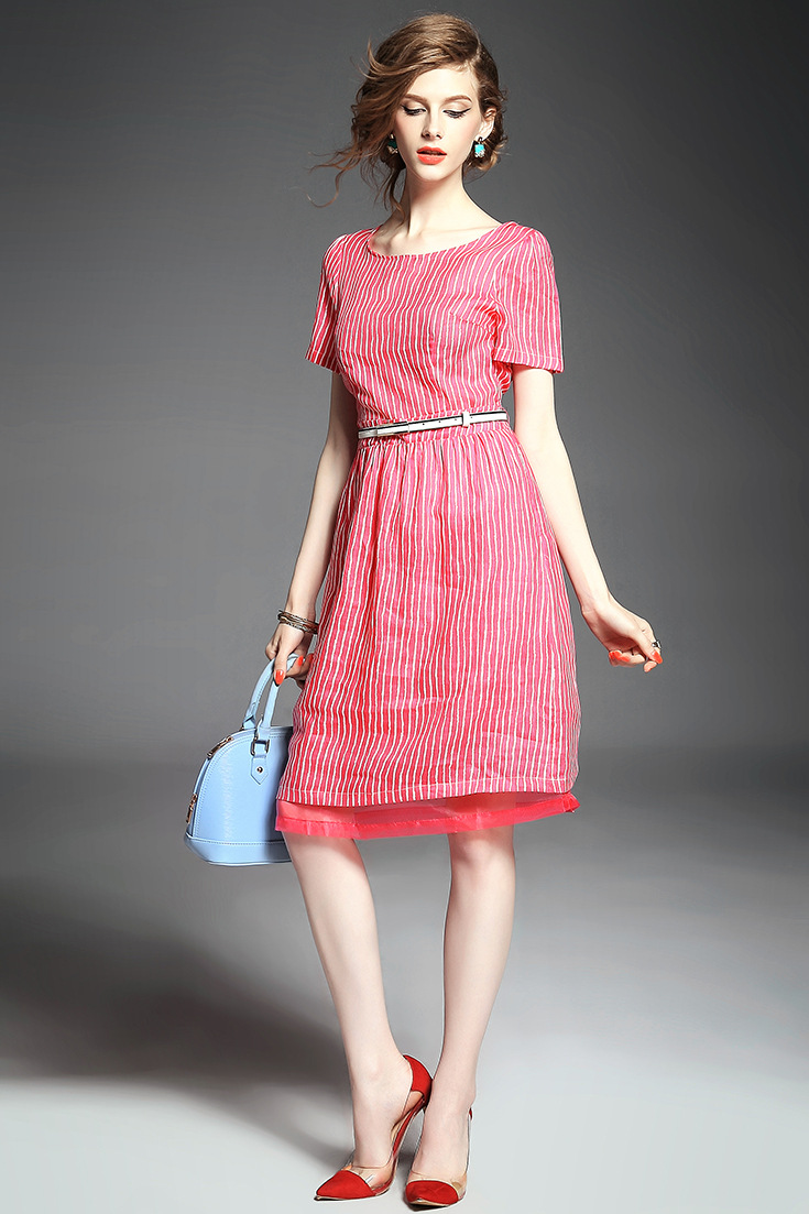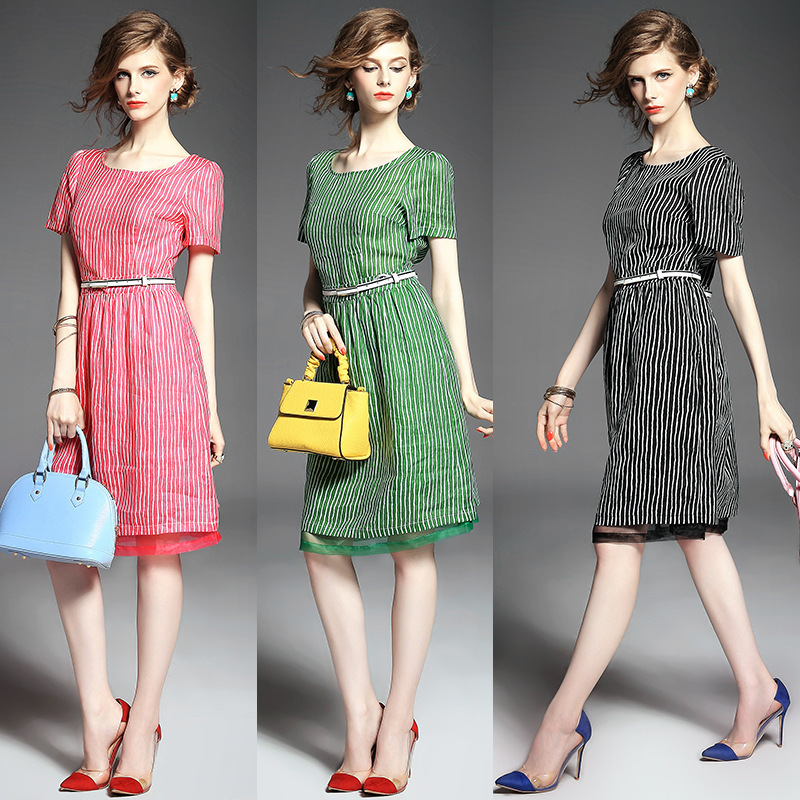 2015夏季新款气质淑女圆领竖条纹柯根纱拼接修身显瘦连衣裙送腰带
