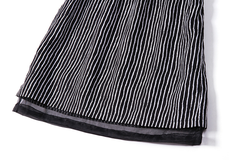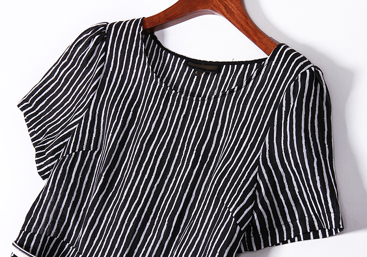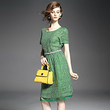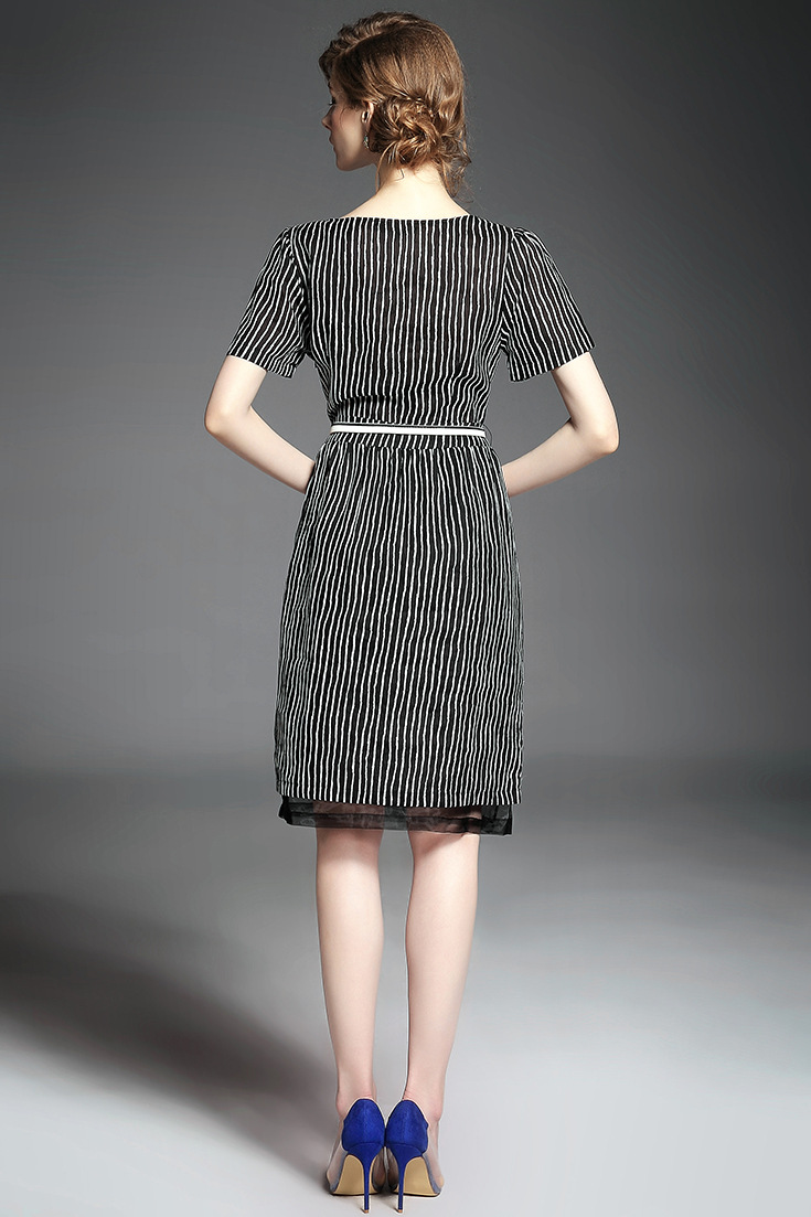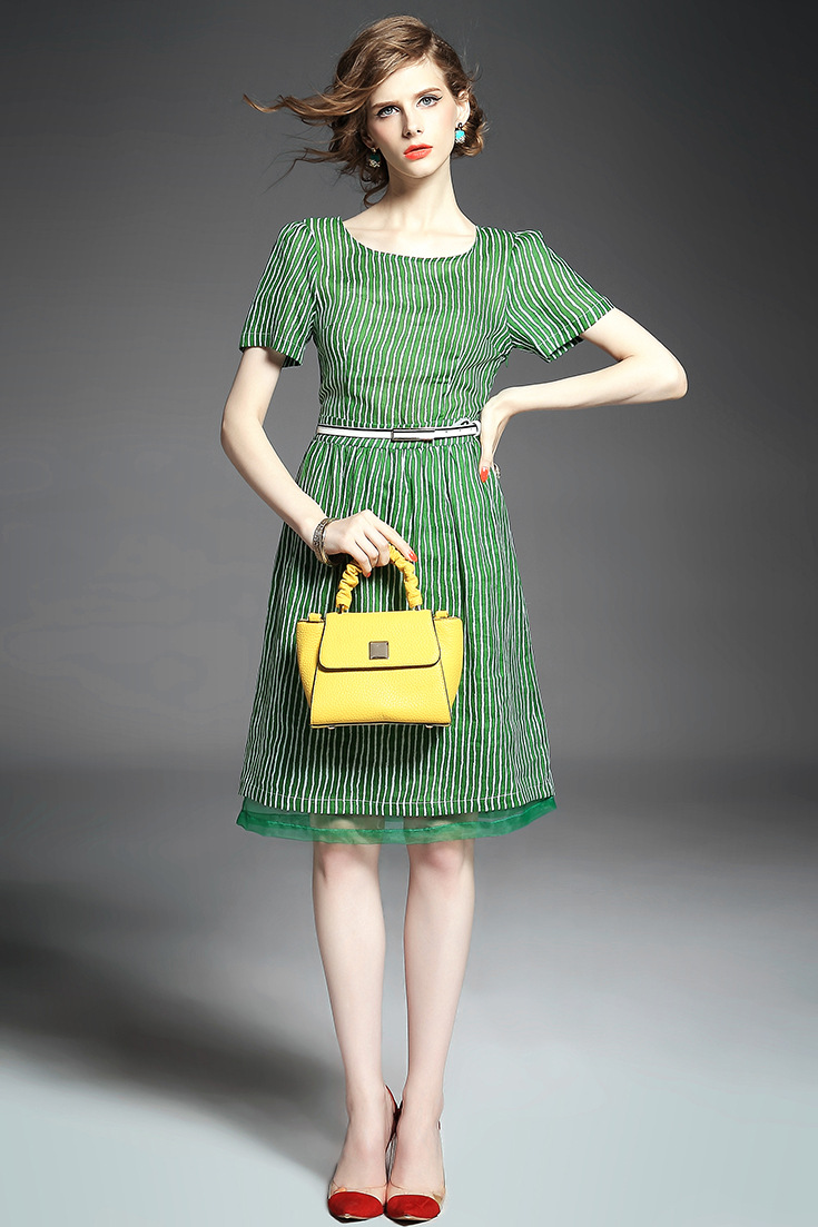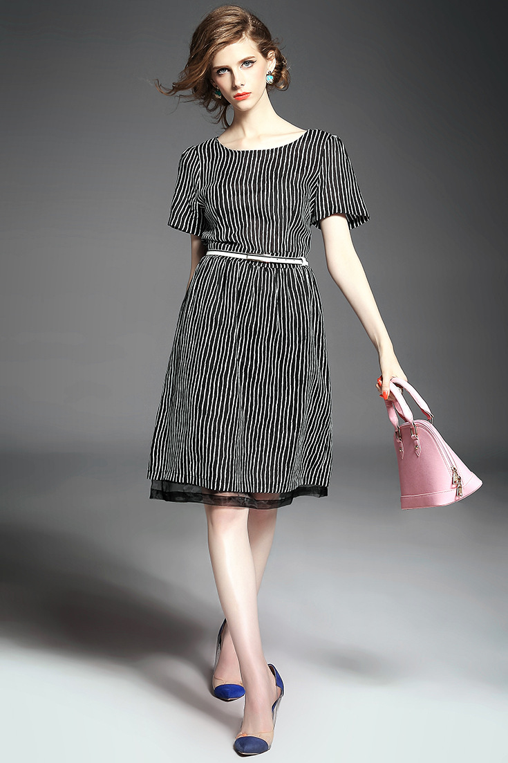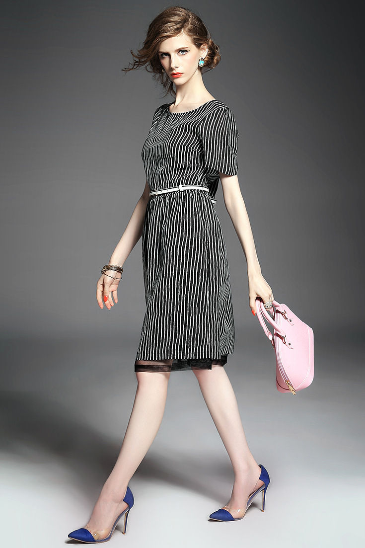 > 2015夏季新款气质淑女圆领竖条纹柯根纱拼接修身显瘦连衣裙送腰带