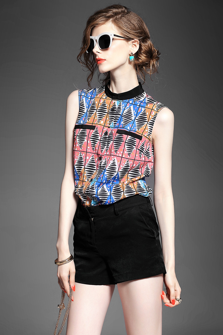 > 2015夏季新款 立领印花单排扣无袖衬衣+纯麻阔腿短裤套装