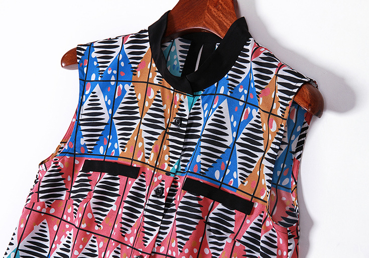 2015夏季新款 立领印花单排扣无袖衬衣+纯麻阔腿短裤套装