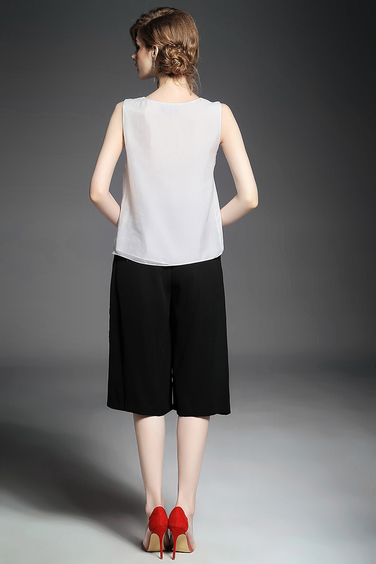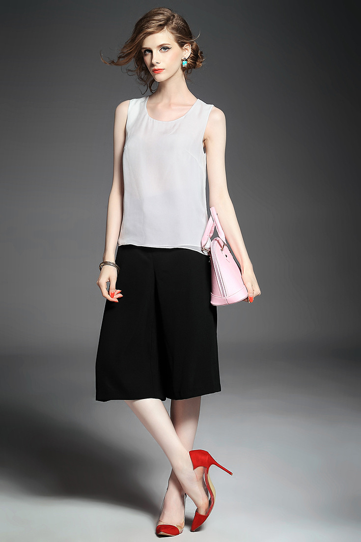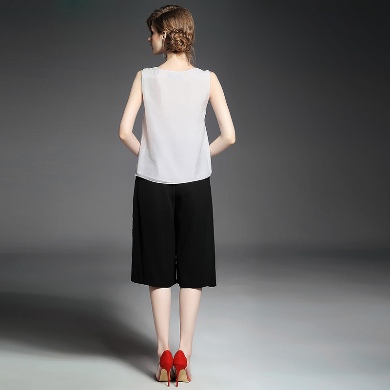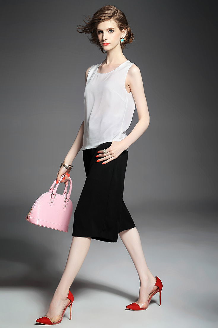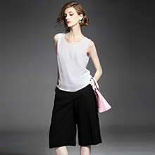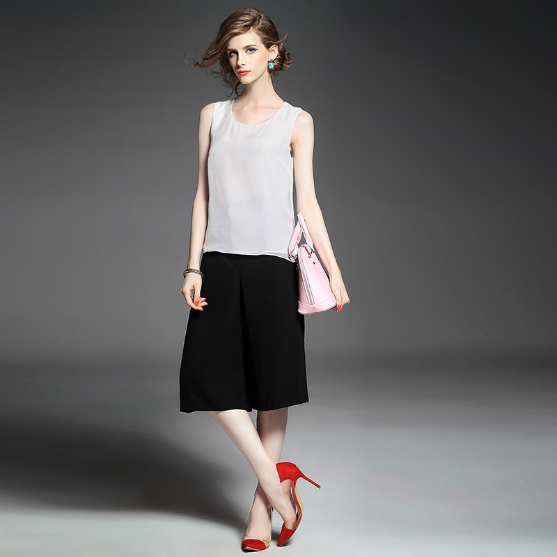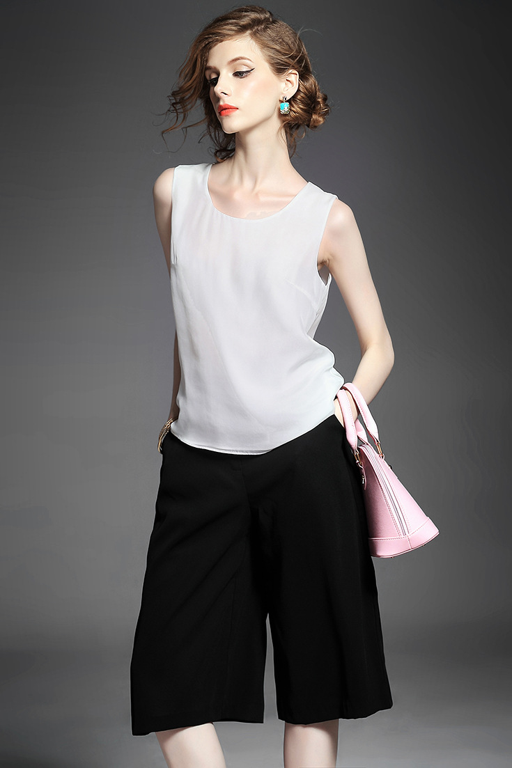 > 2015夏季女装 欧美大牌纯色无袖真丝上衣+宽松阔腿裤七分裤套装