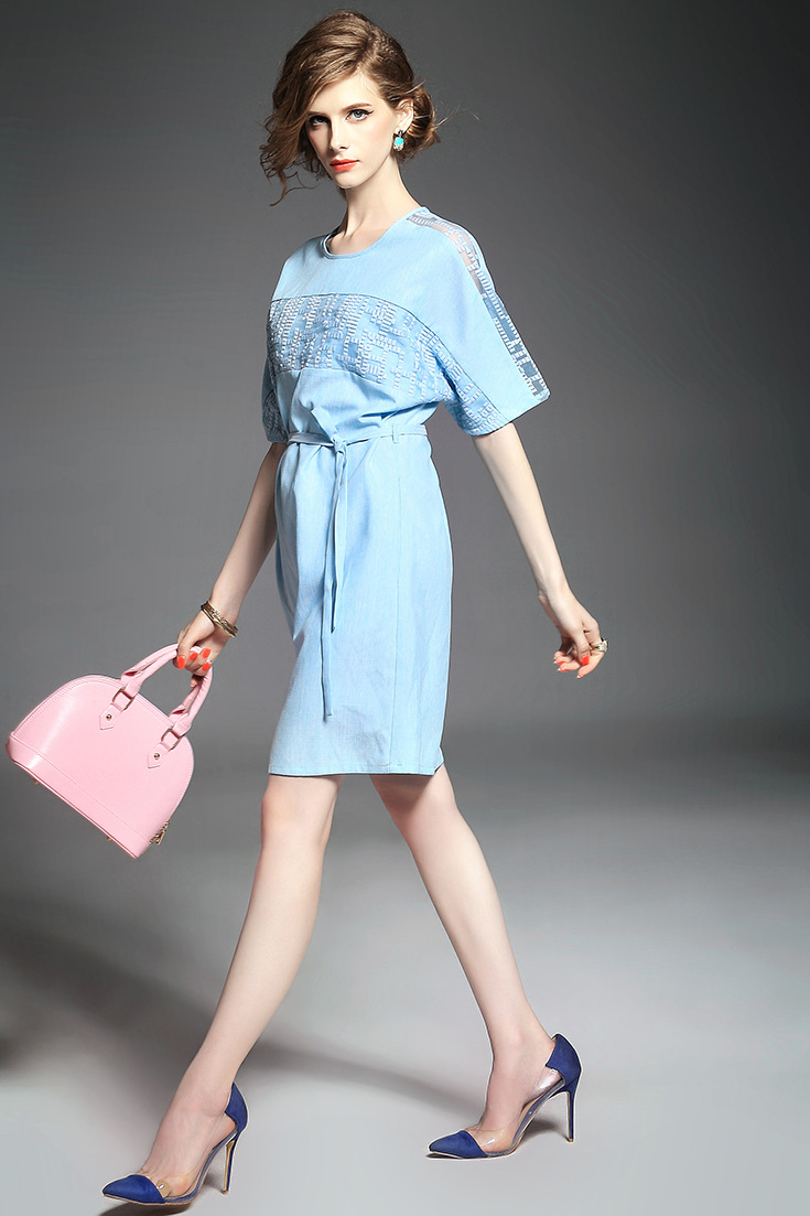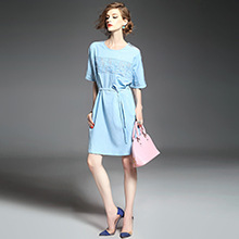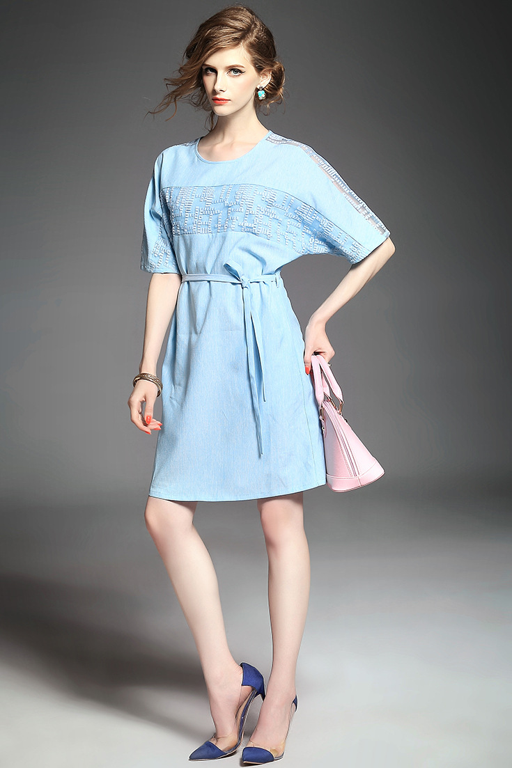 > 2015夏 欧美大牌重工刺绣宽松套头系带纯色连衣裙品质女装