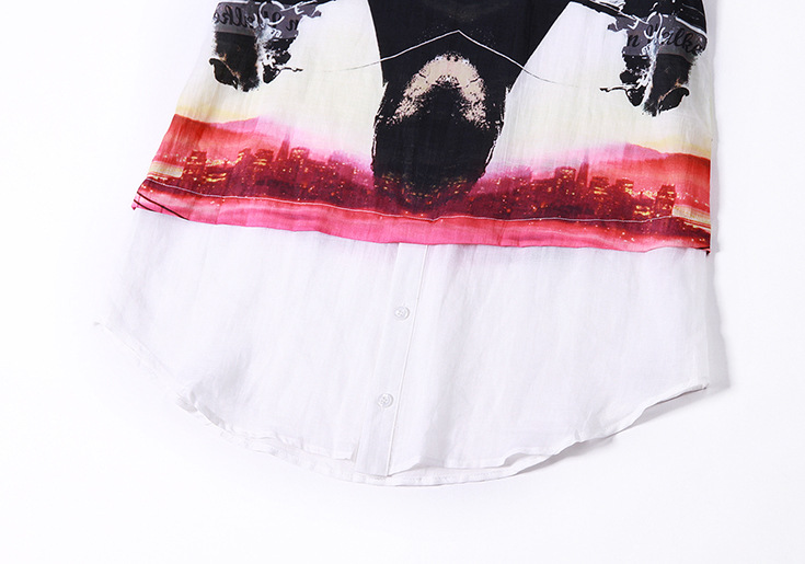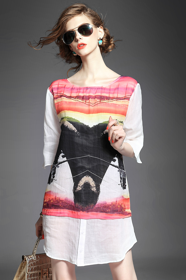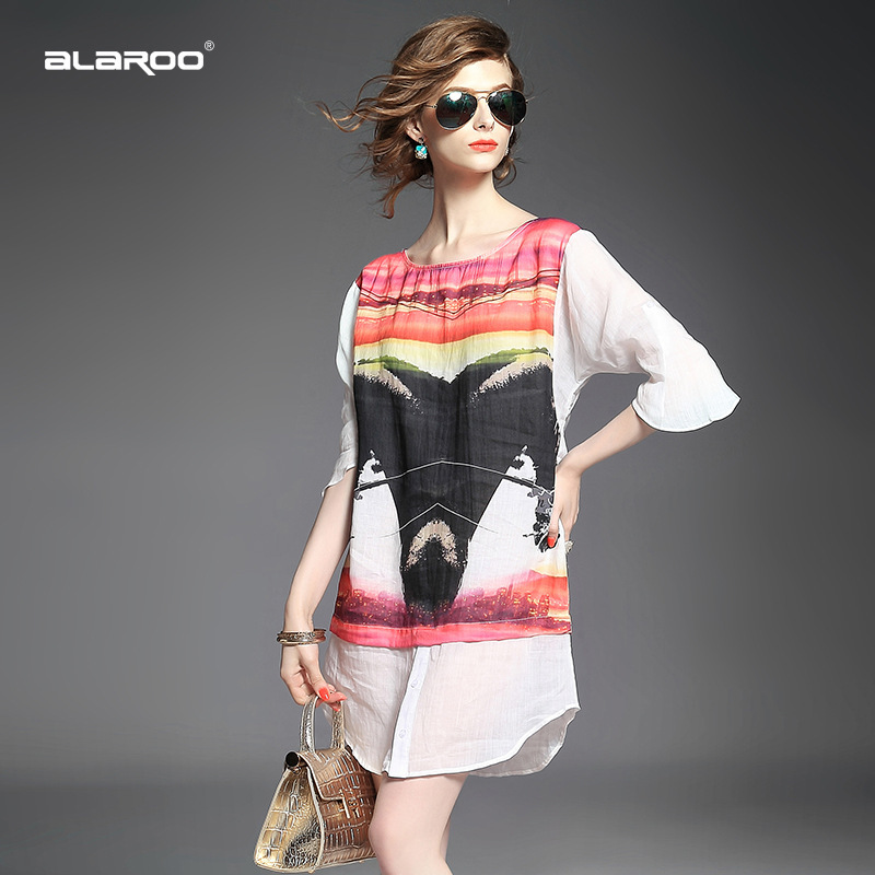 2015春夏季新款欧美风印花真丝连衣裙七分袖衬衣领时尚A字裙