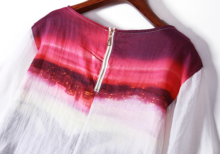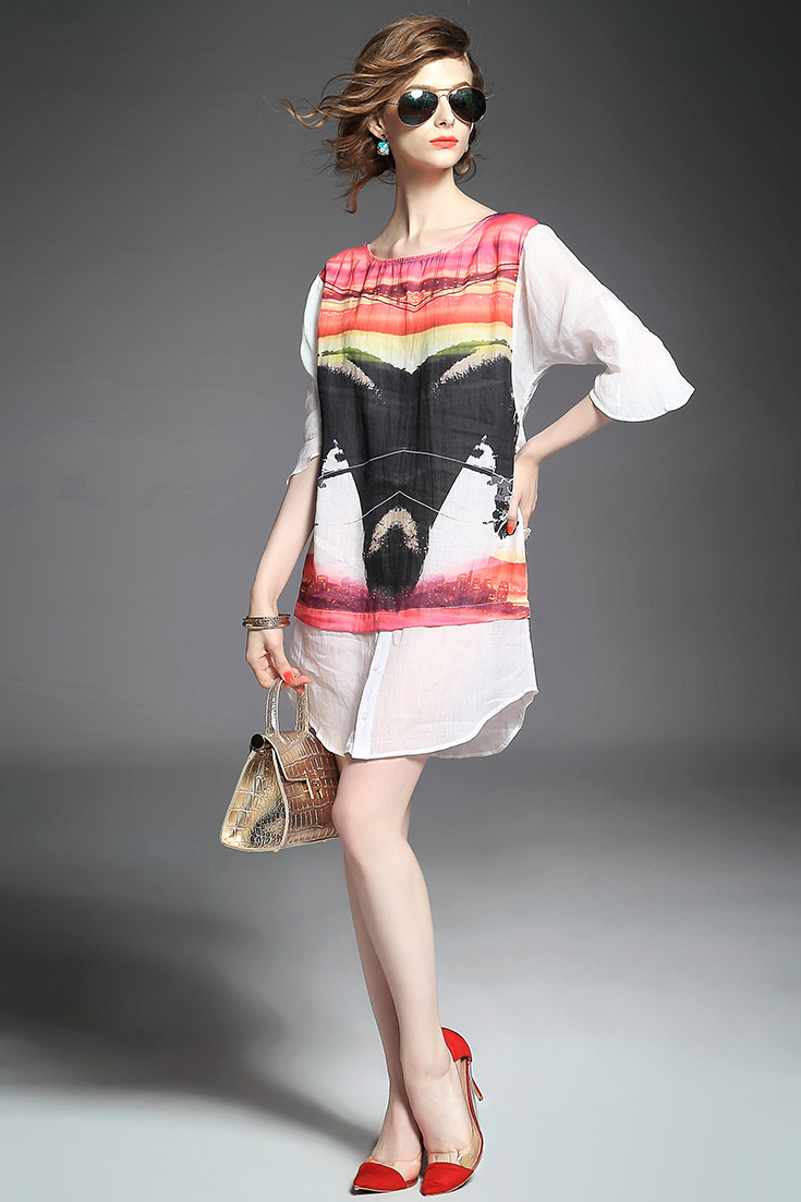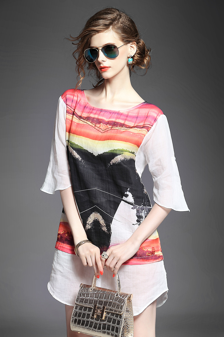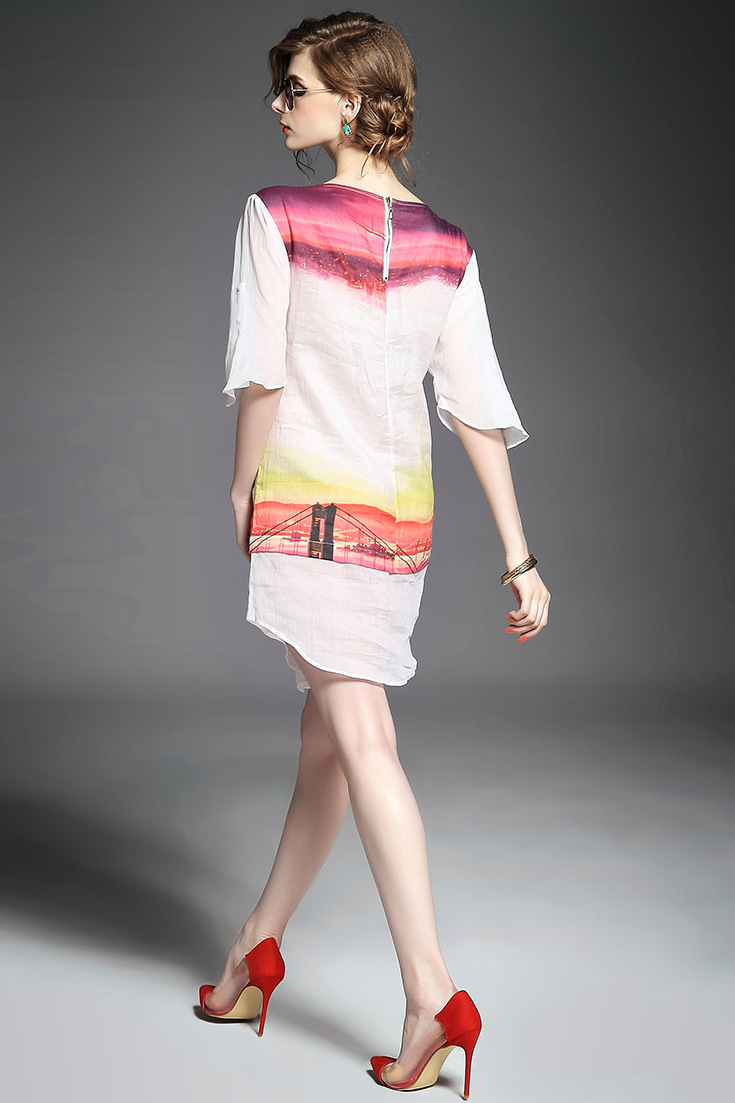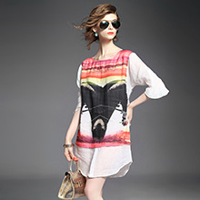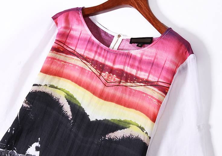 > 2015欧美品牌女装夏季新款 圆领喇叭袖纯麻印花宽松气质连衣裙