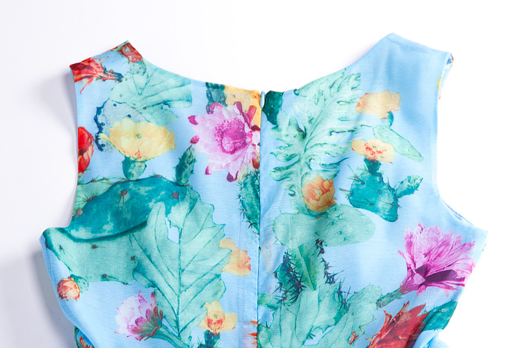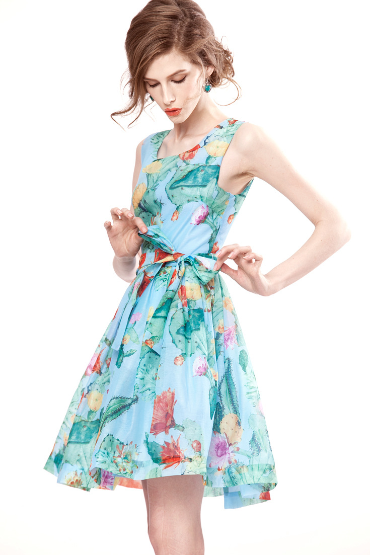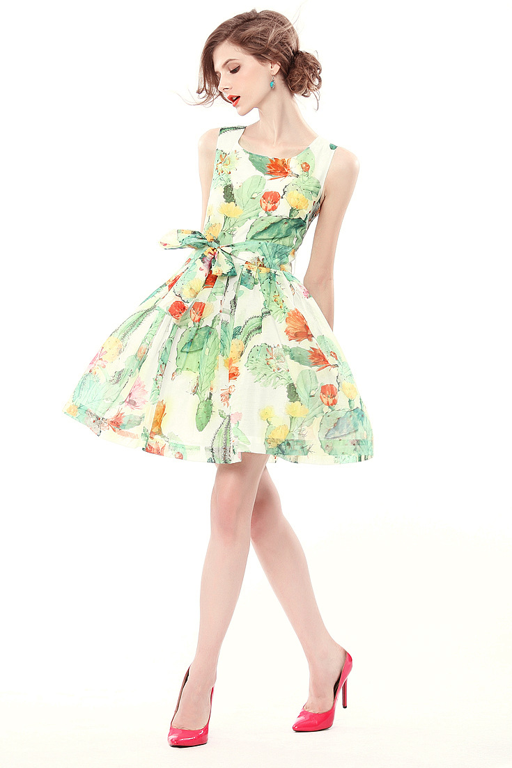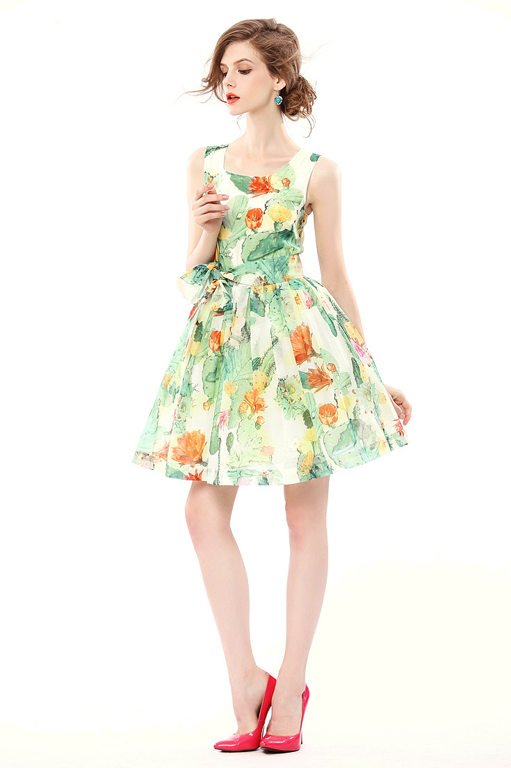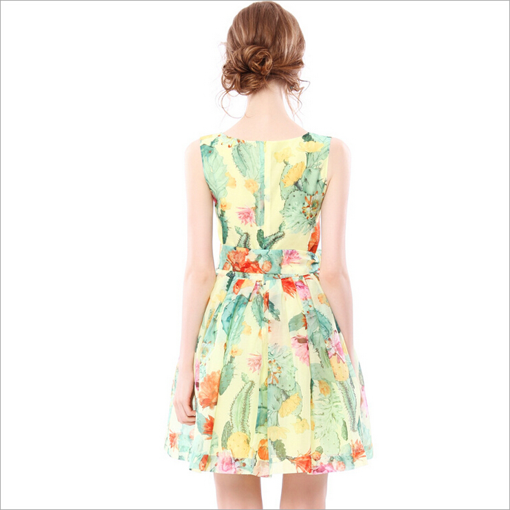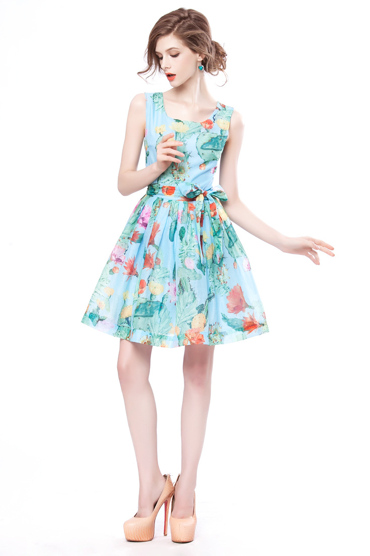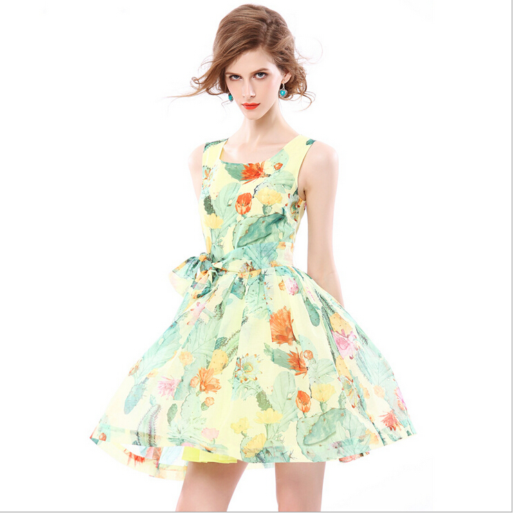 > 2015夏季女装 欧美大牌圆领系带碎花蓬蓬裙连衣裙收腰显瘦