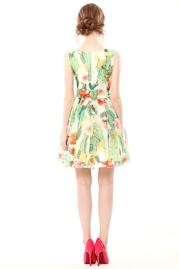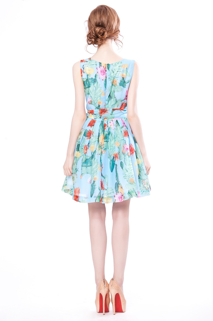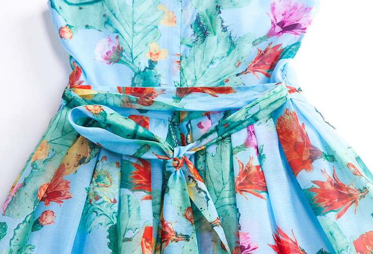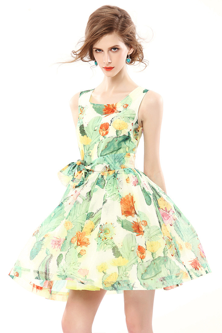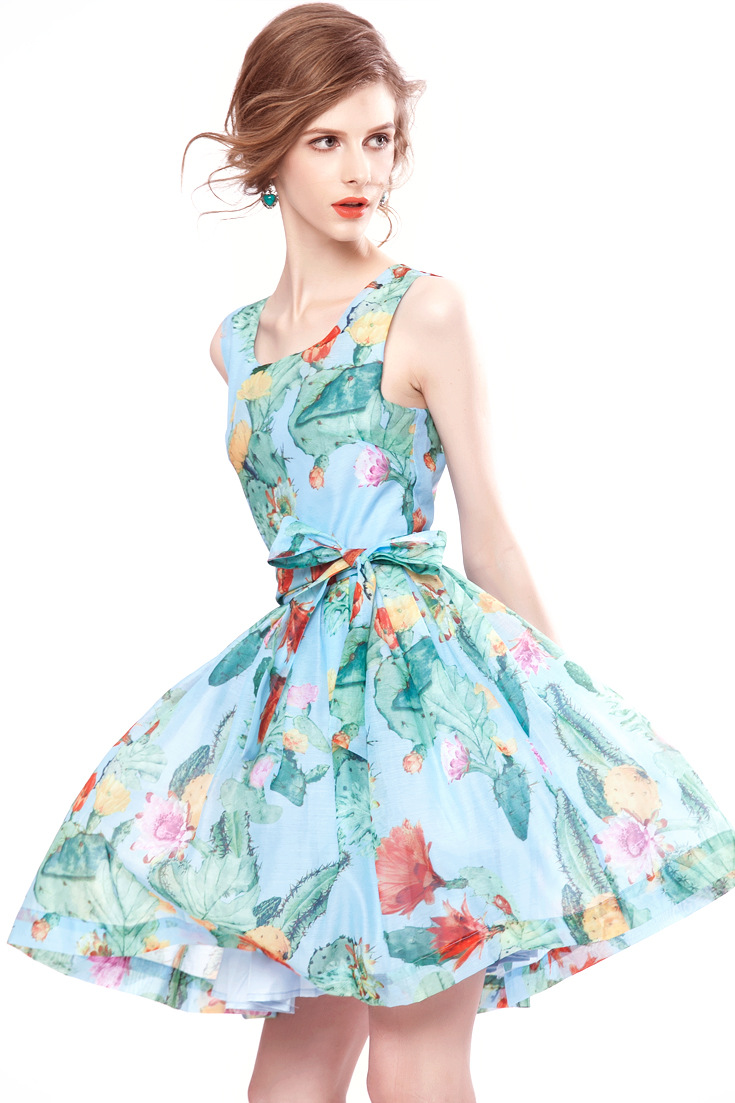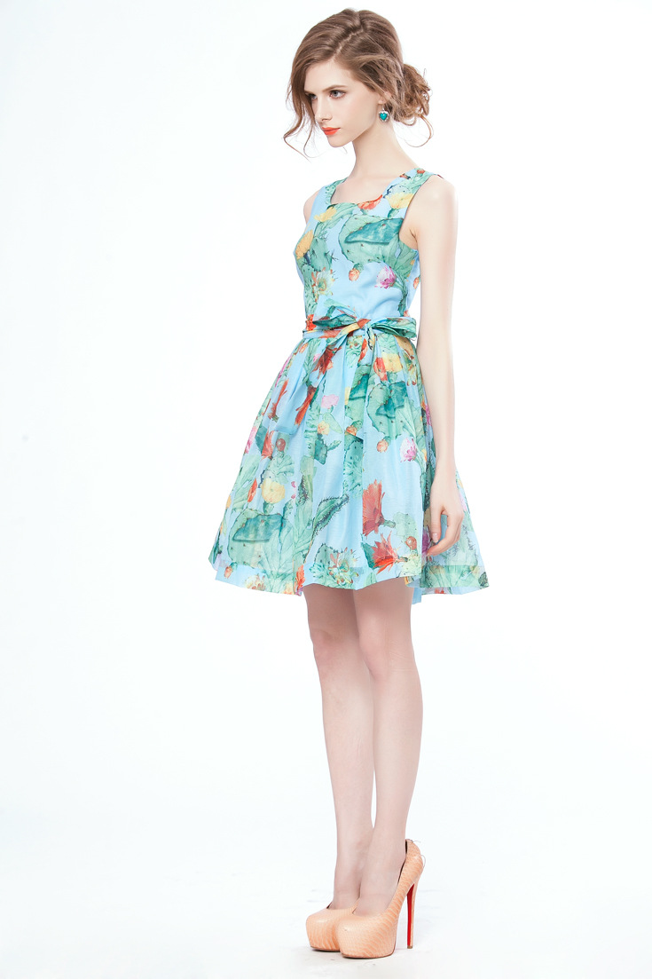 2015夏季女装 欧美大牌圆领系带碎花蓬蓬裙连衣裙收腰显瘦