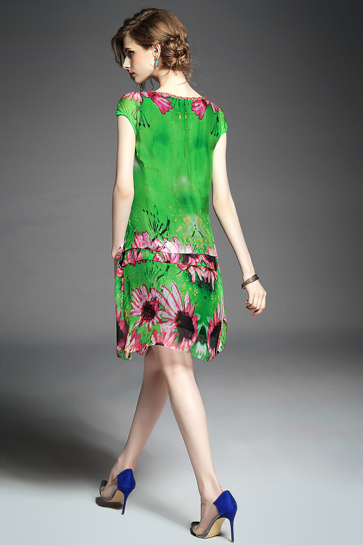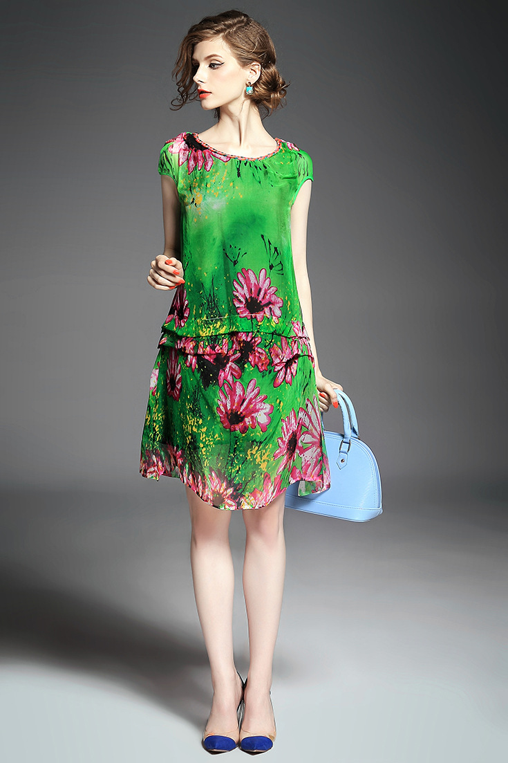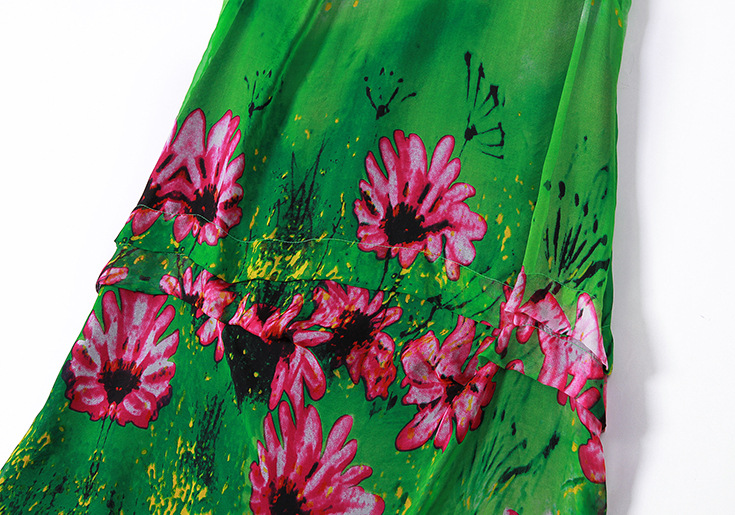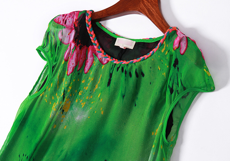 2015春夏新款欧美风印花高档桑蚕丝七分袖A字裙真丝连衣裙