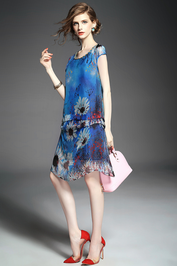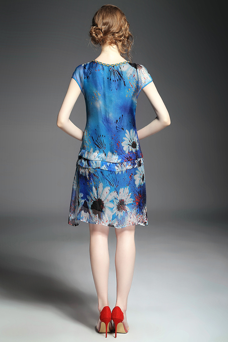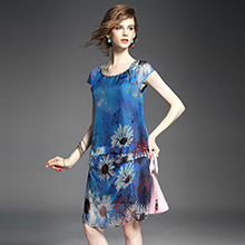 > 2015夏季女装新款 圆领织带荷叶边拼接大摆不规则真丝印花连衣裙