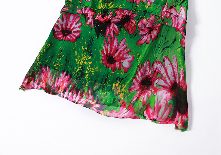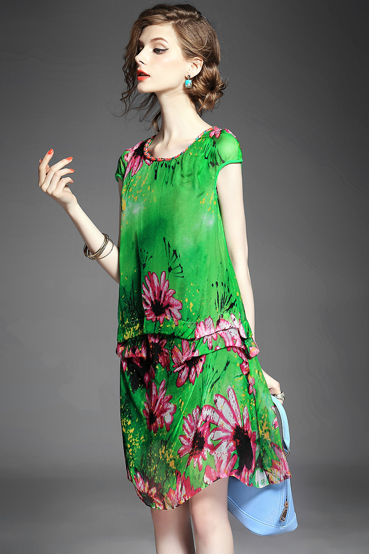 2015夏季女装新款 圆领织带荷叶边拼接大摆不规则真丝印花连衣裙