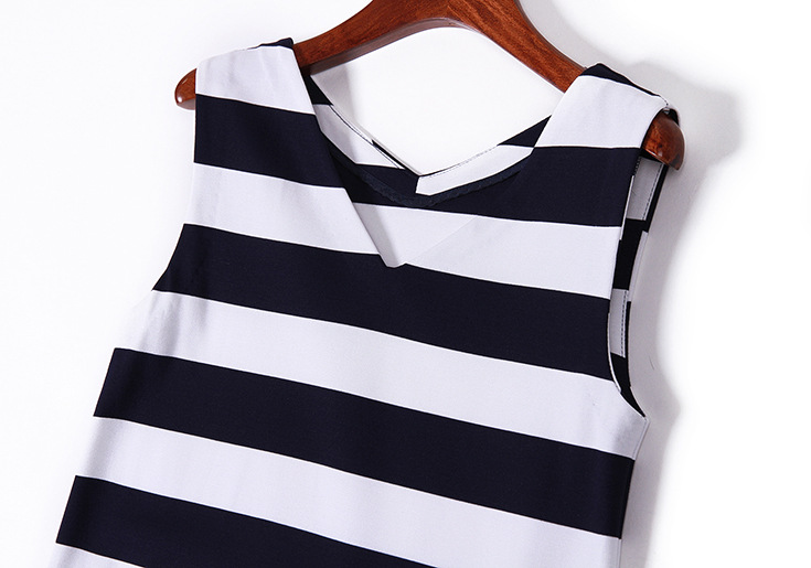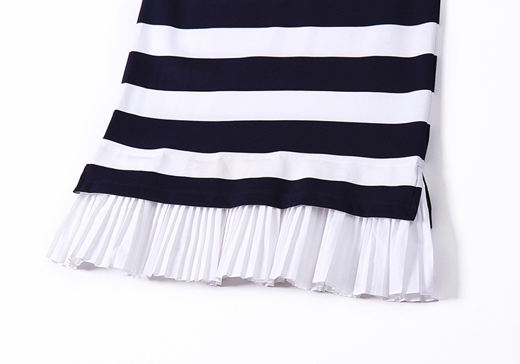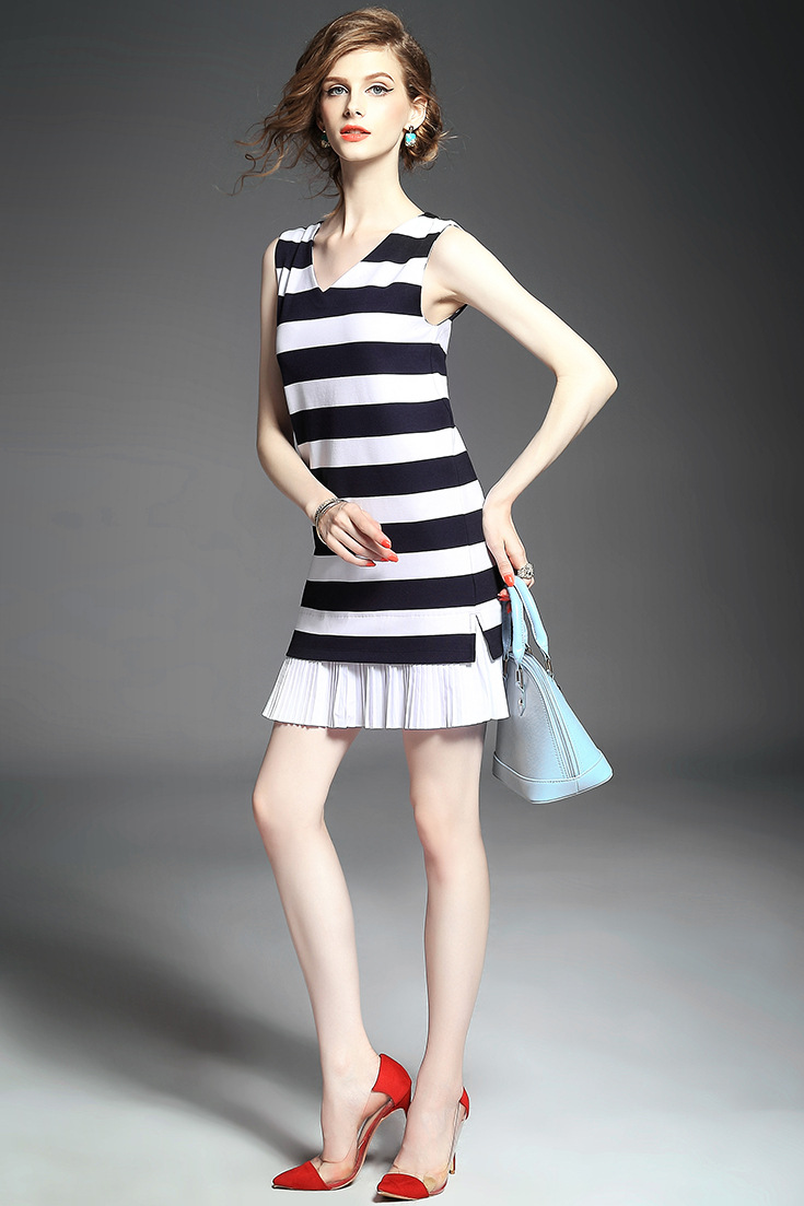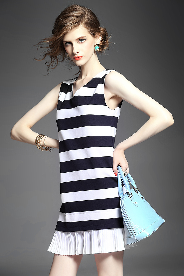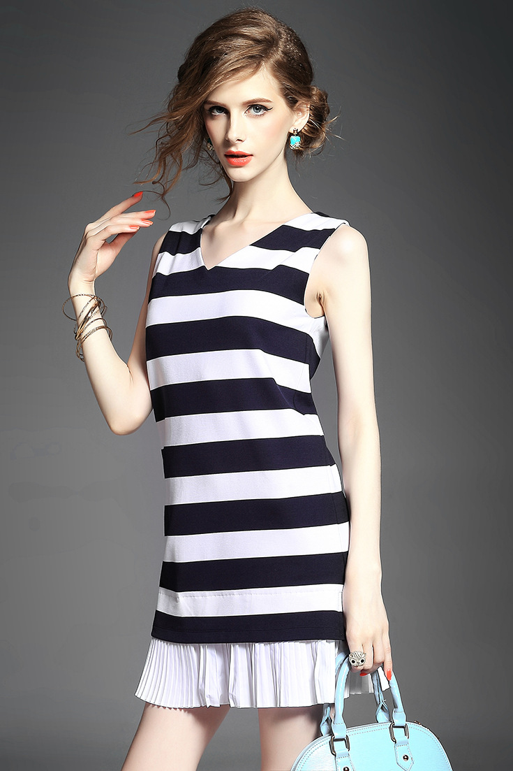 > 2015夏新品 时尚v领条纹下摆压褶拼接弹力修身显瘦连衣裙