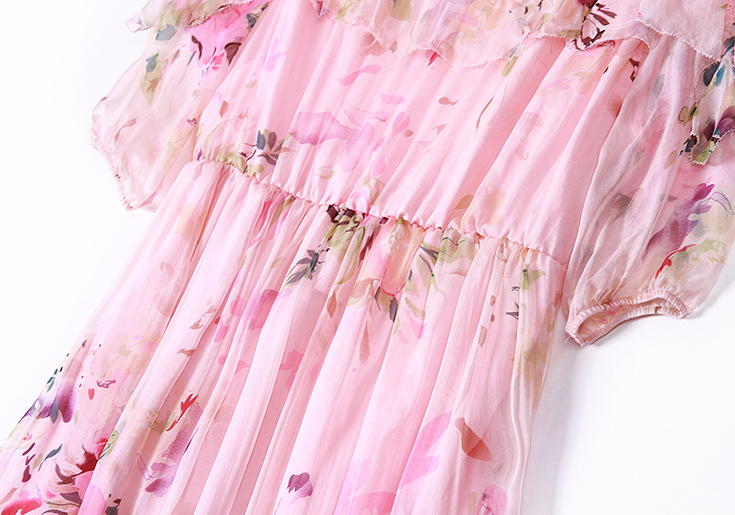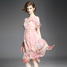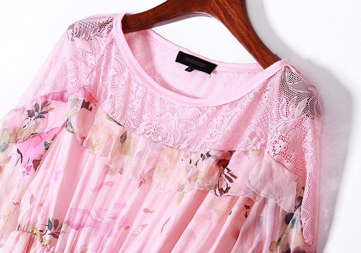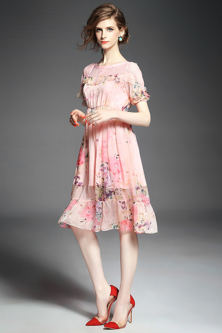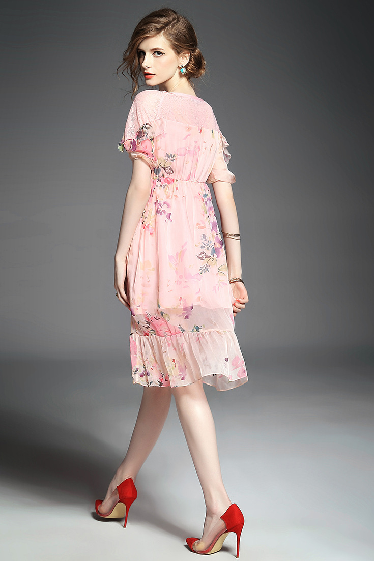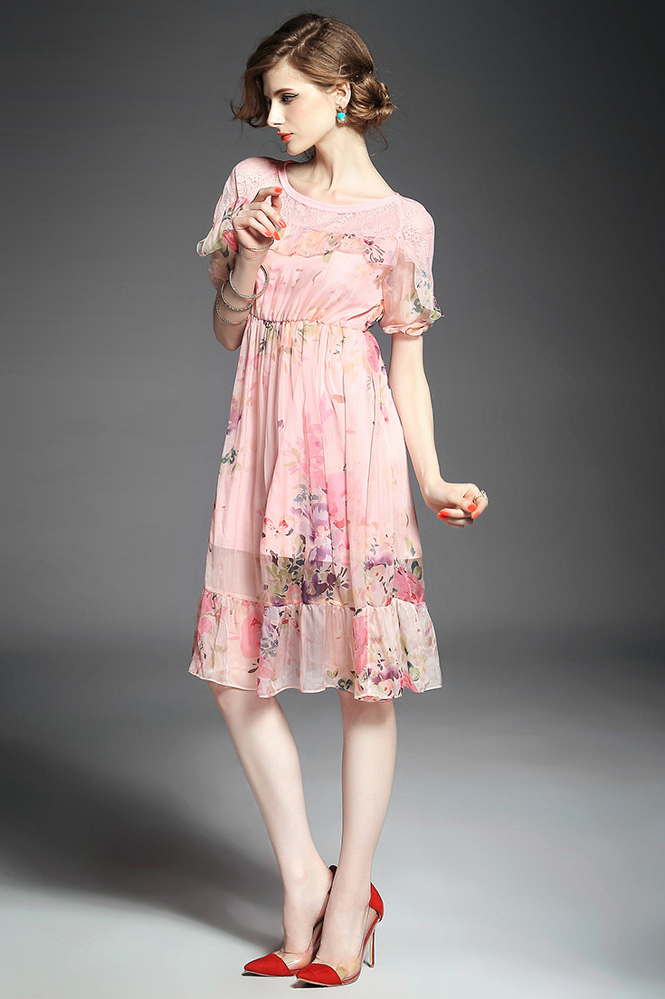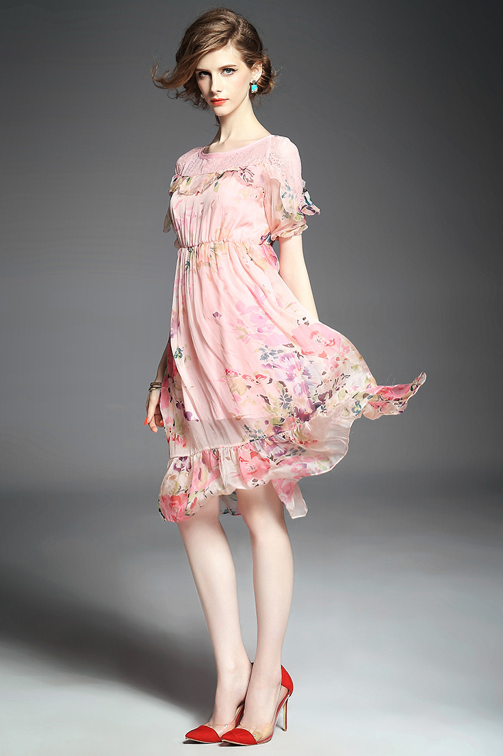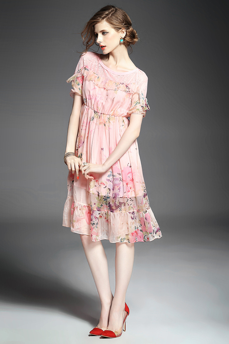 > 2015夏季女装气质淑女蕾丝拼接荷叶边真丝印花弹力收腰中长连衣裙