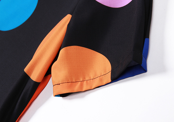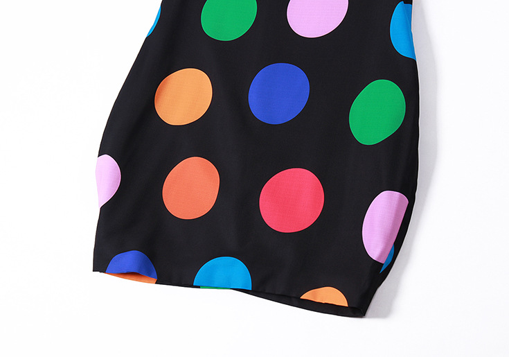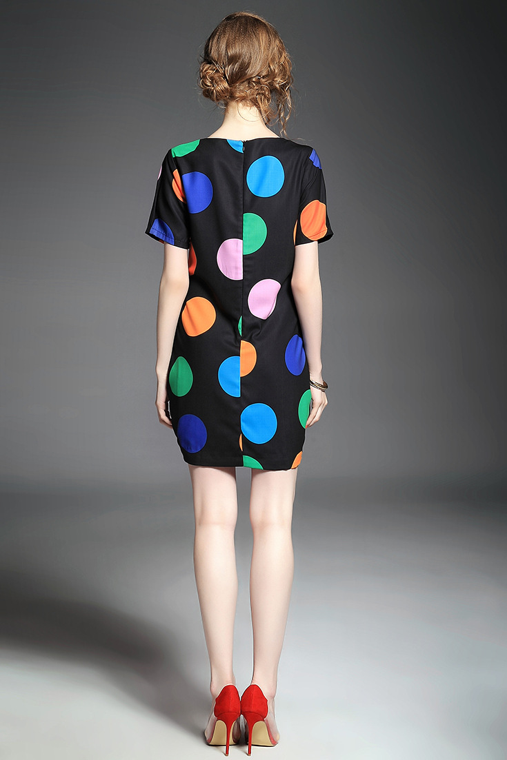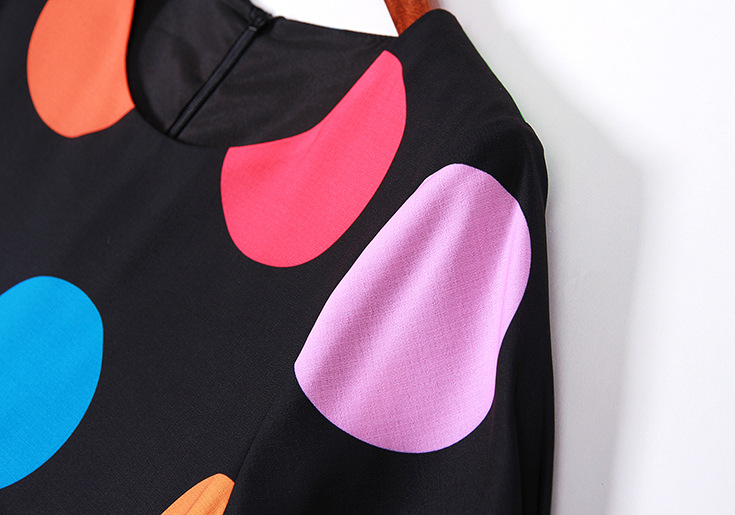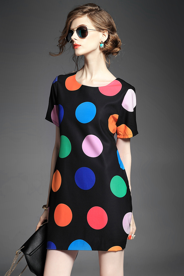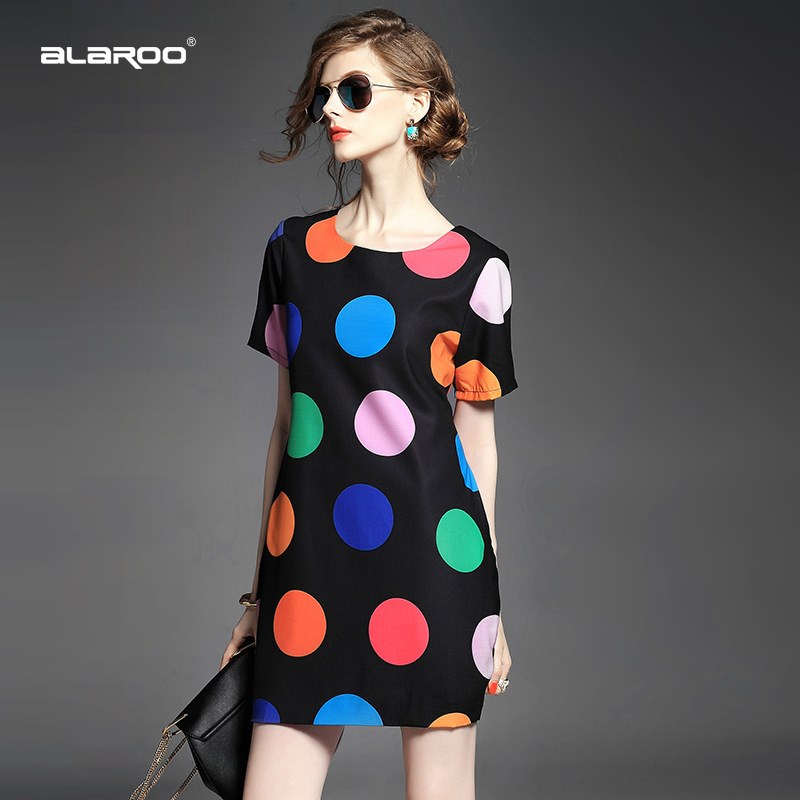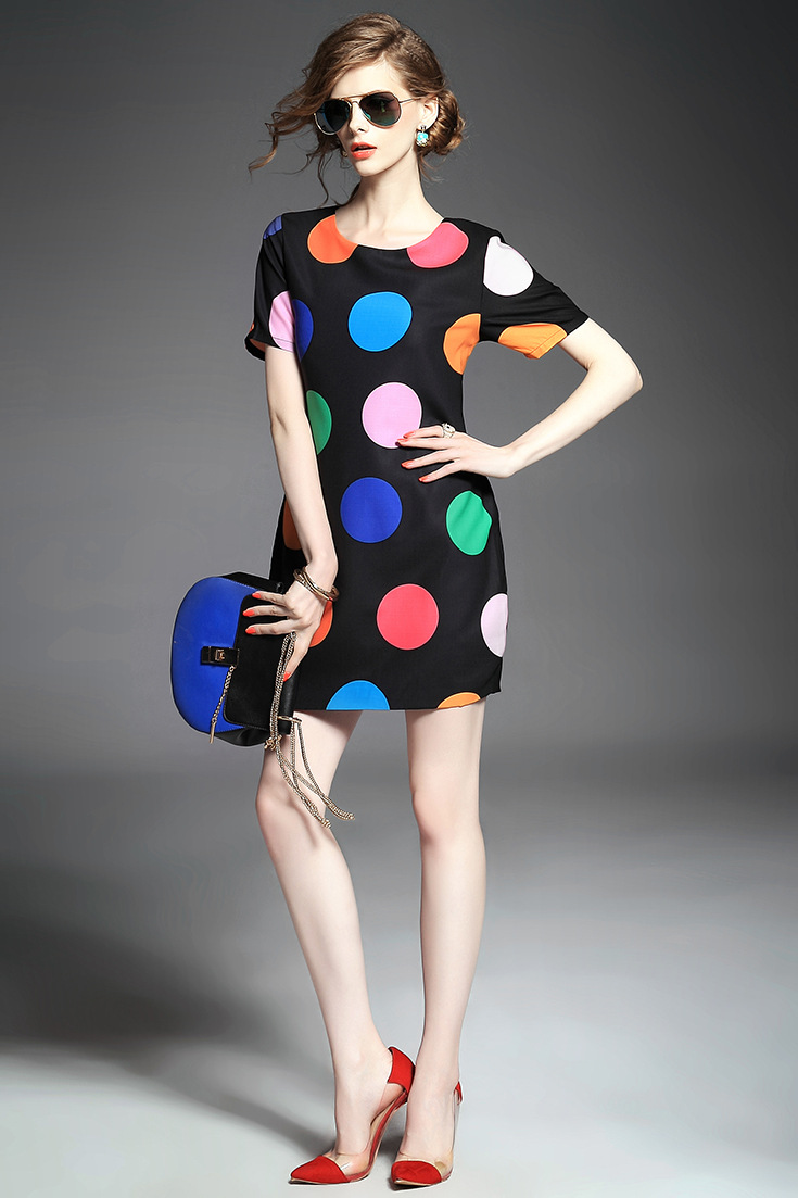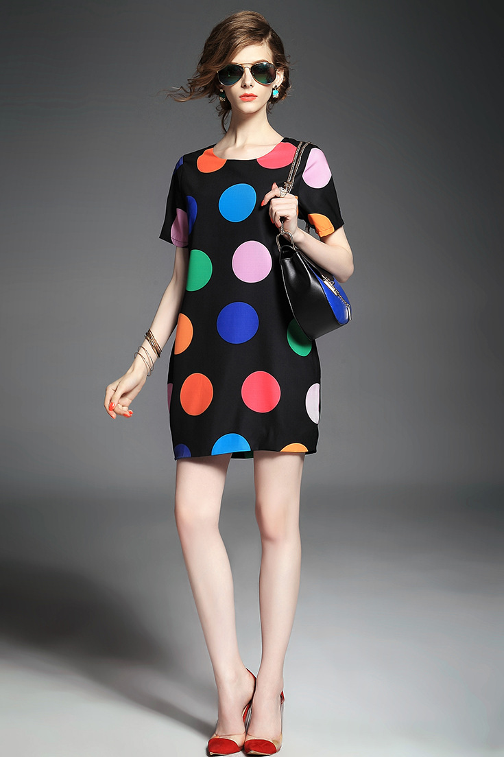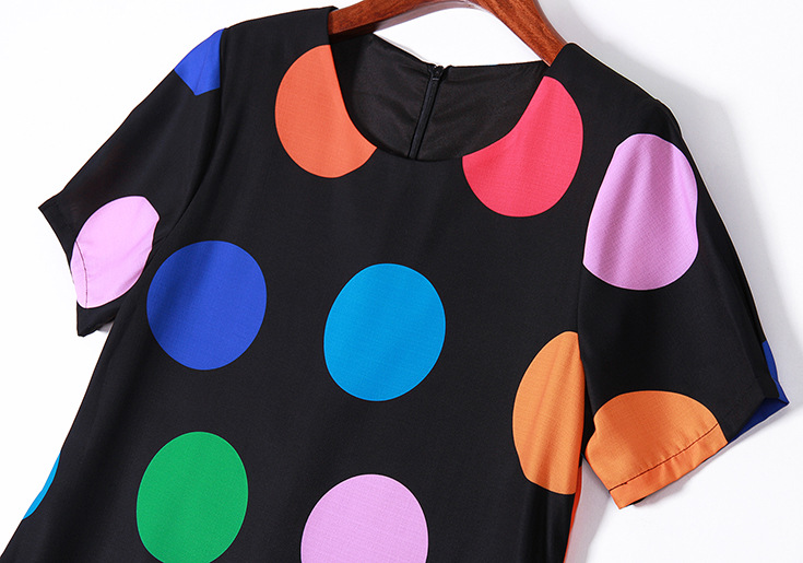 2015夏季女装 圆领短袖彩色波点印花宽松茧型裙品质连衣裙