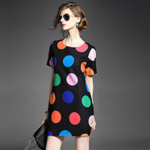 > 2015夏季女装 圆领短袖彩色波点印花宽松茧型裙品质连衣裙