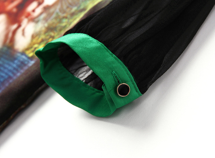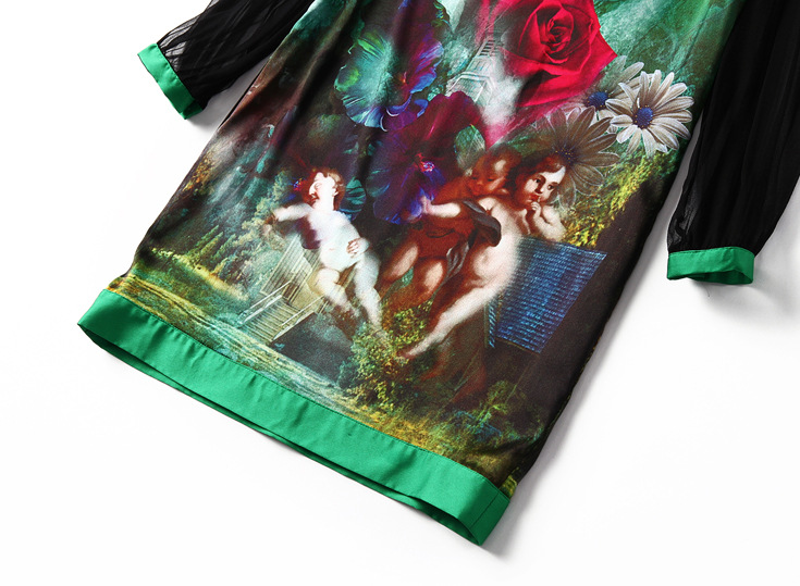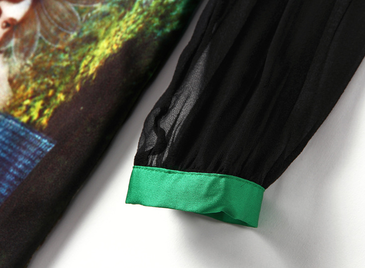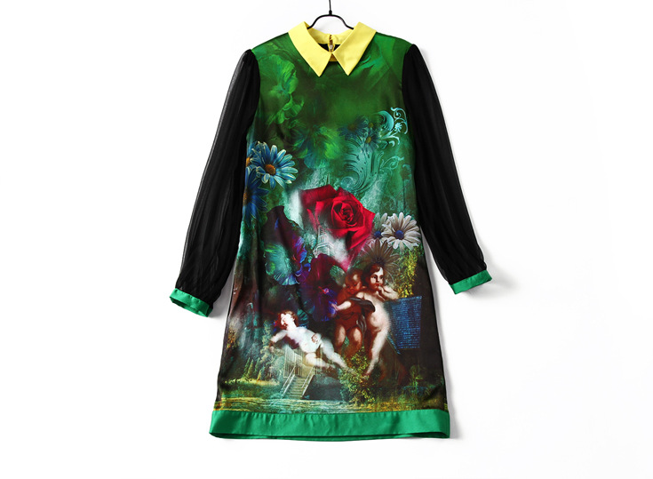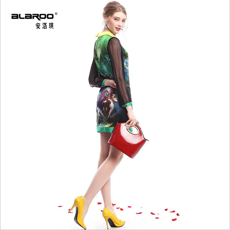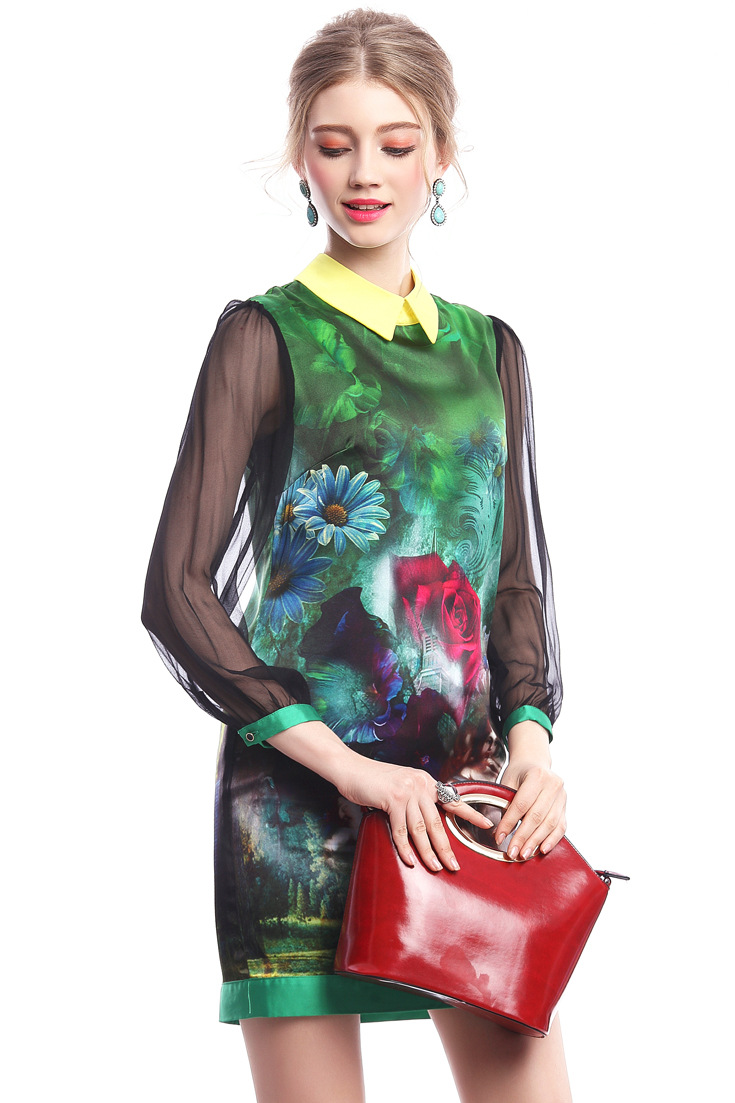 > 2015春季新款真丝翻领透视长袖修身印花一步裙连衣裙