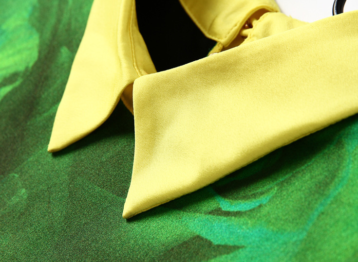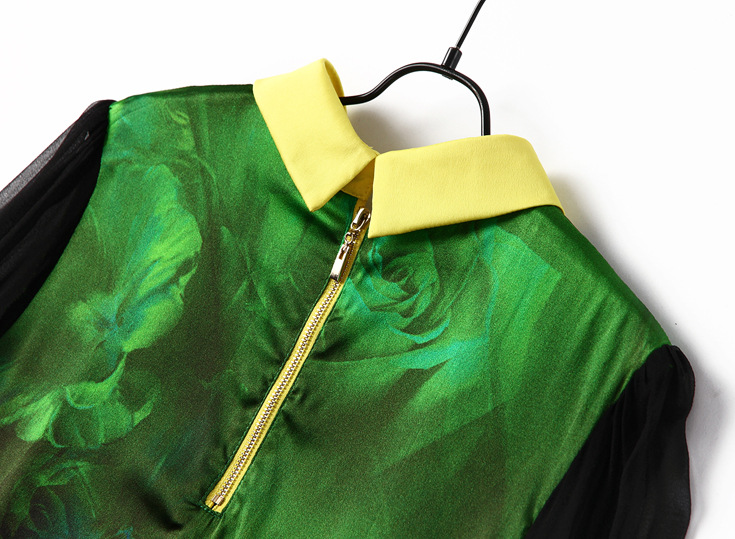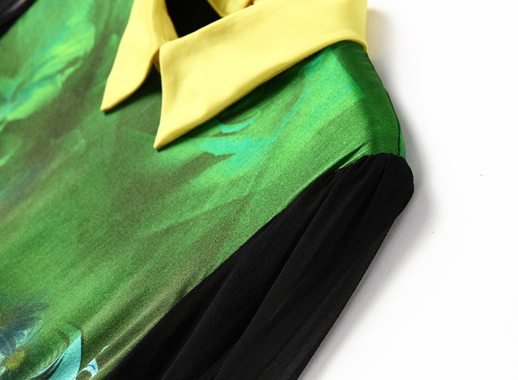 2015春夏季新款欧美风印花真丝连衣裙七分袖衬衣领时尚A字裙