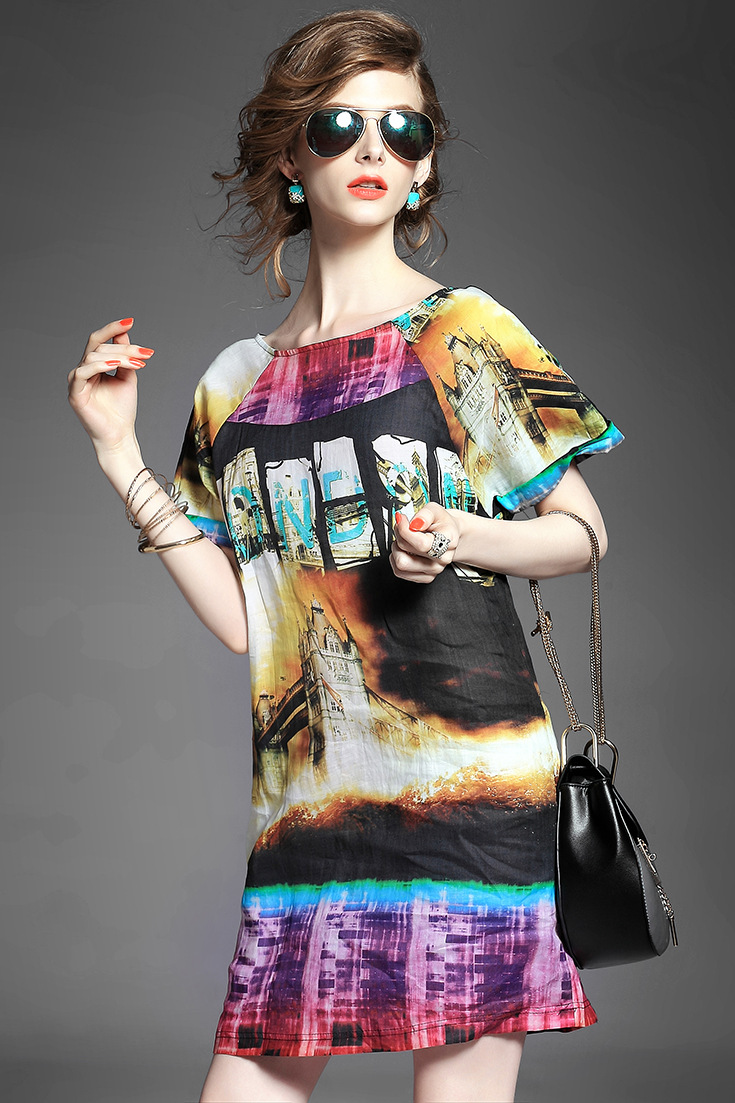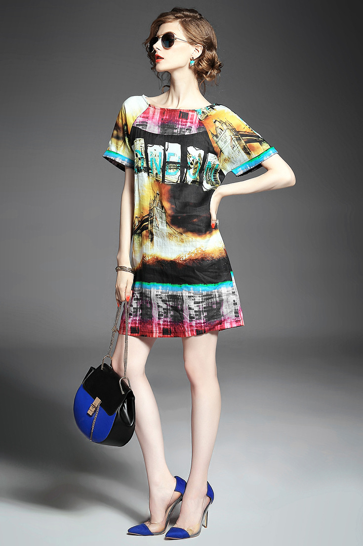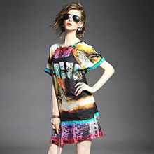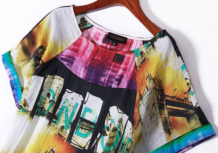 > 2015夏季新款 欧美时尚圆领亚麻印花宽松套头品质连衣裙精品