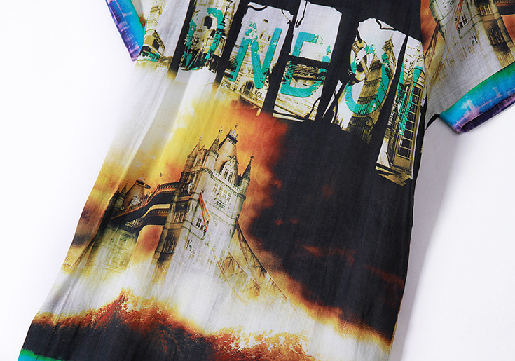 2015春夏季新款欧美风印花真丝连衣裙七分袖衬衣领时尚A字裙
