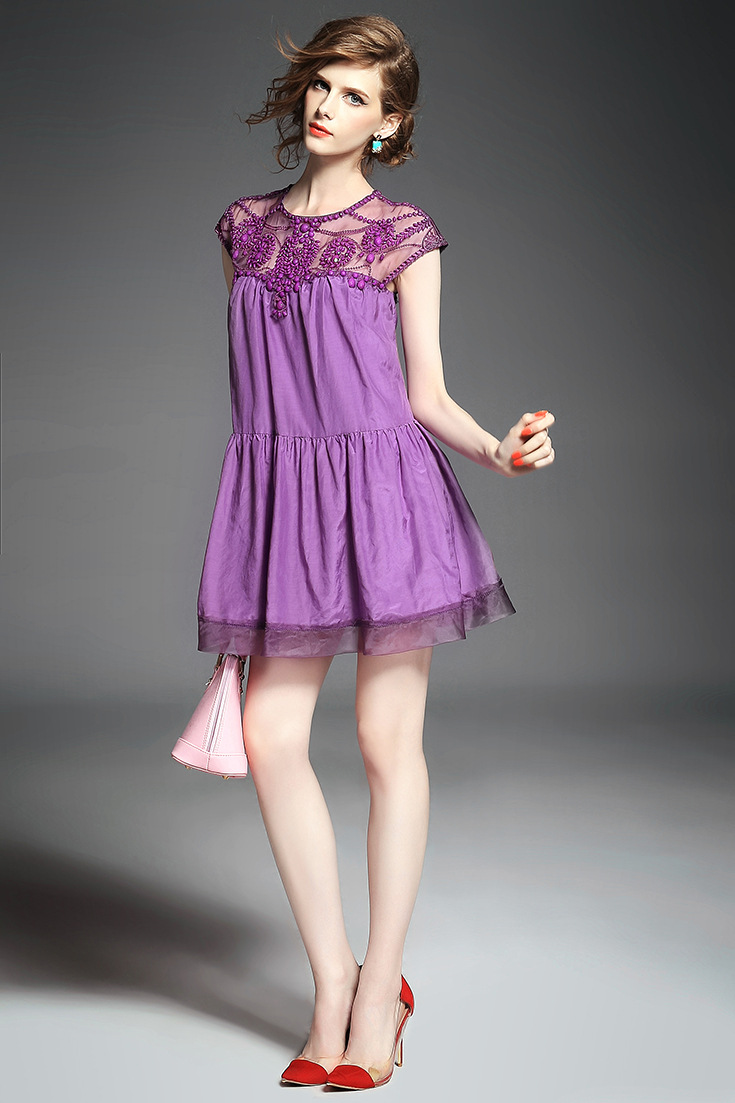 2015欧美风春季仙女裙气质新款刺绣网纱连衣裙七分袖大摆裙