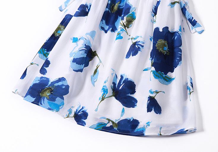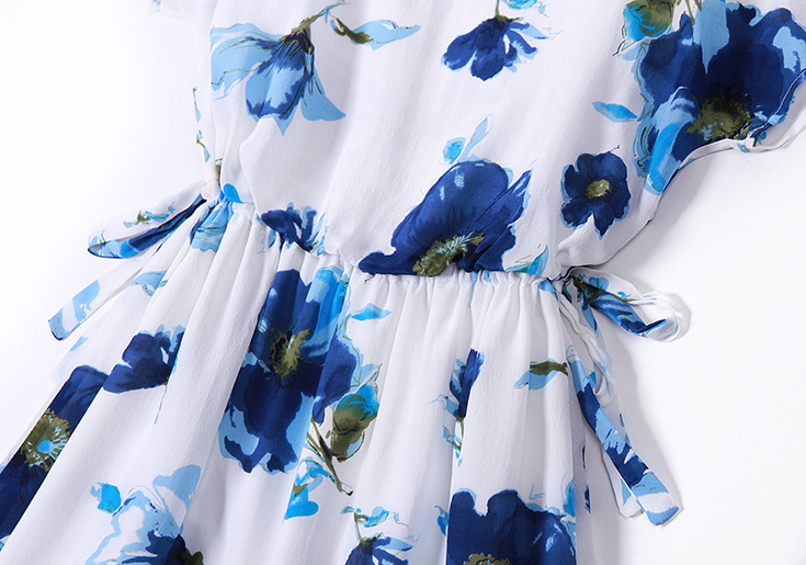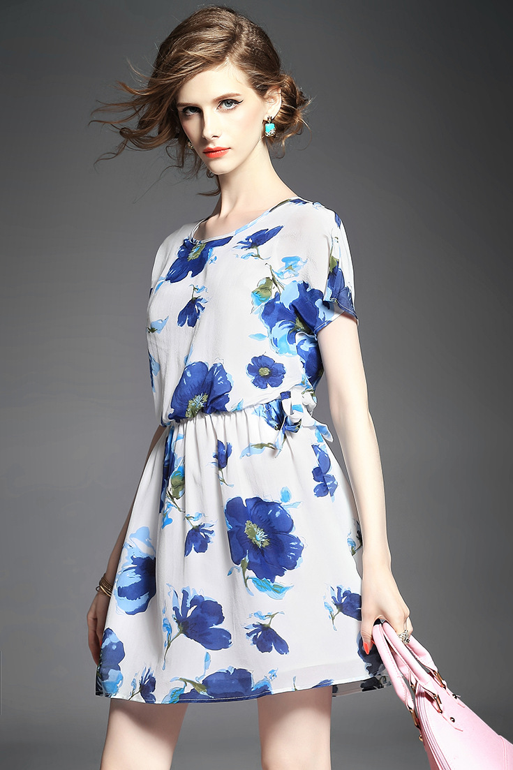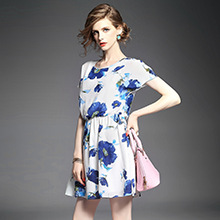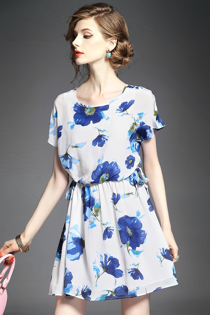 > 2015夏季女装新款 欧美高端圆领印花气质收腰系带桑蚕丝连衣裙子