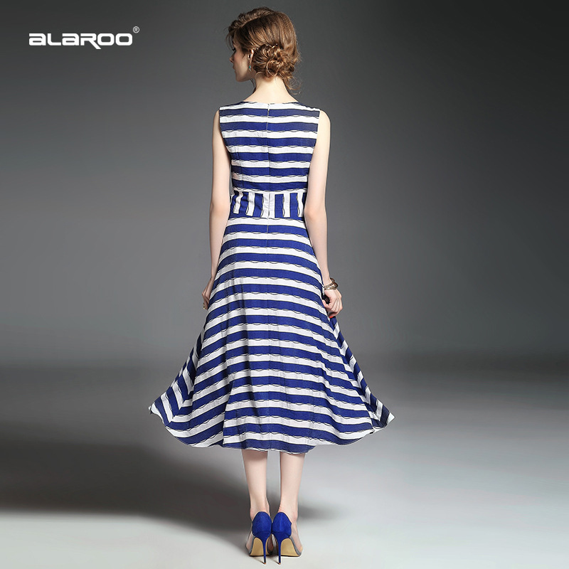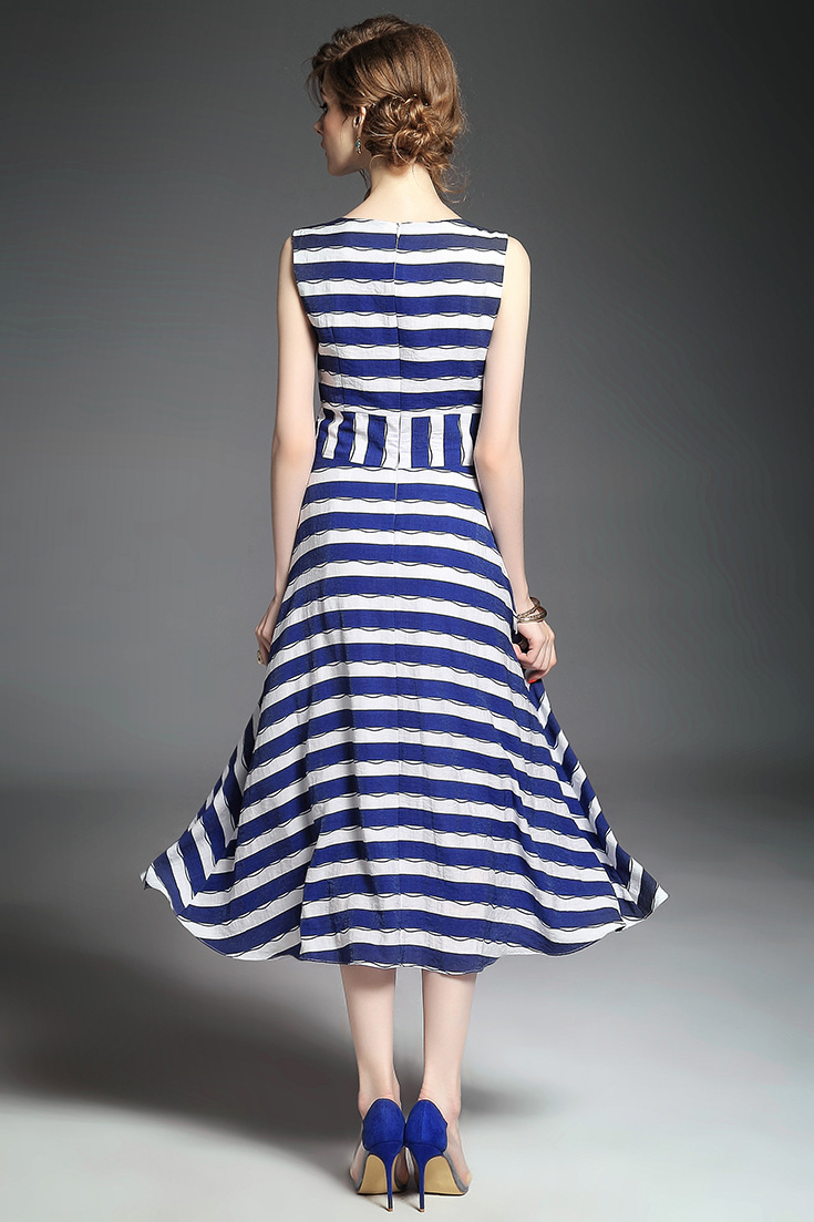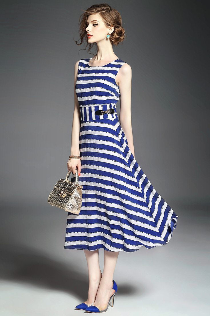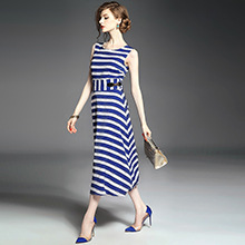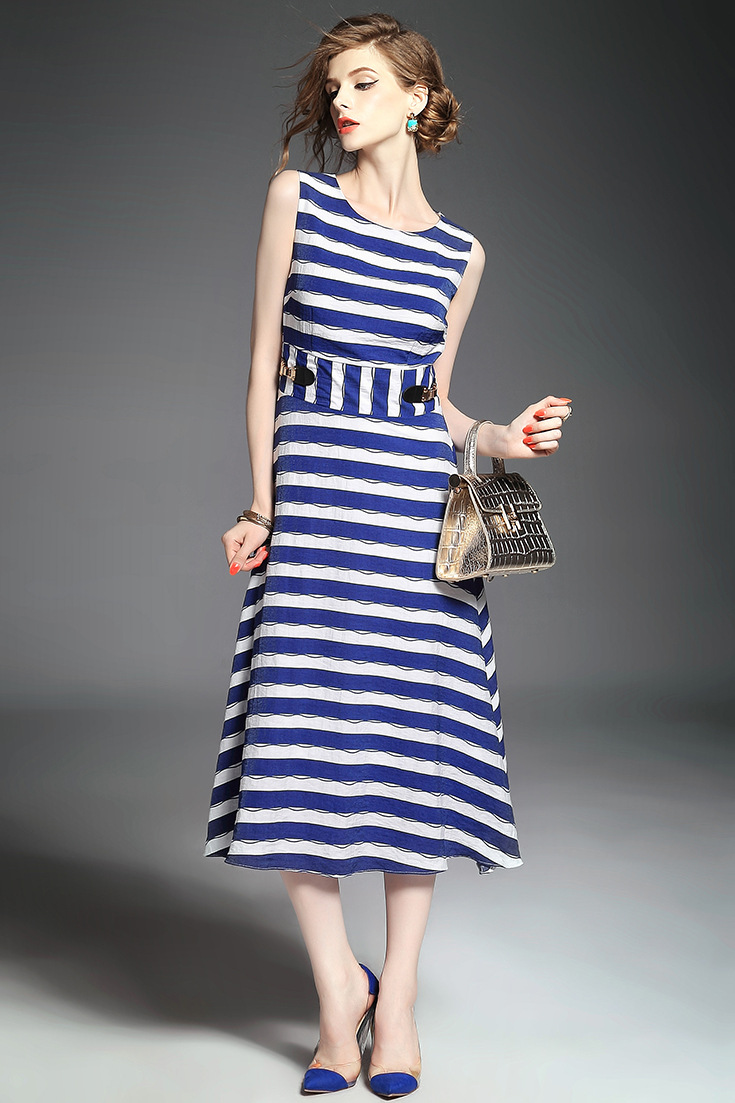 > 2015夏季女装 欧美无袖圆领亚麻条纹印花收腰修身大摆长裙