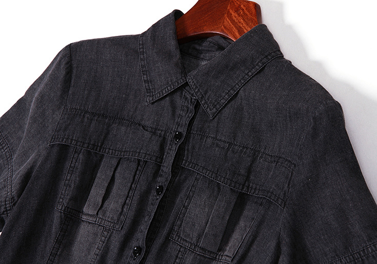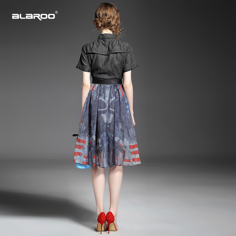 2015夏季女装 翻领短袖水洗牛仔布拼接乔其纱印花修身大摆连衣裙