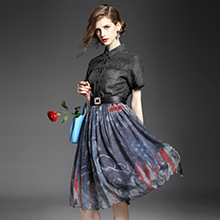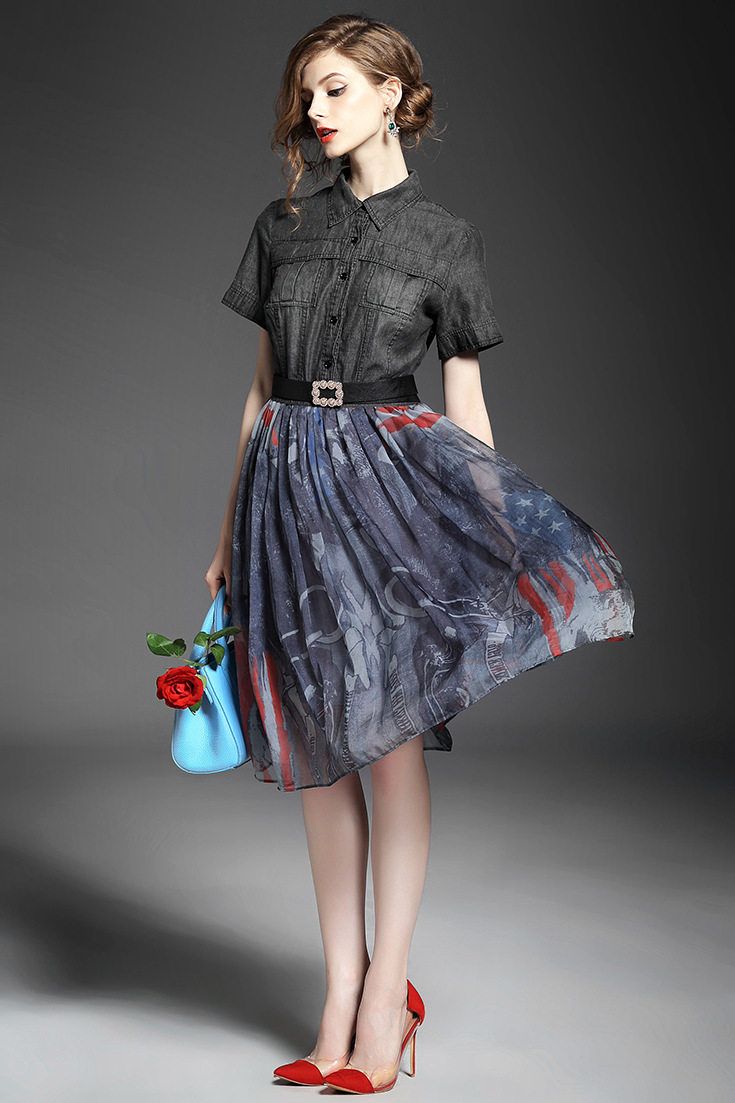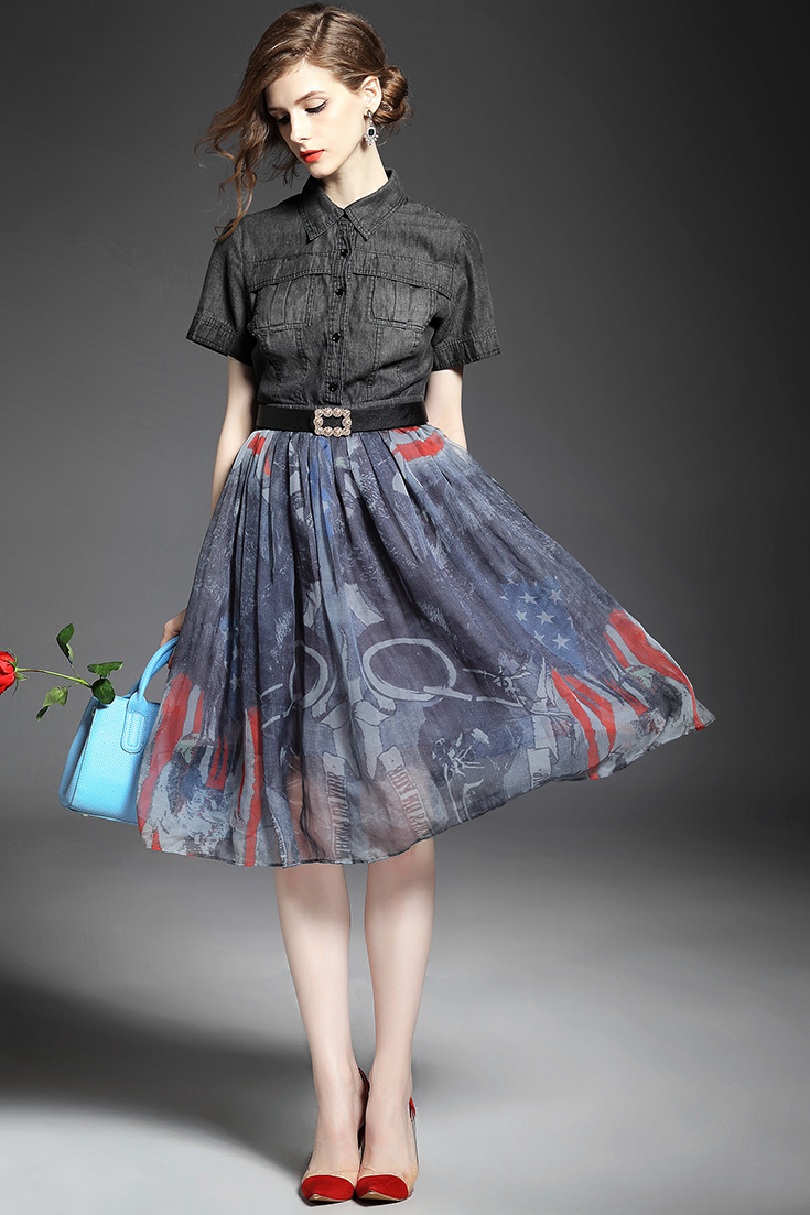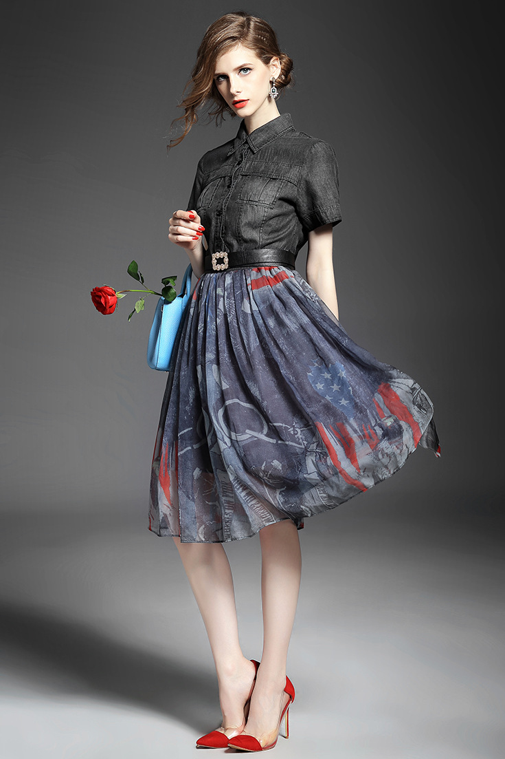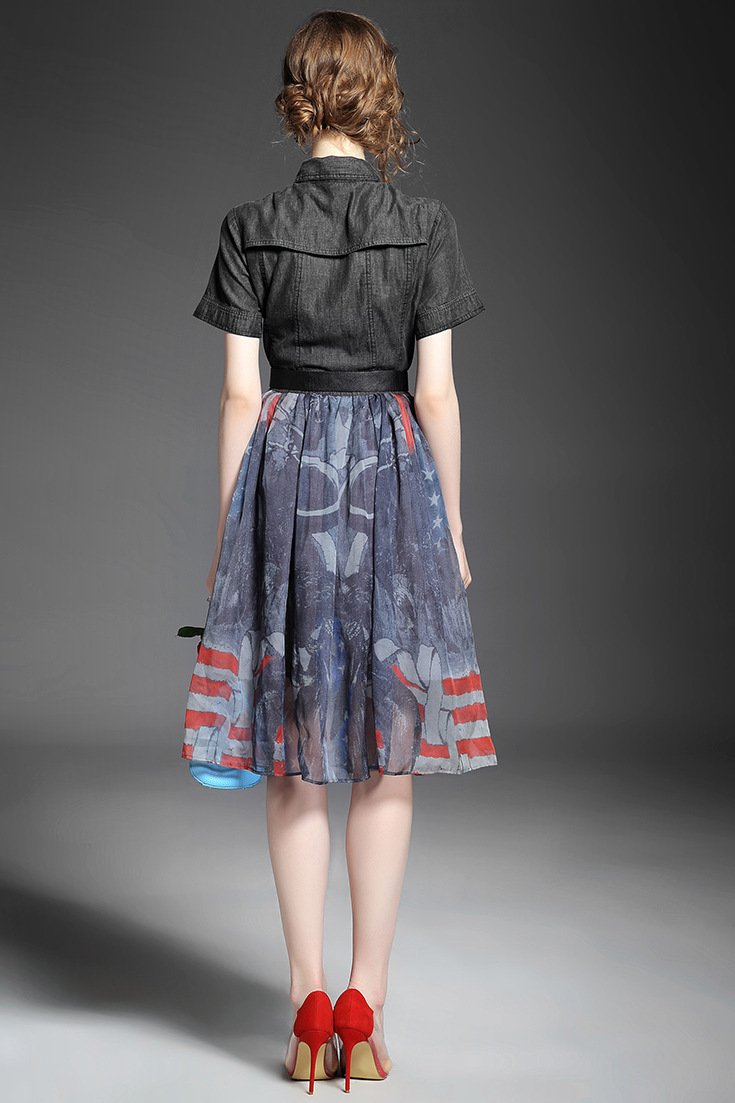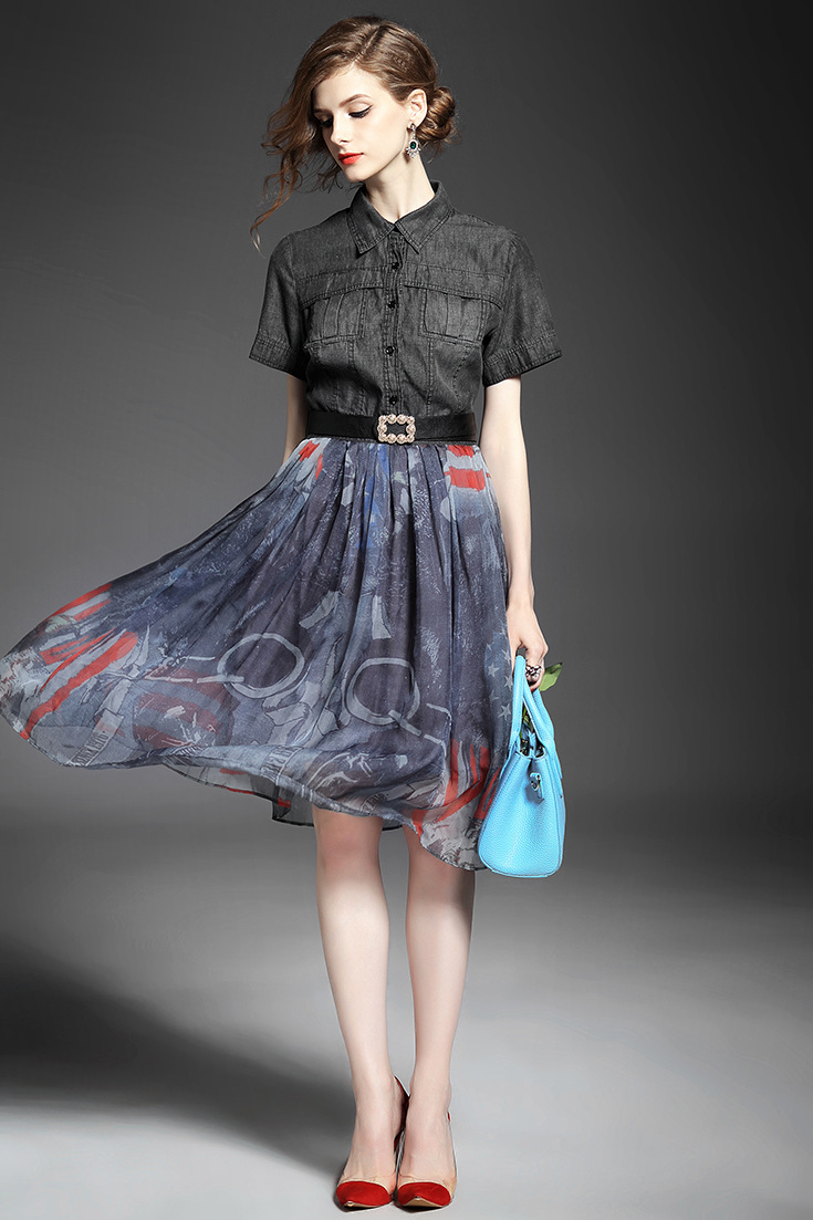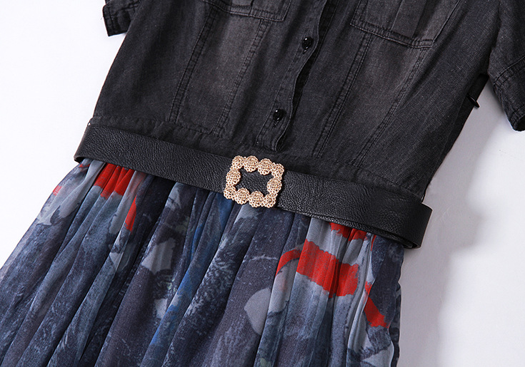> 2015夏季女装 翻领短袖水洗牛仔布拼接乔其纱印花修身大摆连衣裙