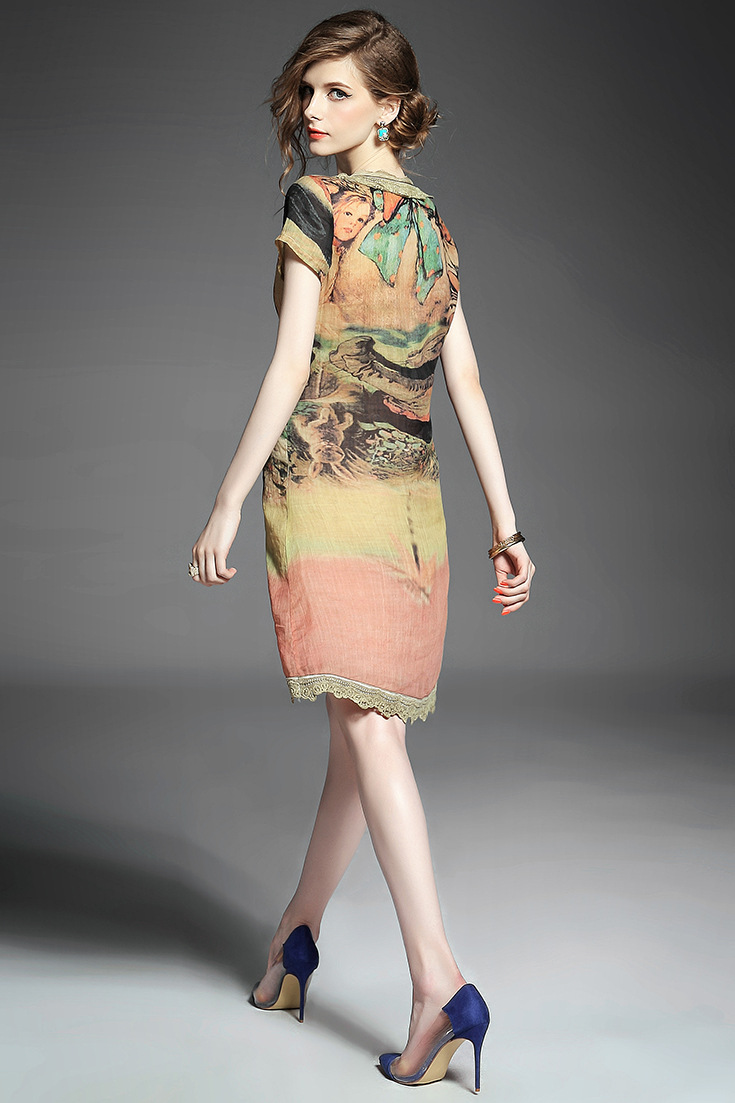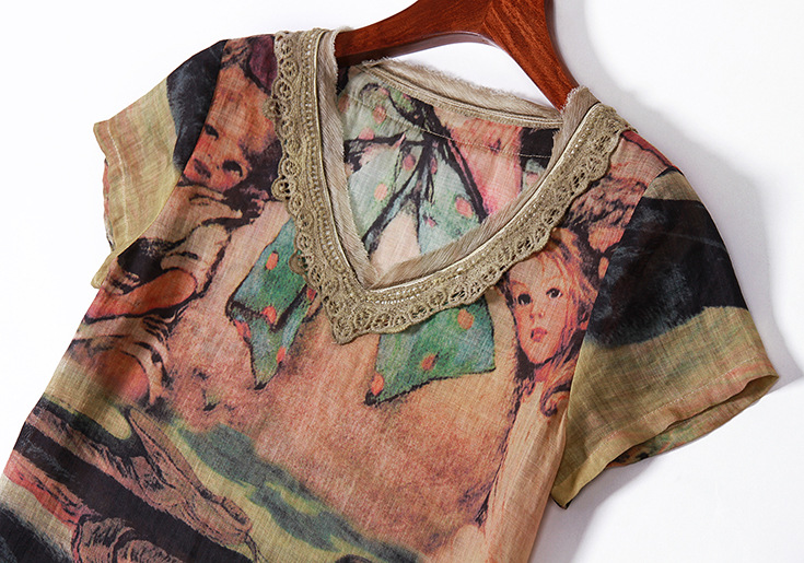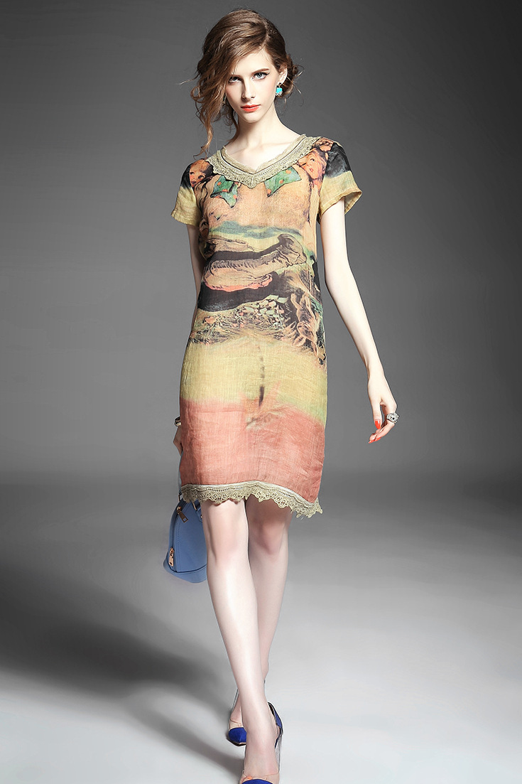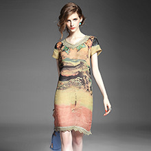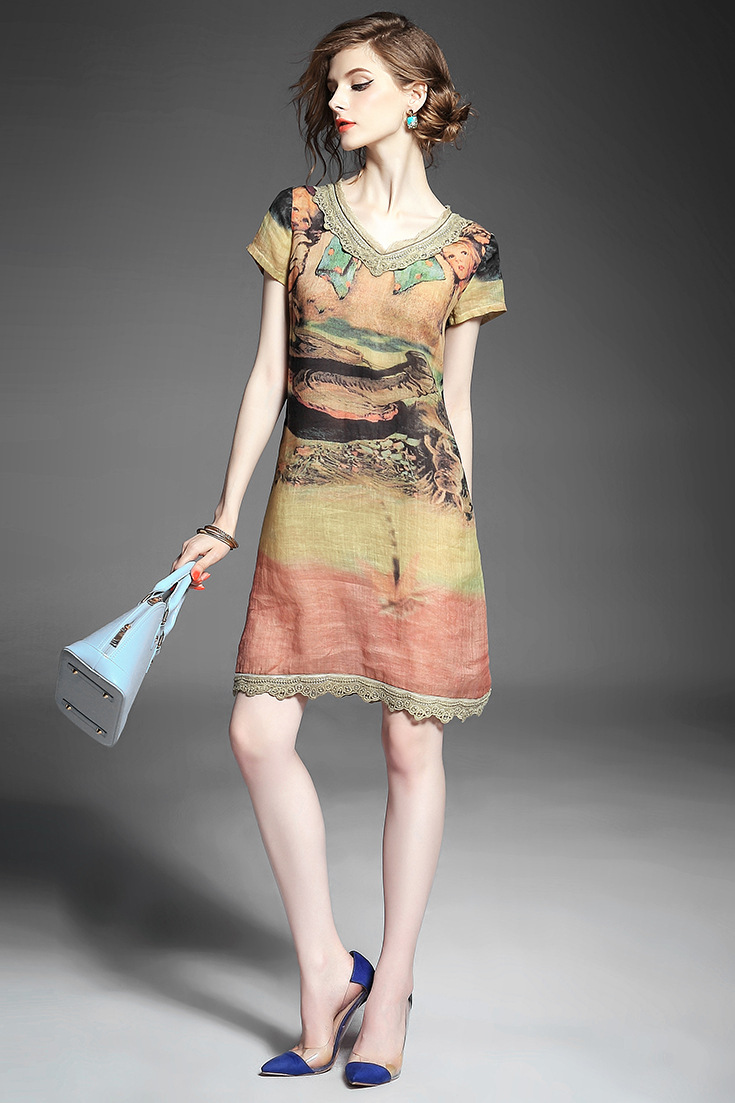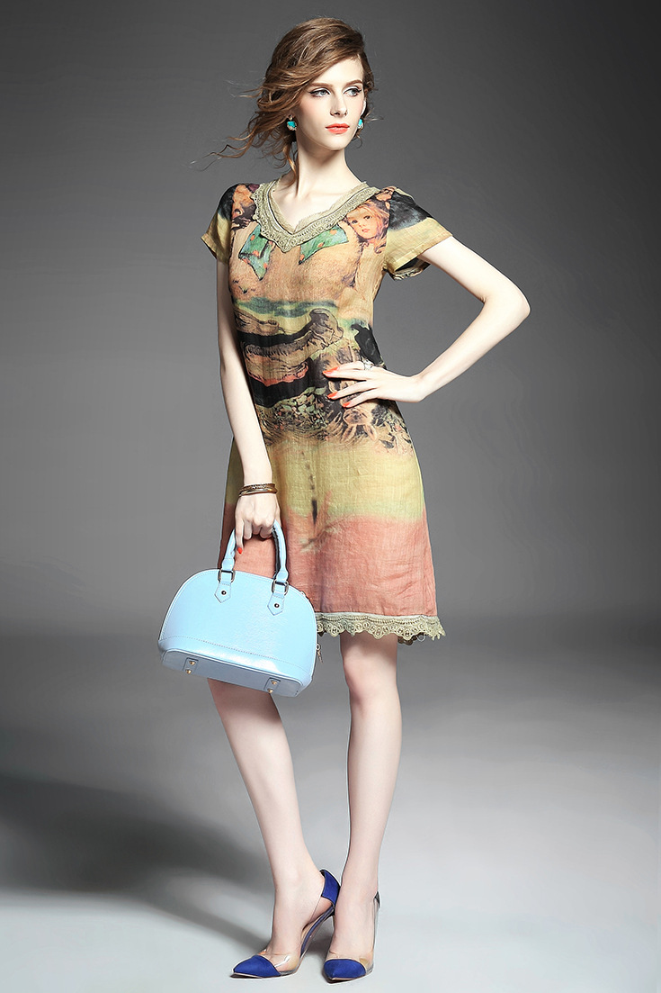 > 高端女装2015夏 时尚v领绣花波浪边复古印花做旧丝麻连衣裙