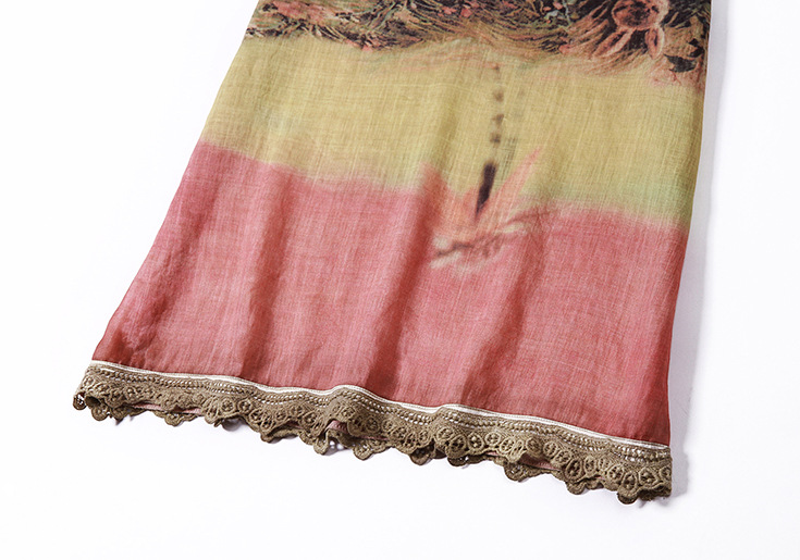 高端女装2015夏 时尚v领绣花波浪边复古印花做旧丝麻连衣裙
