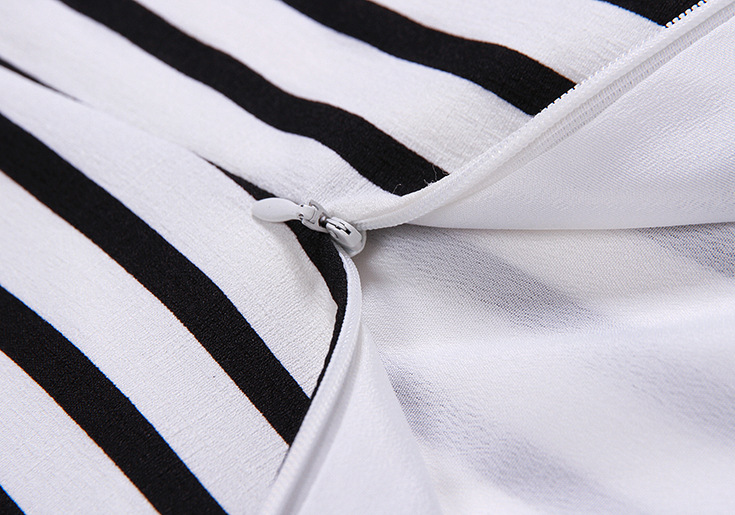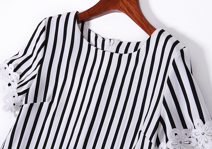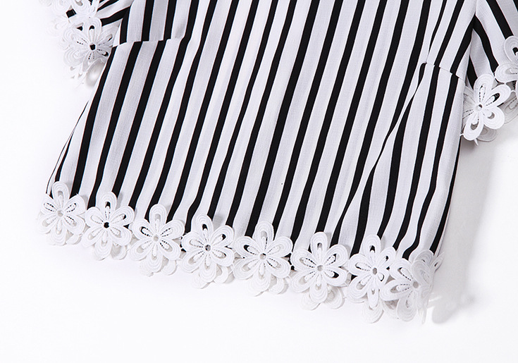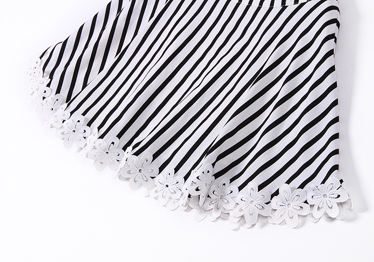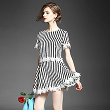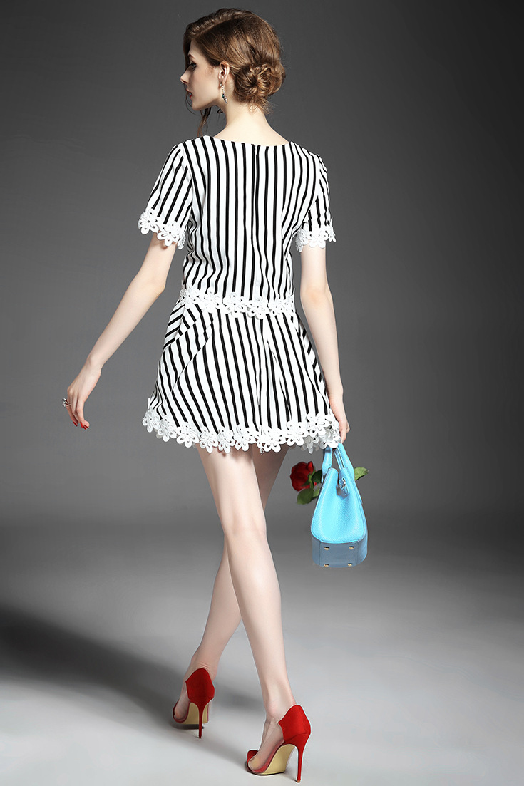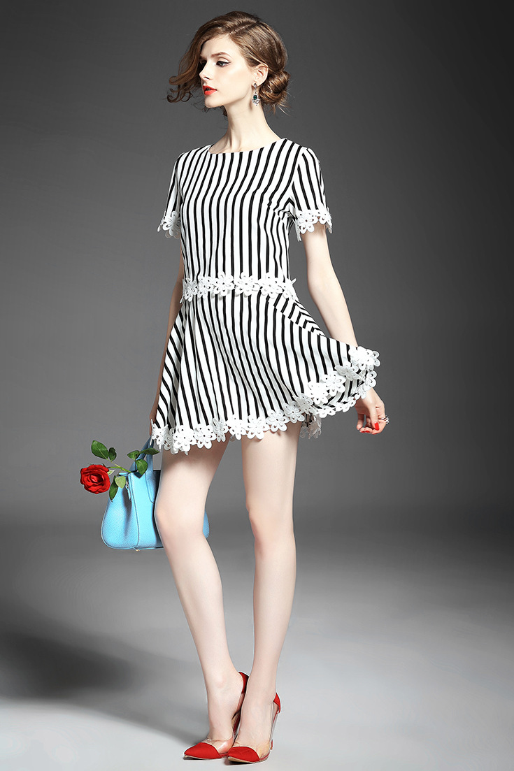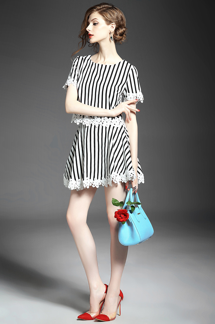 2015品牌女装 圆领水溶绣花拼接气质短上衣+条纹半身短裙套装