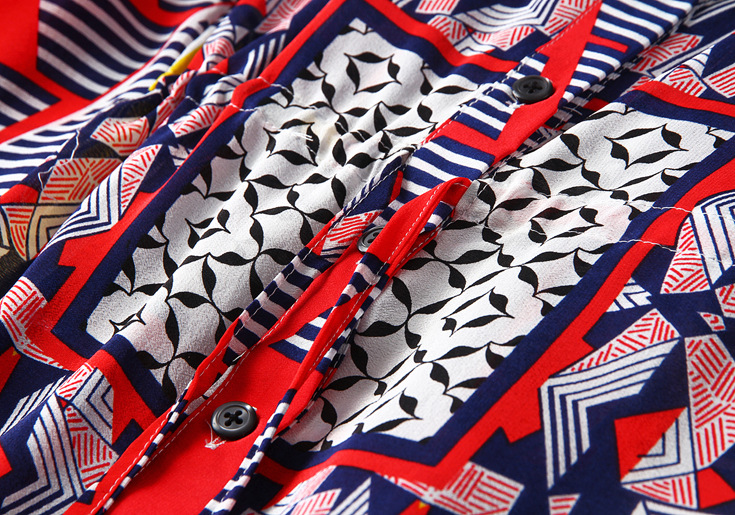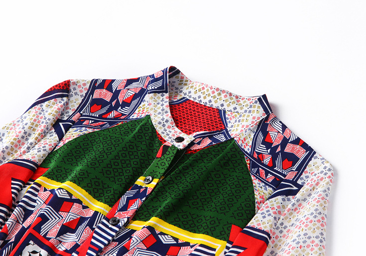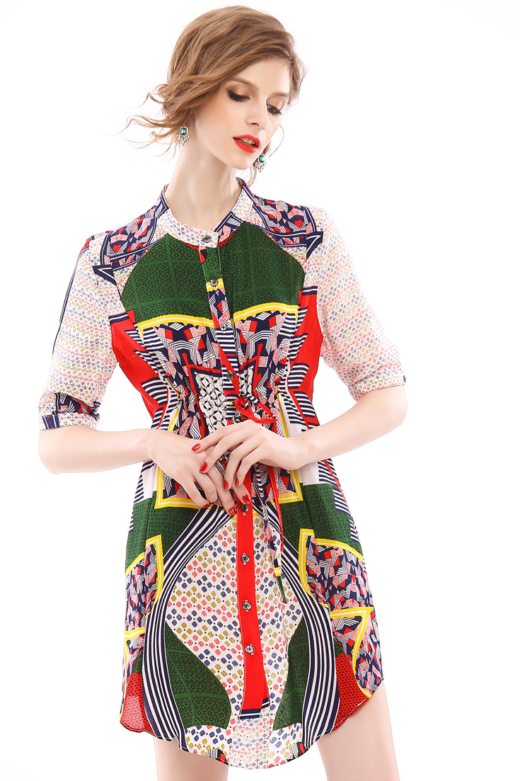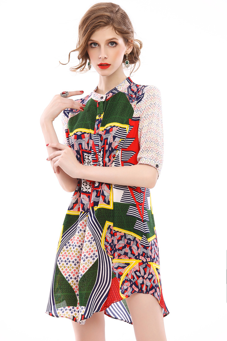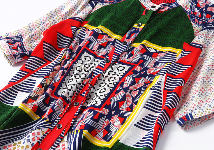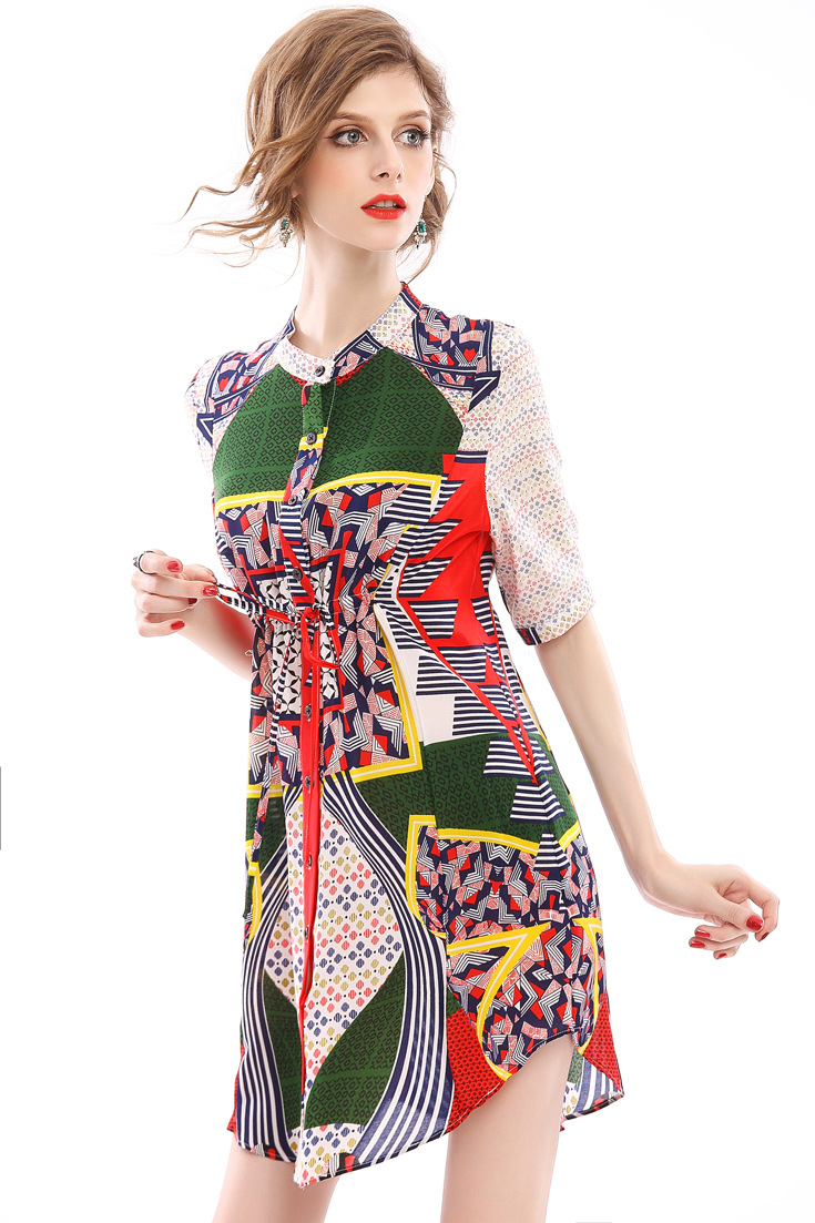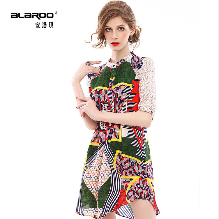 2015春夏季新款欧美风印花真丝连衣裙七分袖衬衣领时尚A字裙