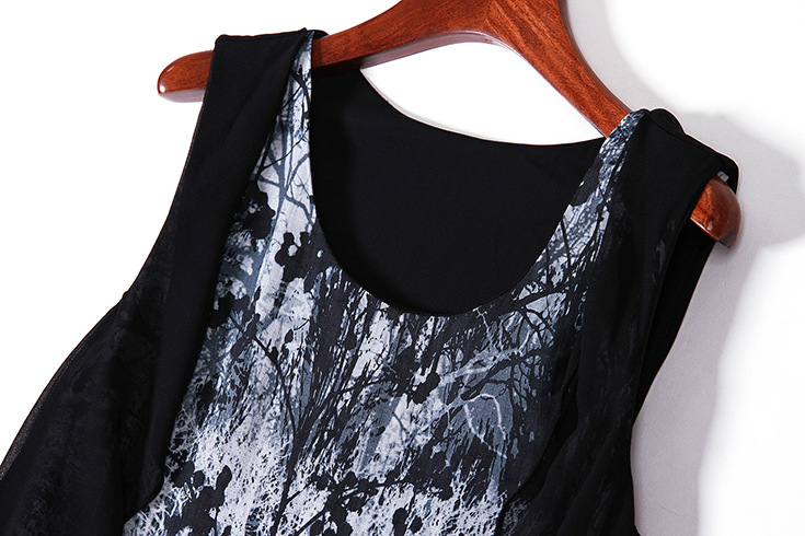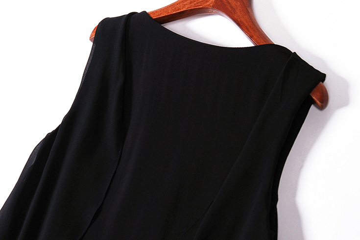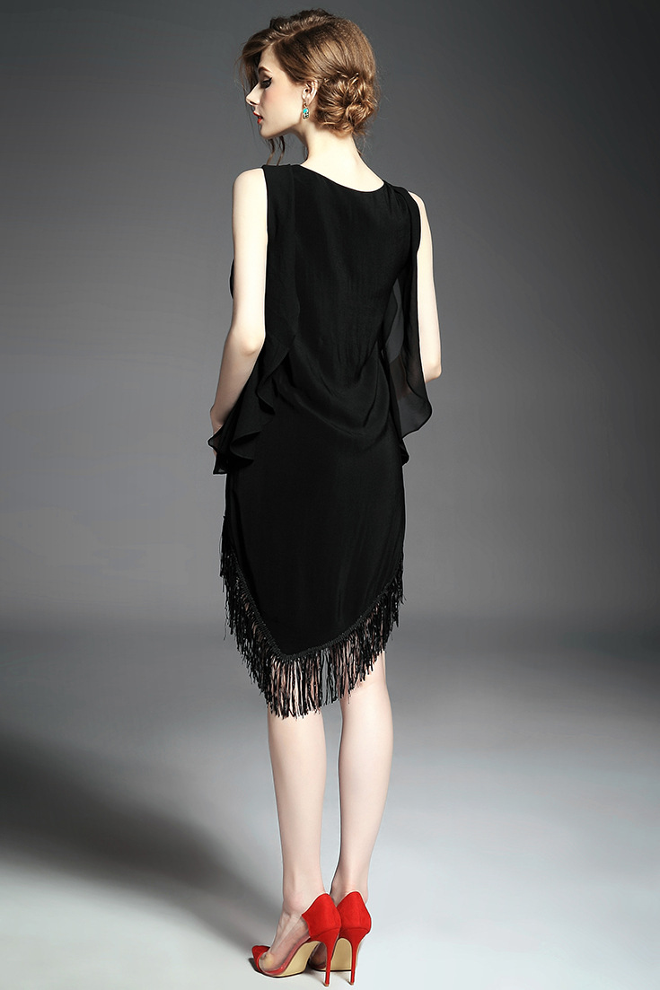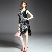 > 2015欧美女装夏新品圆领荷叶边拼接下摆流苏不规则气质无袖连衣裙