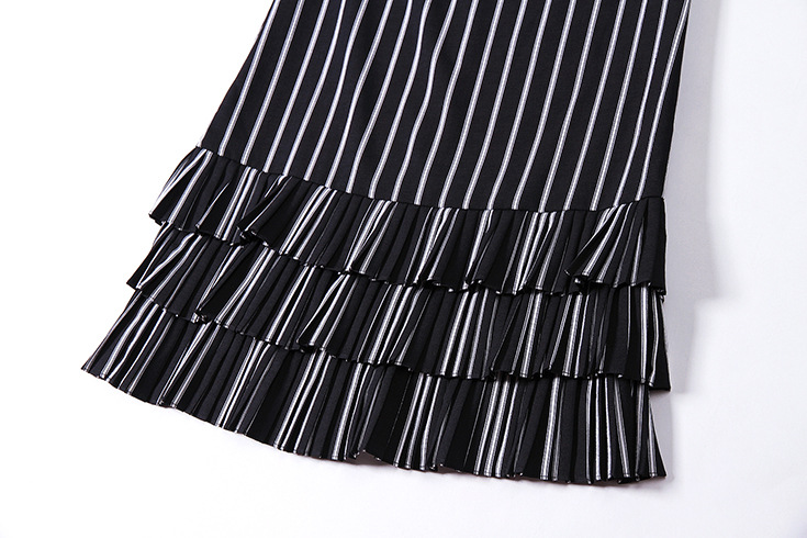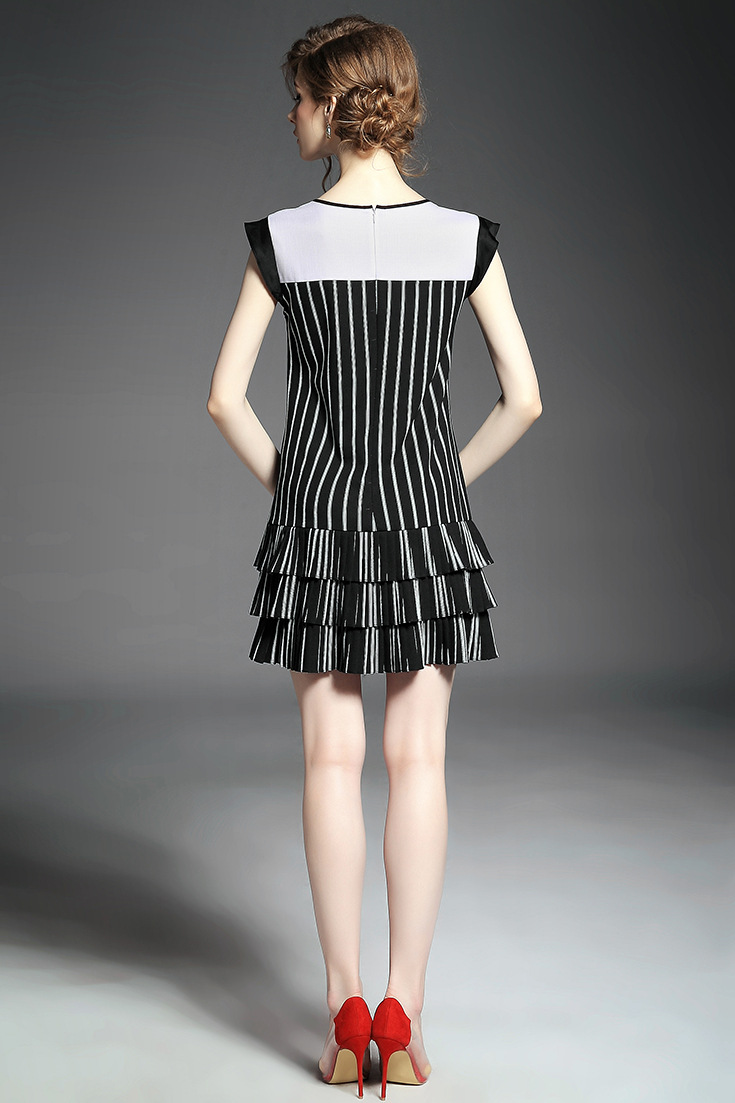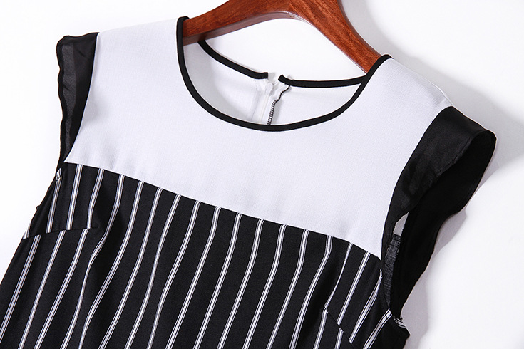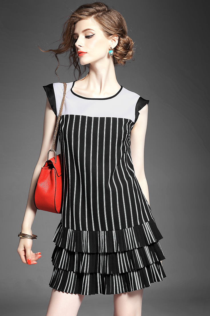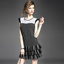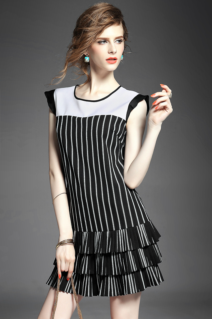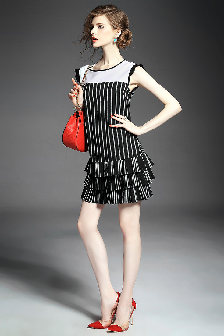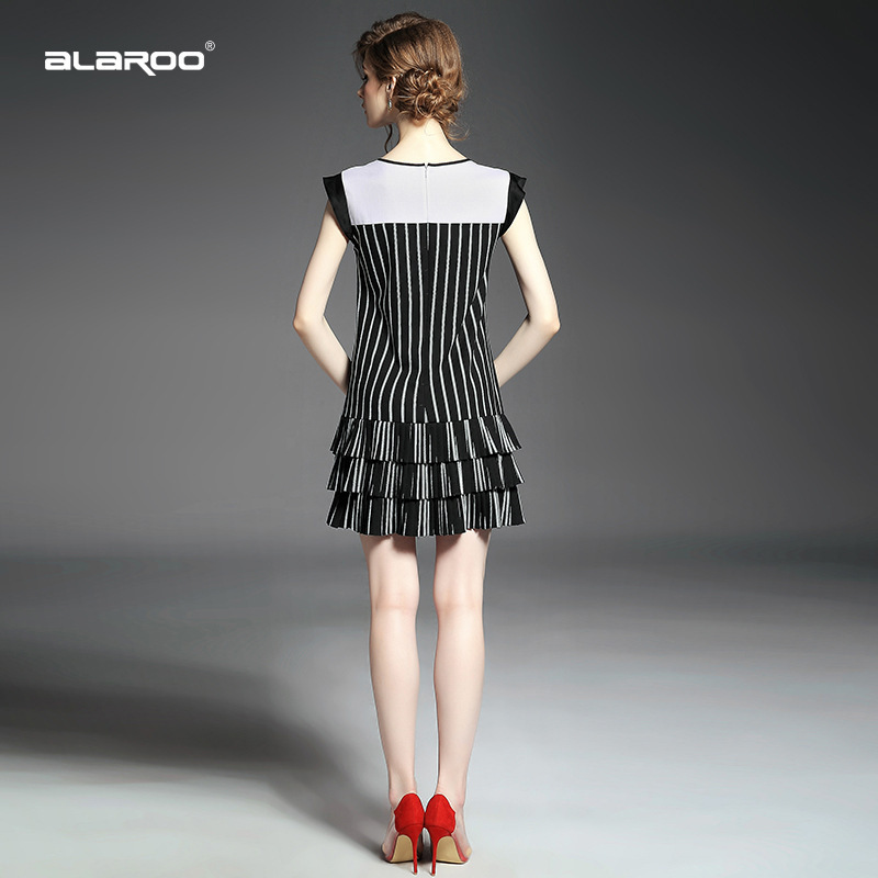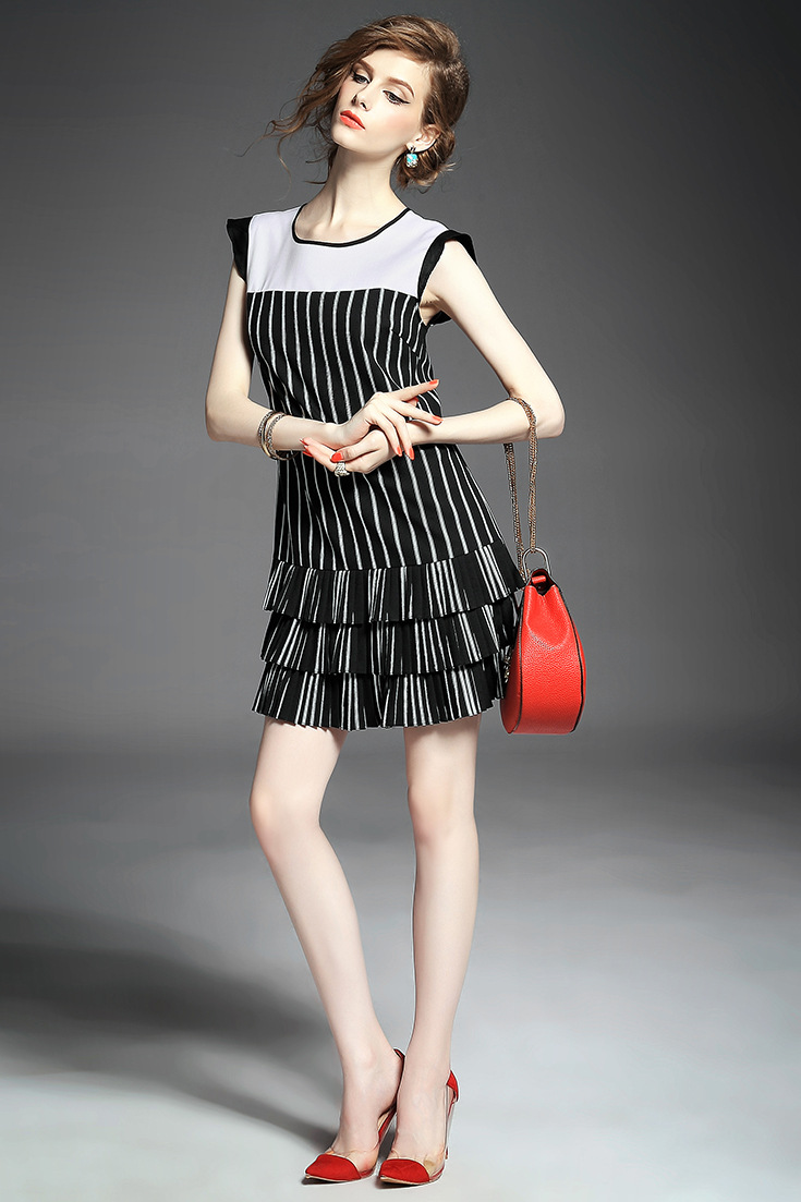> 2015夏季女装 欧美圆领无袖竖条纹下摆压褶拼接修身显瘦连衣裙子