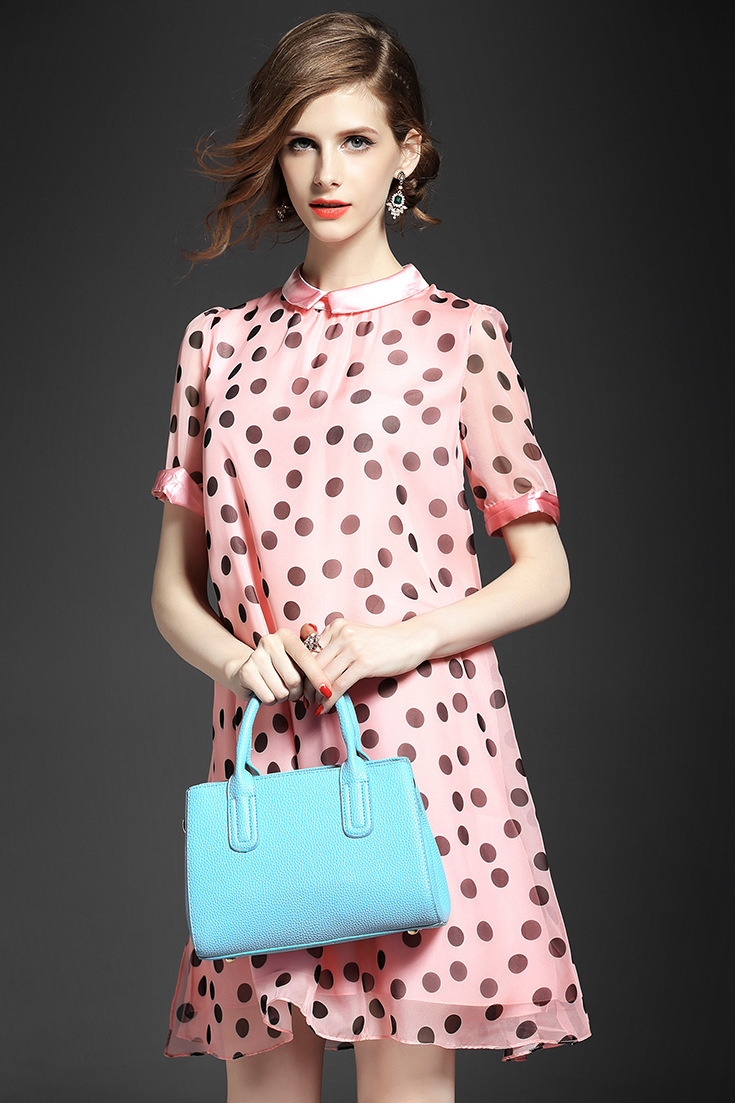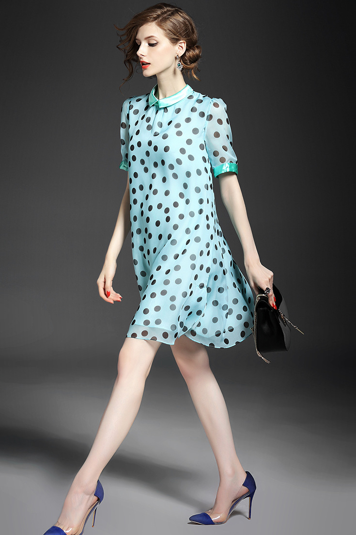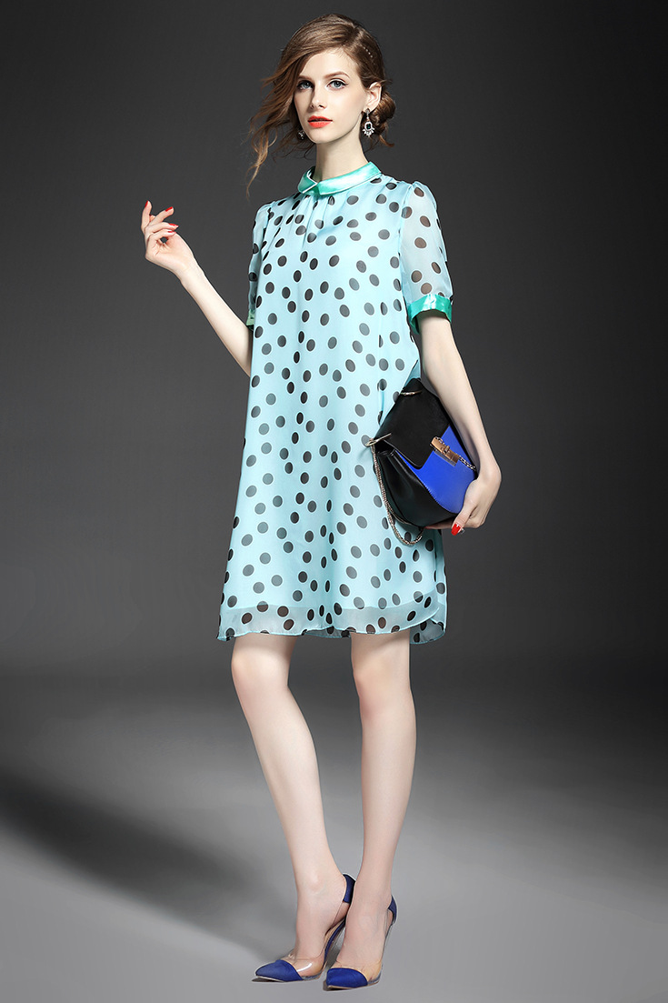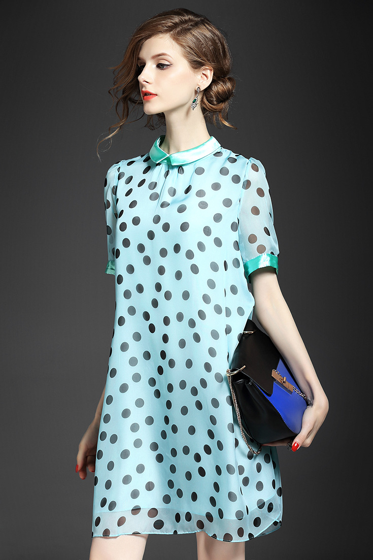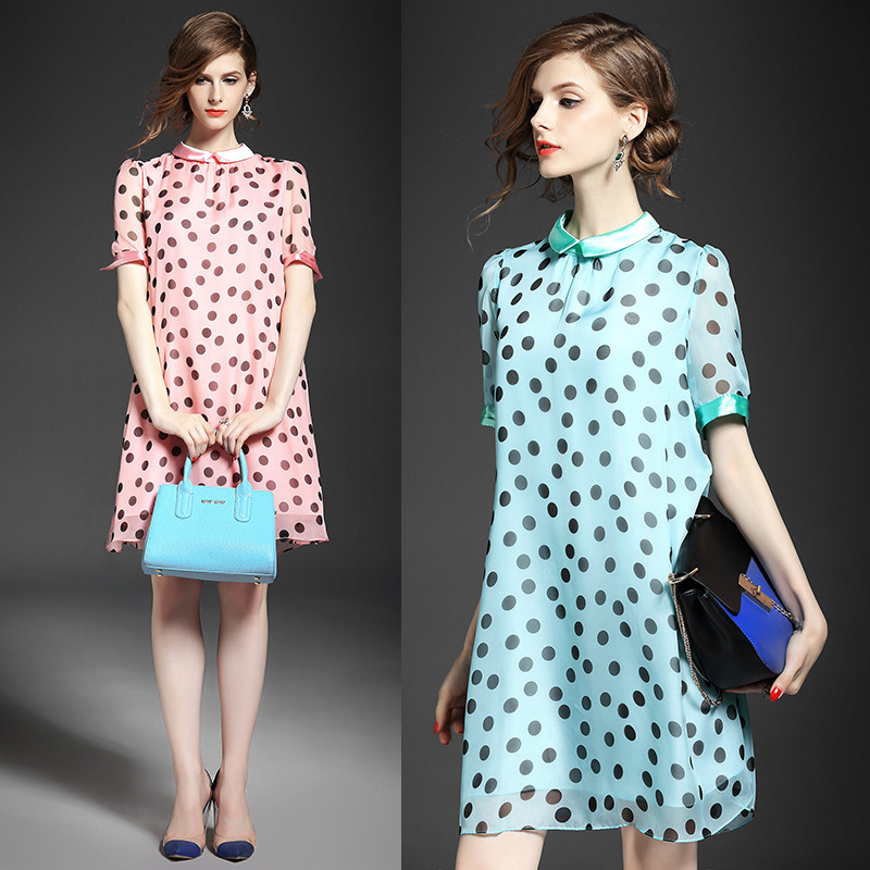 2015夏季女装 甜美气质小翻领波点印花宽松大摆连衣裙