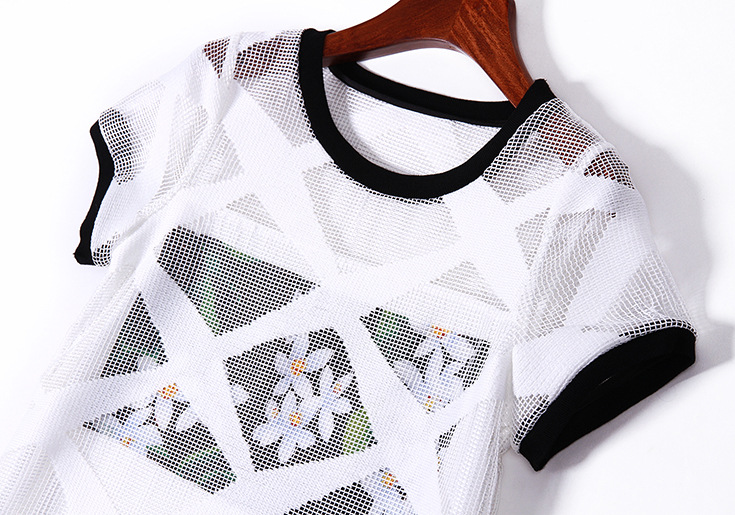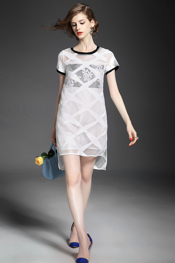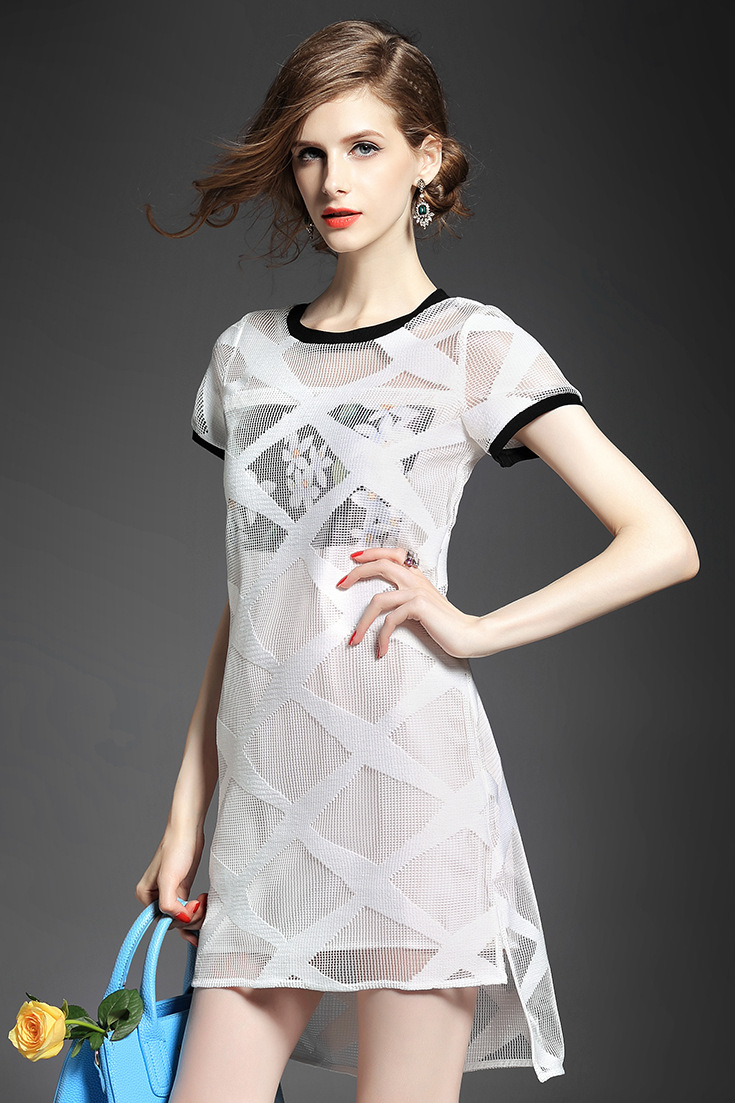 2015夏季女装新款时尚圆领前短后长网纱假两件拼接印花修身连衣裙