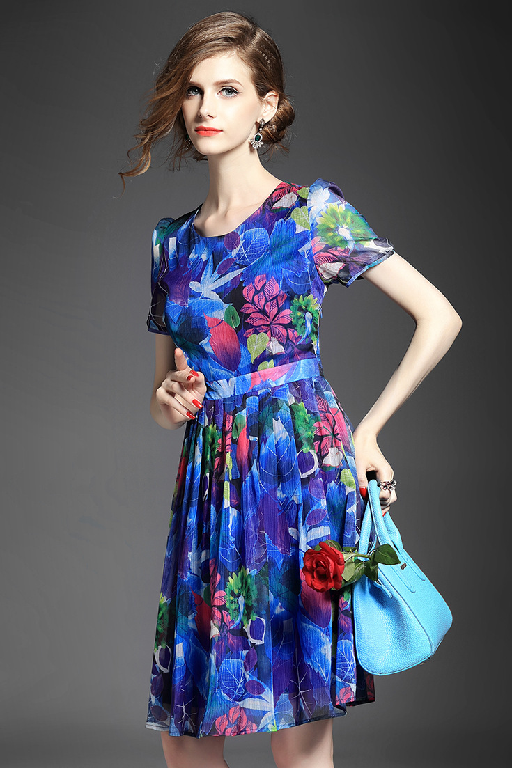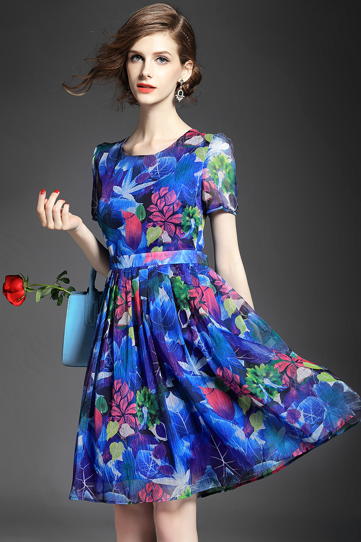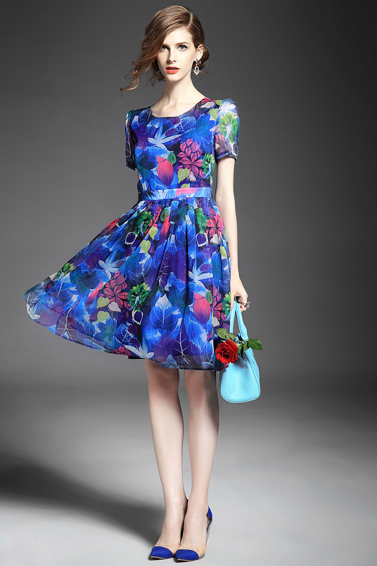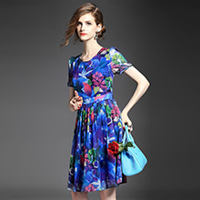 > 2015夏季新款女装 圆领气质印花收腰修身a字裙品质精品