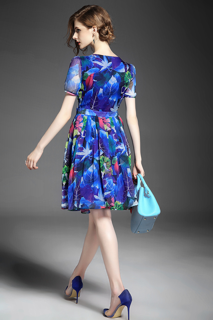2015夏季新款女装 圆领气质印花收腰修身a字裙品质精品