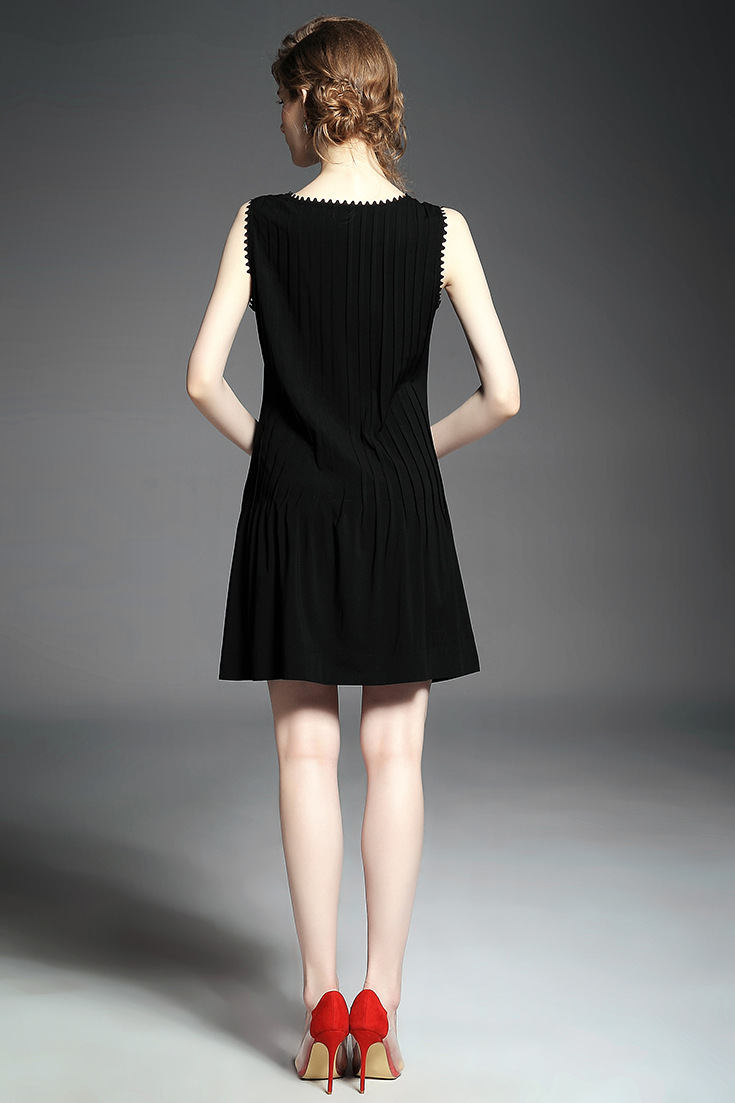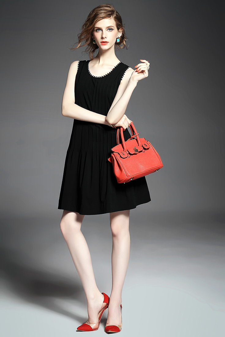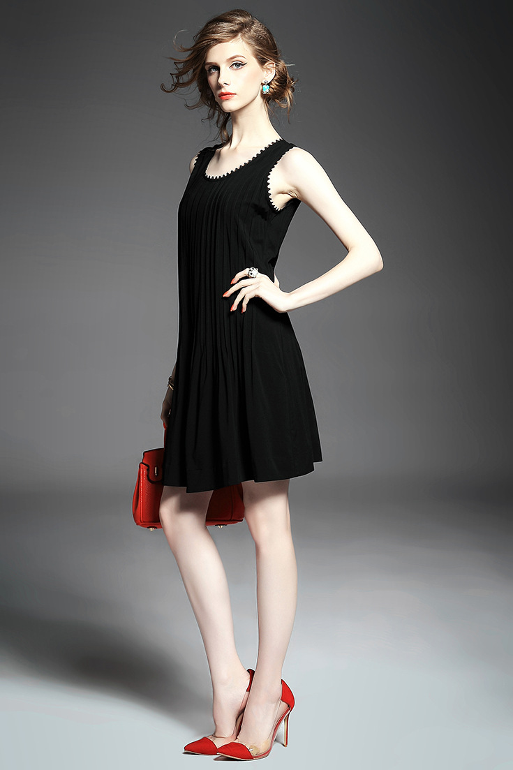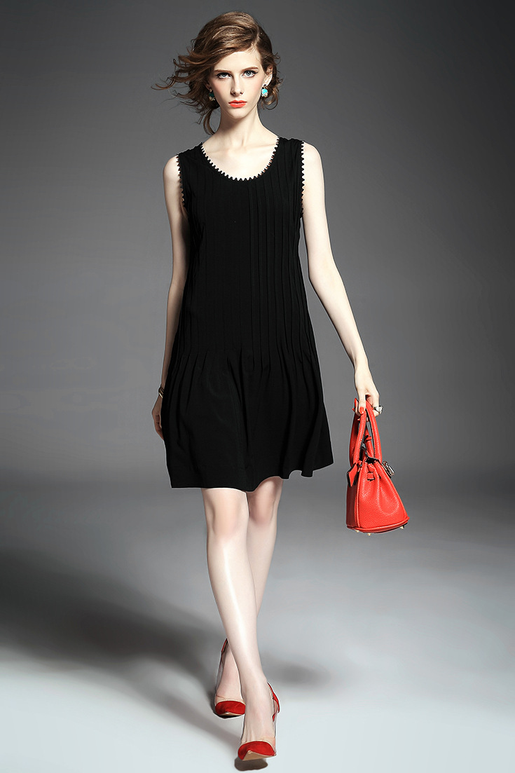 > 2015欧美大牌纯色压褶弹力修身小黑裙无袖连衣裙
