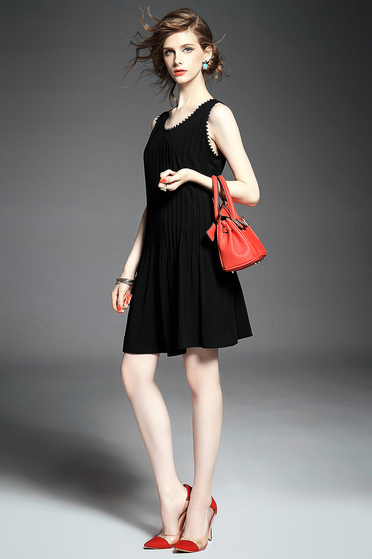 2015欧美大牌纯色压褶弹力修身小黑裙无袖连衣裙
