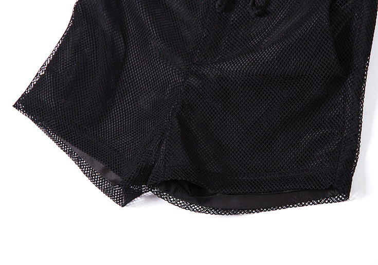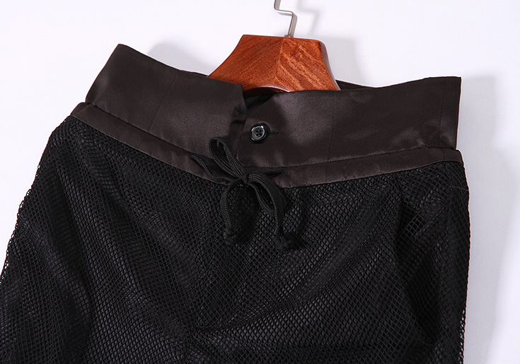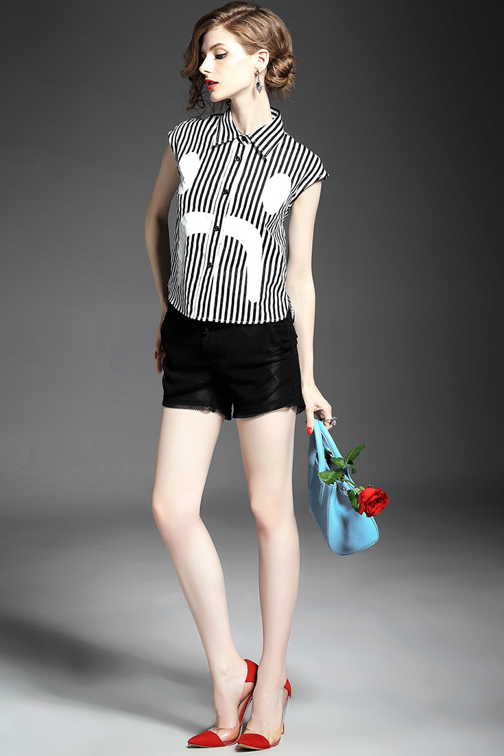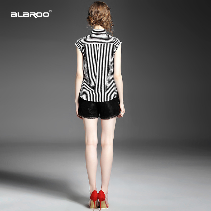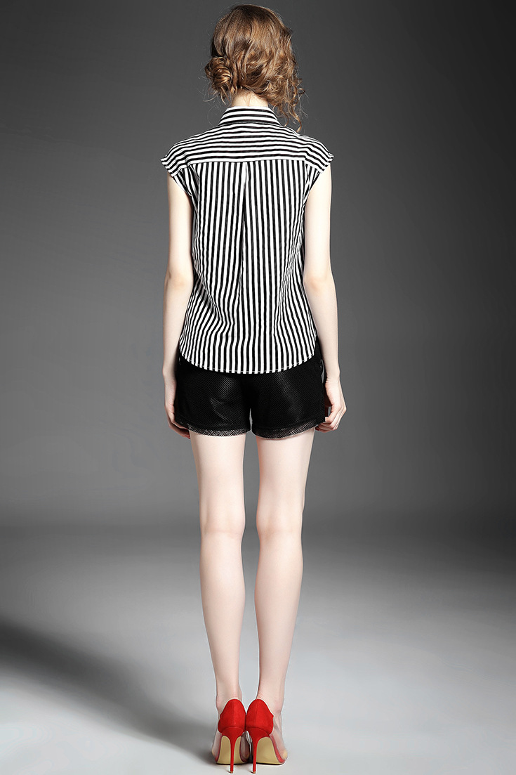 > 2015夏季女装新款 翻领黑白竖条纹无袖衬衣+网纱直筒短裤套装