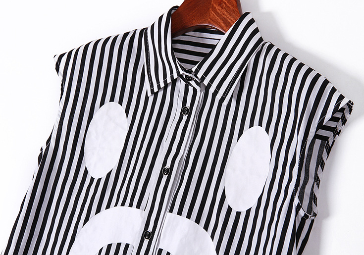 2015夏季女装新款 翻领黑白竖条纹无袖衬衣+网纱直筒短裤套装