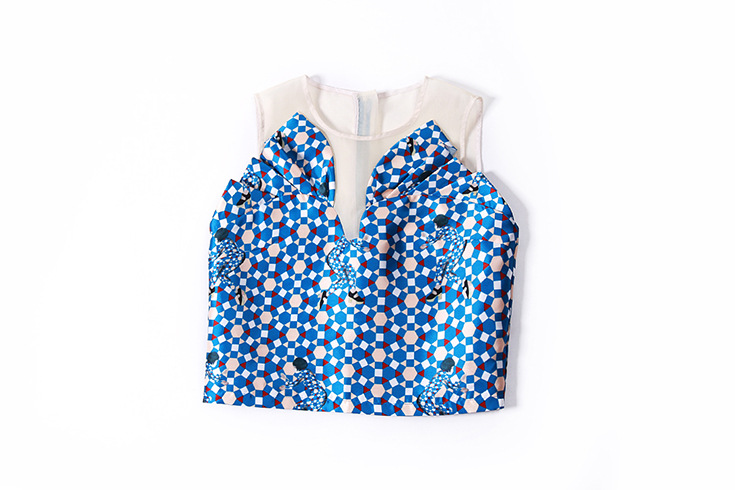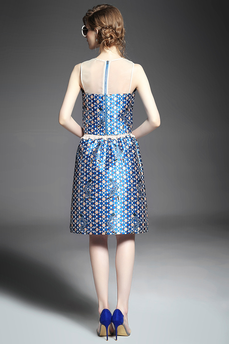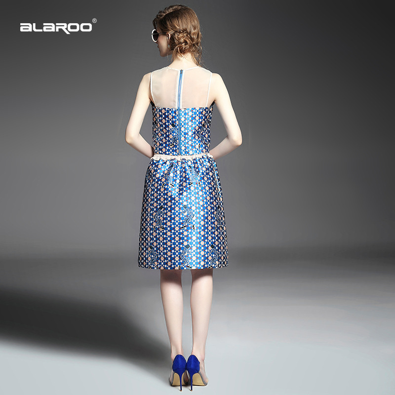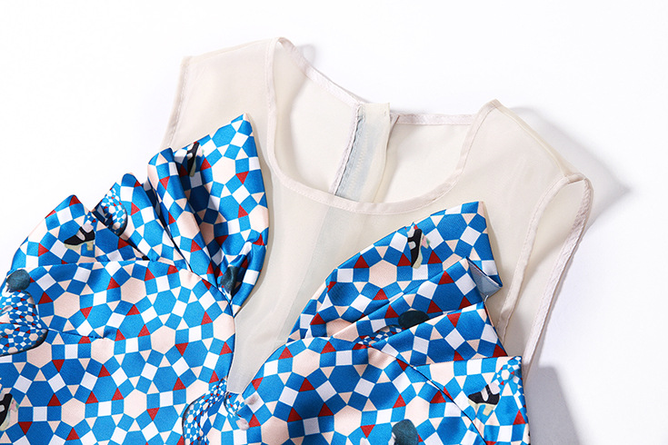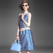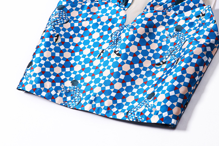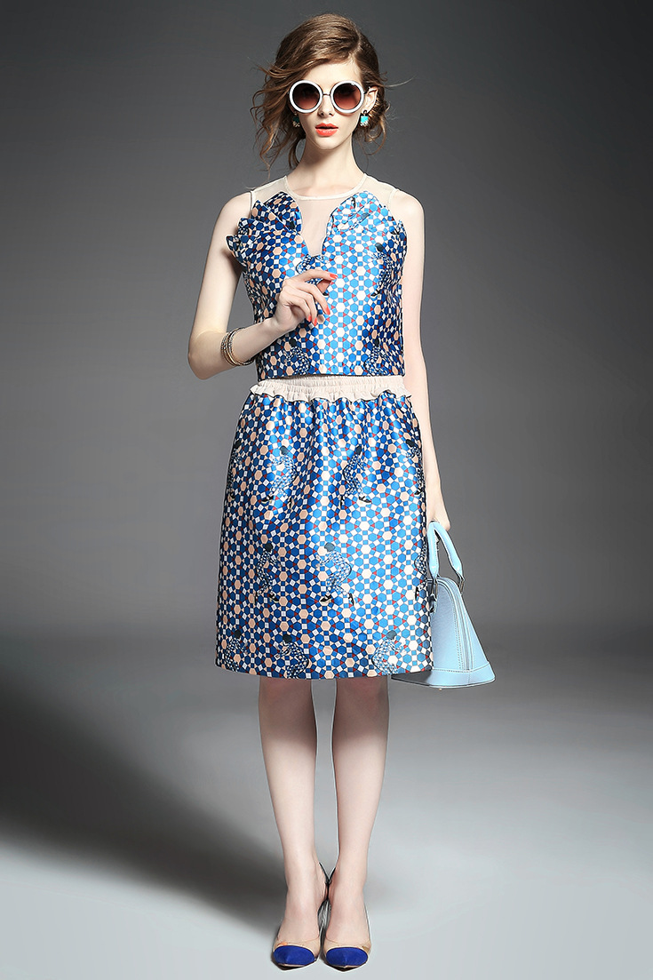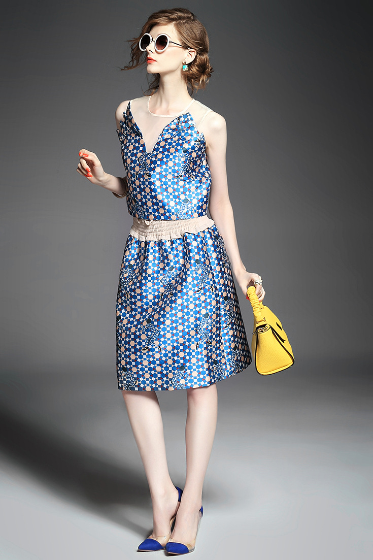 > 2015 欧美时尚圆领无袖拼接印花短上衣+压褶弹力收腰半身裙套装
