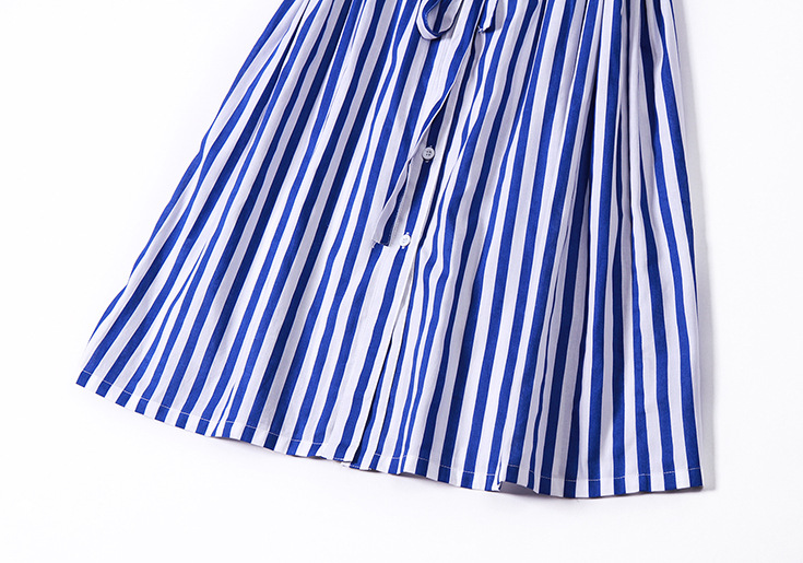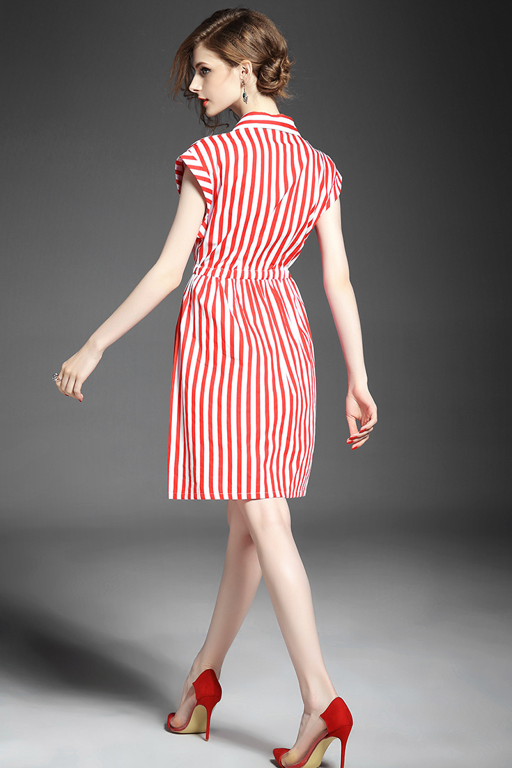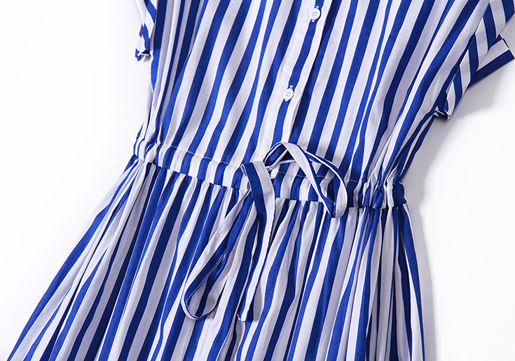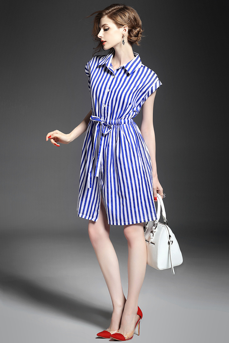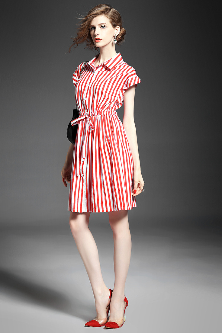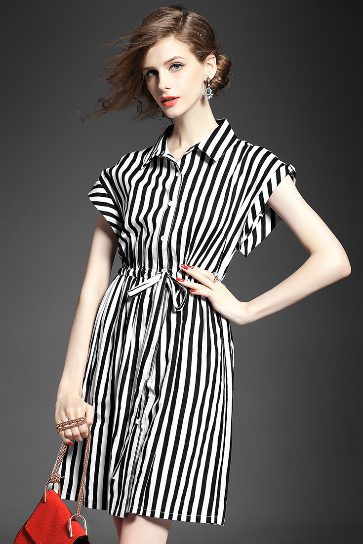 2015夏季新款 时尚翻领竖条纹显瘦修身系带连衣裙