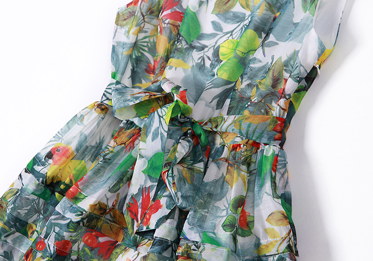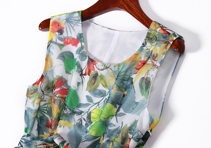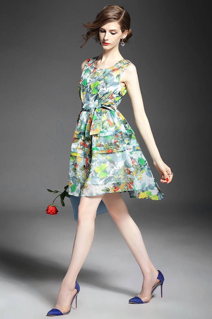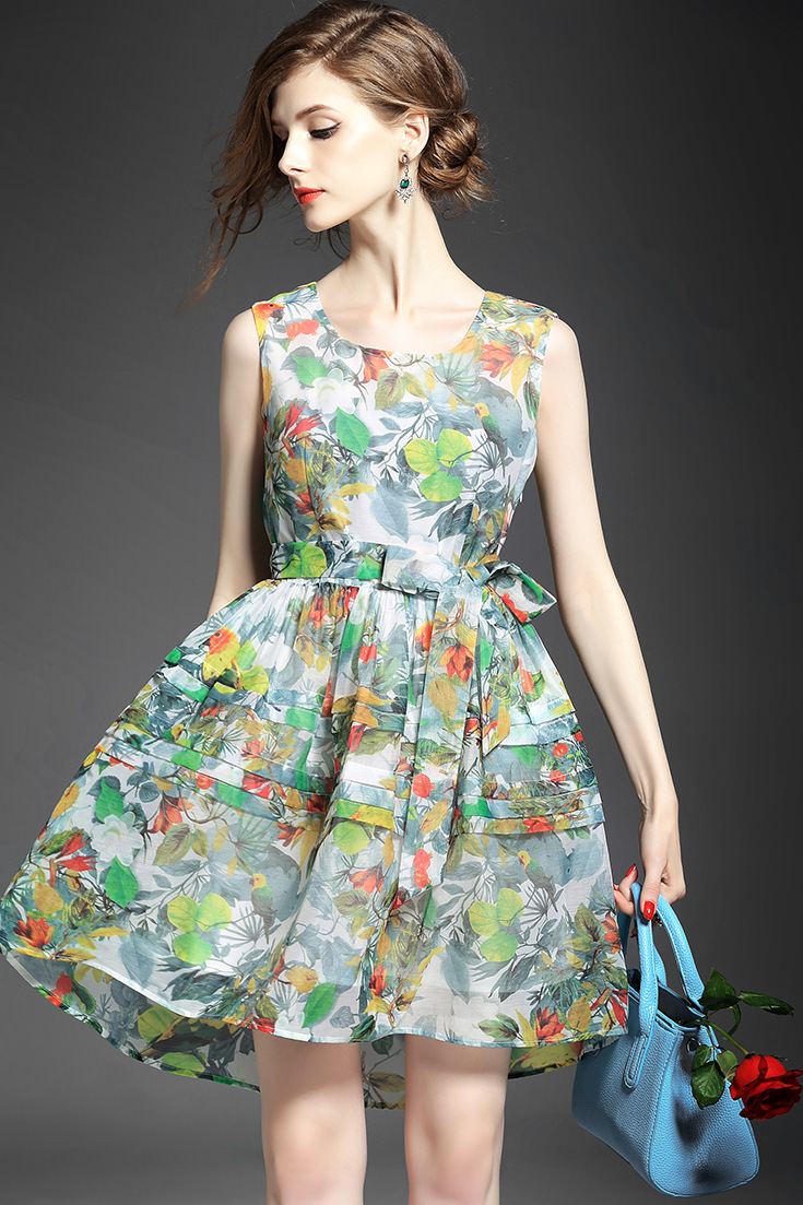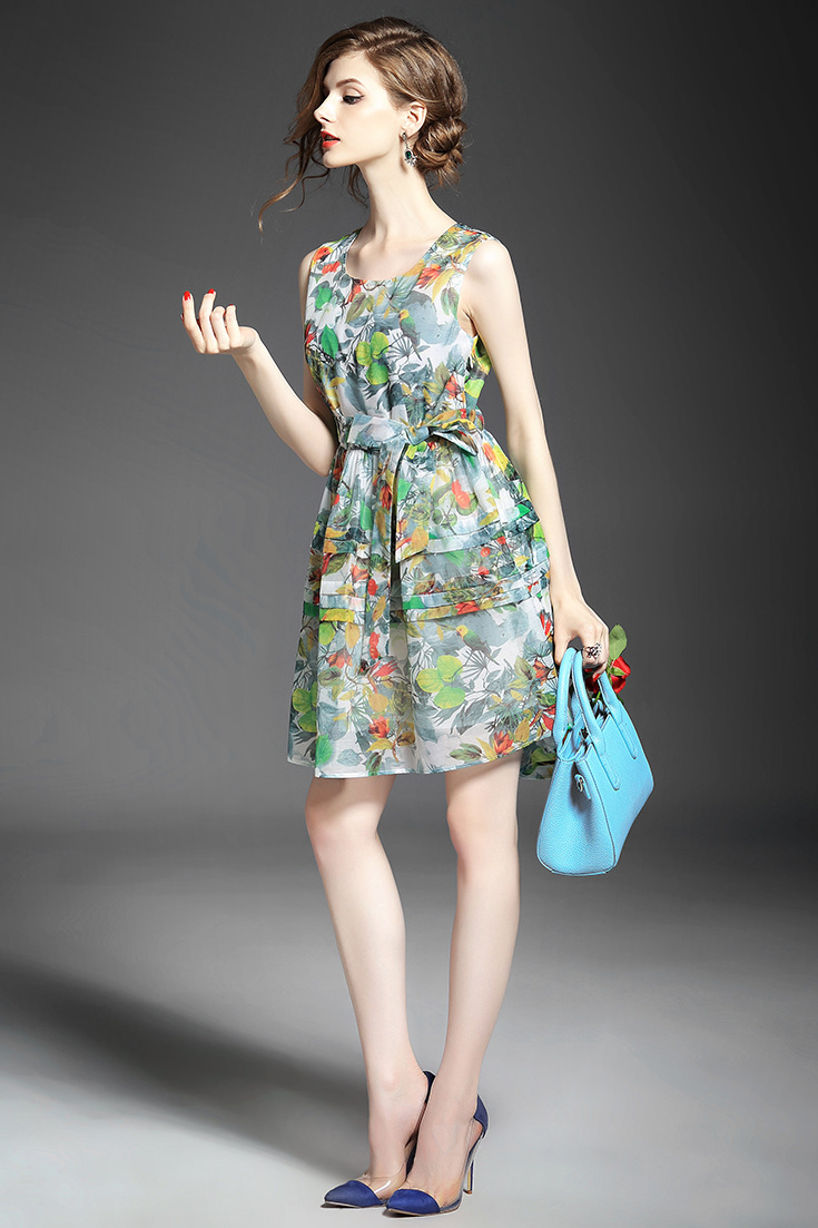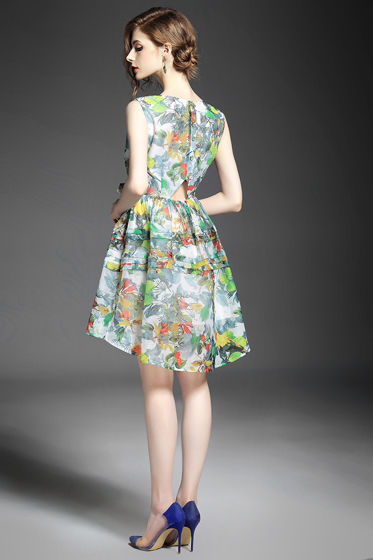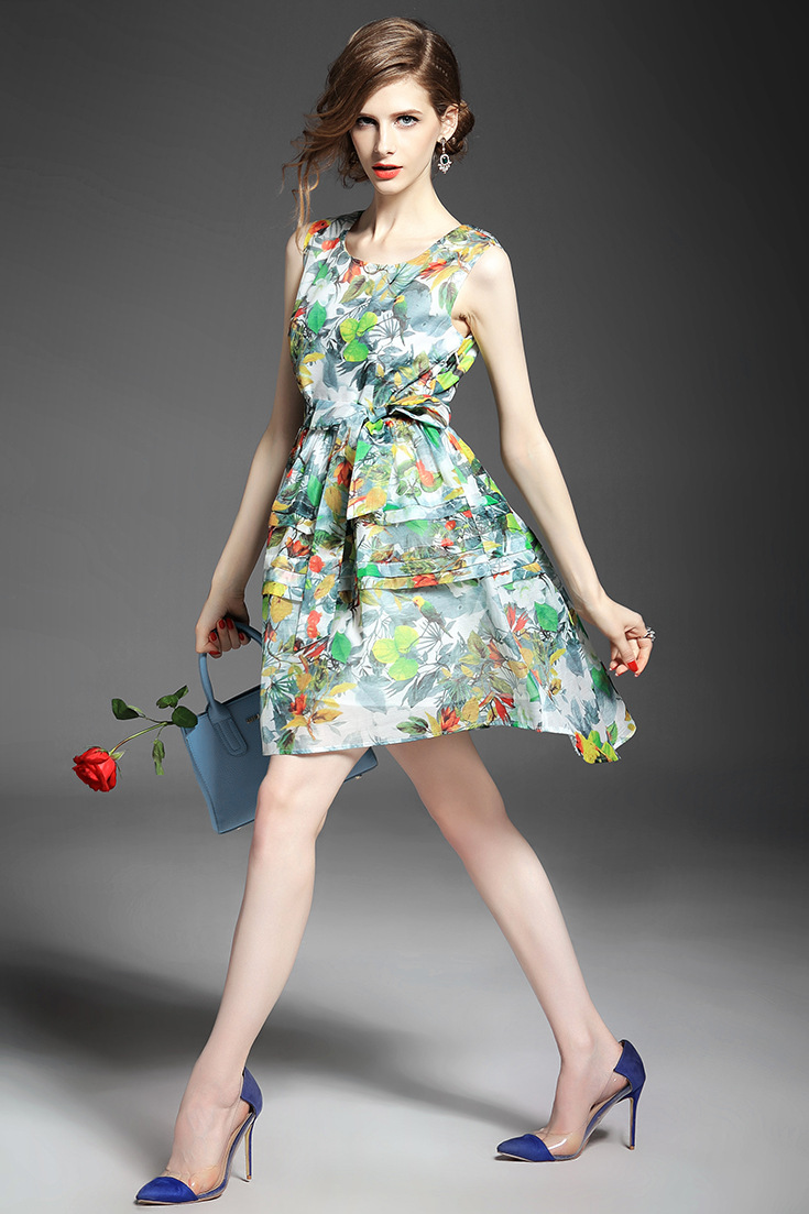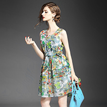 > 2015夏季女装 欧美时尚无袖圆领系带露背碎花大摆压褶修身a字裙